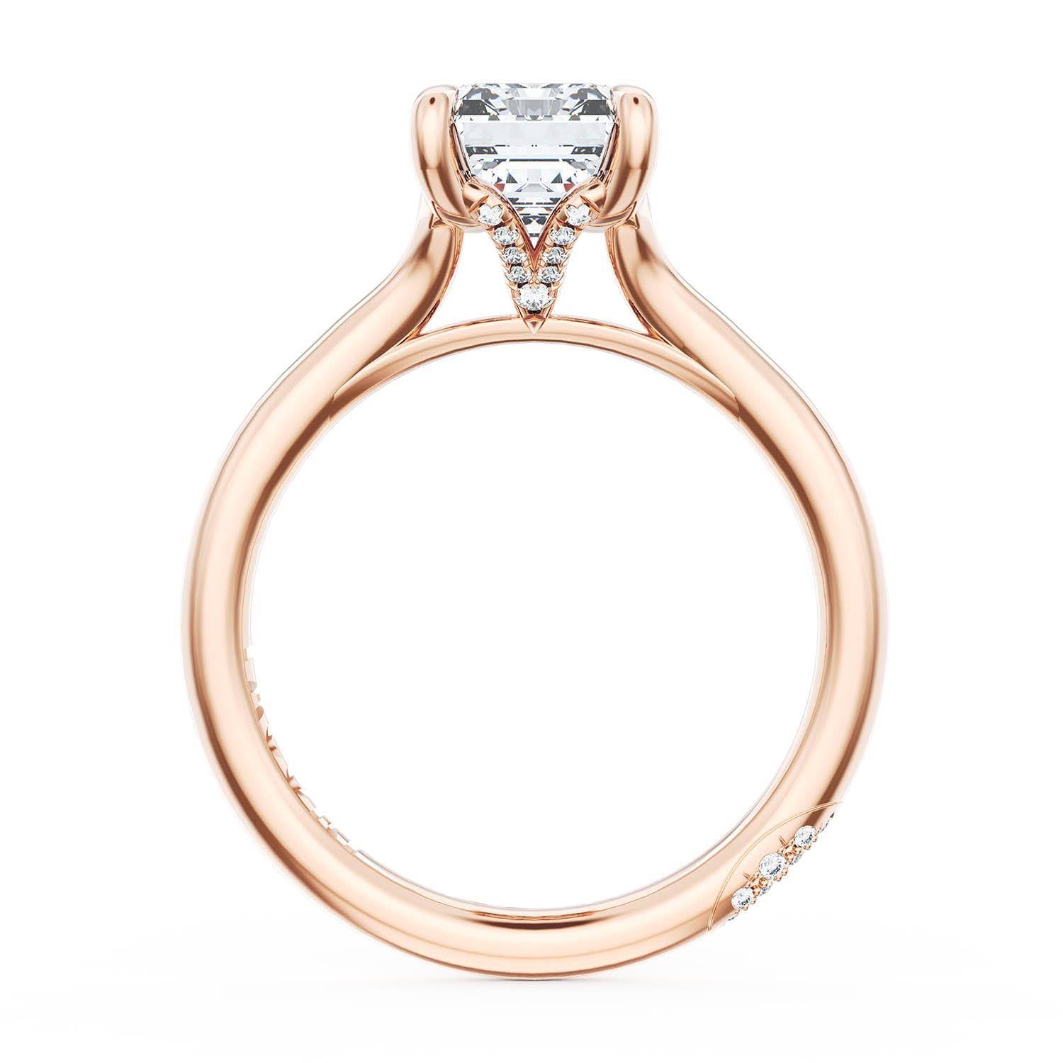 A Radiant Solitaire is set into a unique corset-inspired crown on a high-polish 18kt Rose Gold foundation. A diamond-studded Founder's Crescent marks the resting point.