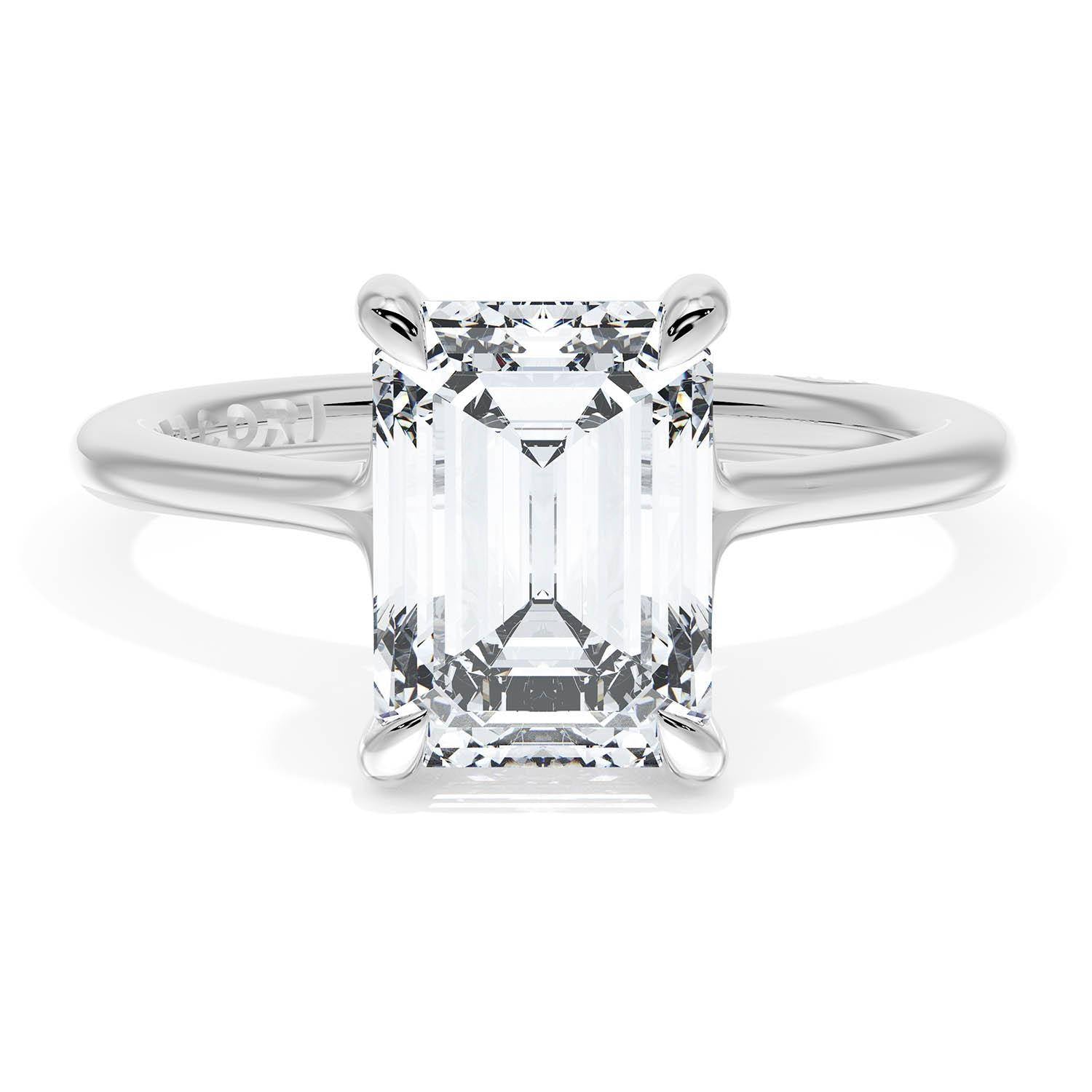 An Emerald solitaire is elevated by a modern bloom of round brilliant diamonds, and set into a high-polish 18kt Yellow Gold foundation. TACORI Crescents add hidden detail to the underside of the crown.