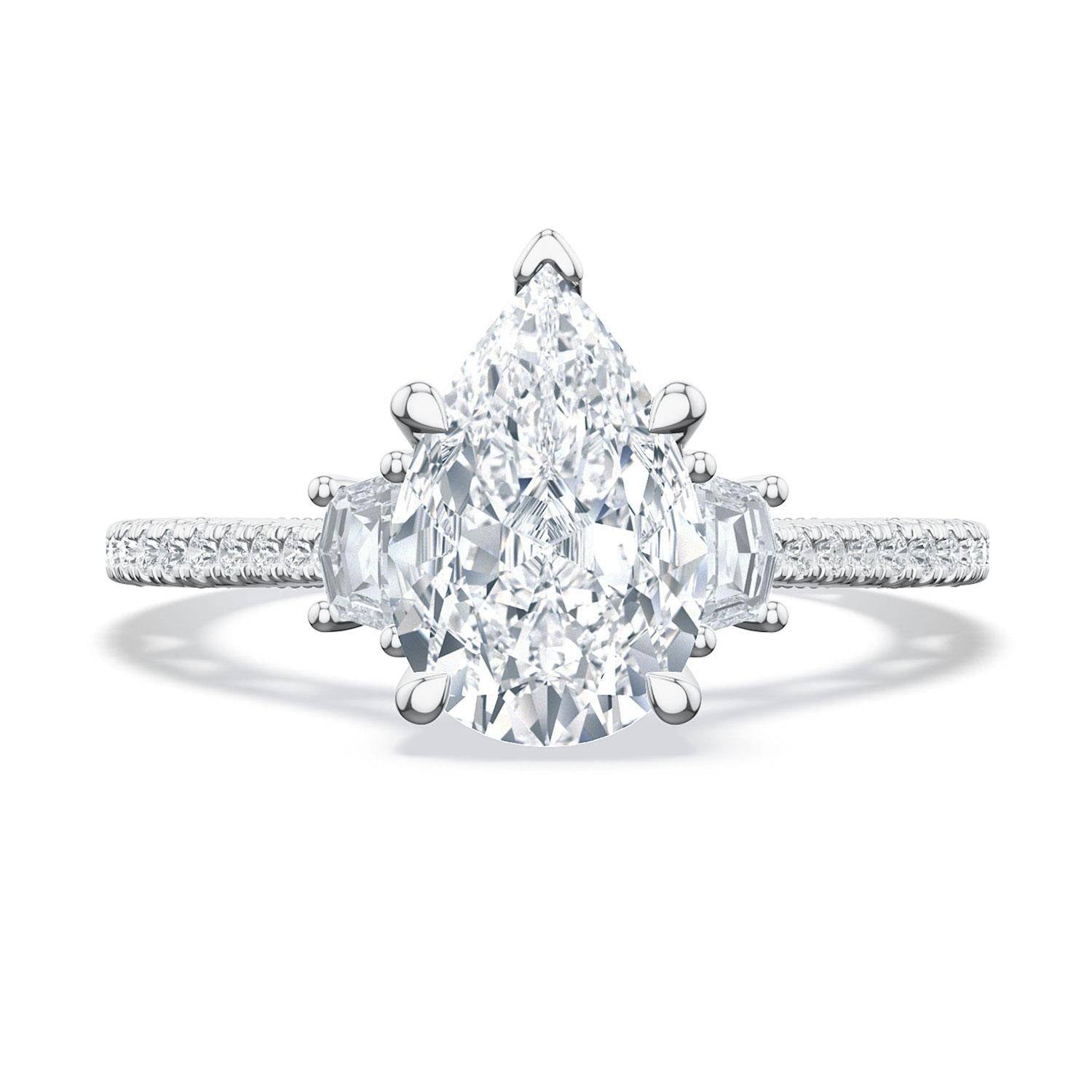 A Pear Solitaire is set into an 18kt White Gold foundation. Masterfully set round brilliant diamonds trace up the ceiling and hand-hewn beading adds texture to the silhouette.