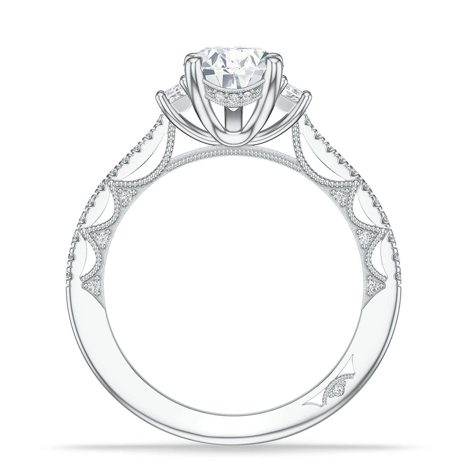 Milgrain-edged Crescents create radiant windows of light, while round-brilliant diamonds at each Crescent junction are hand-set with triple beading. A pave ceiling leads towards the three-stone crown with a hidden bloom.
