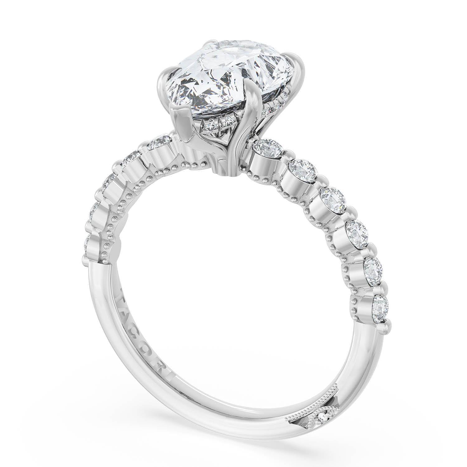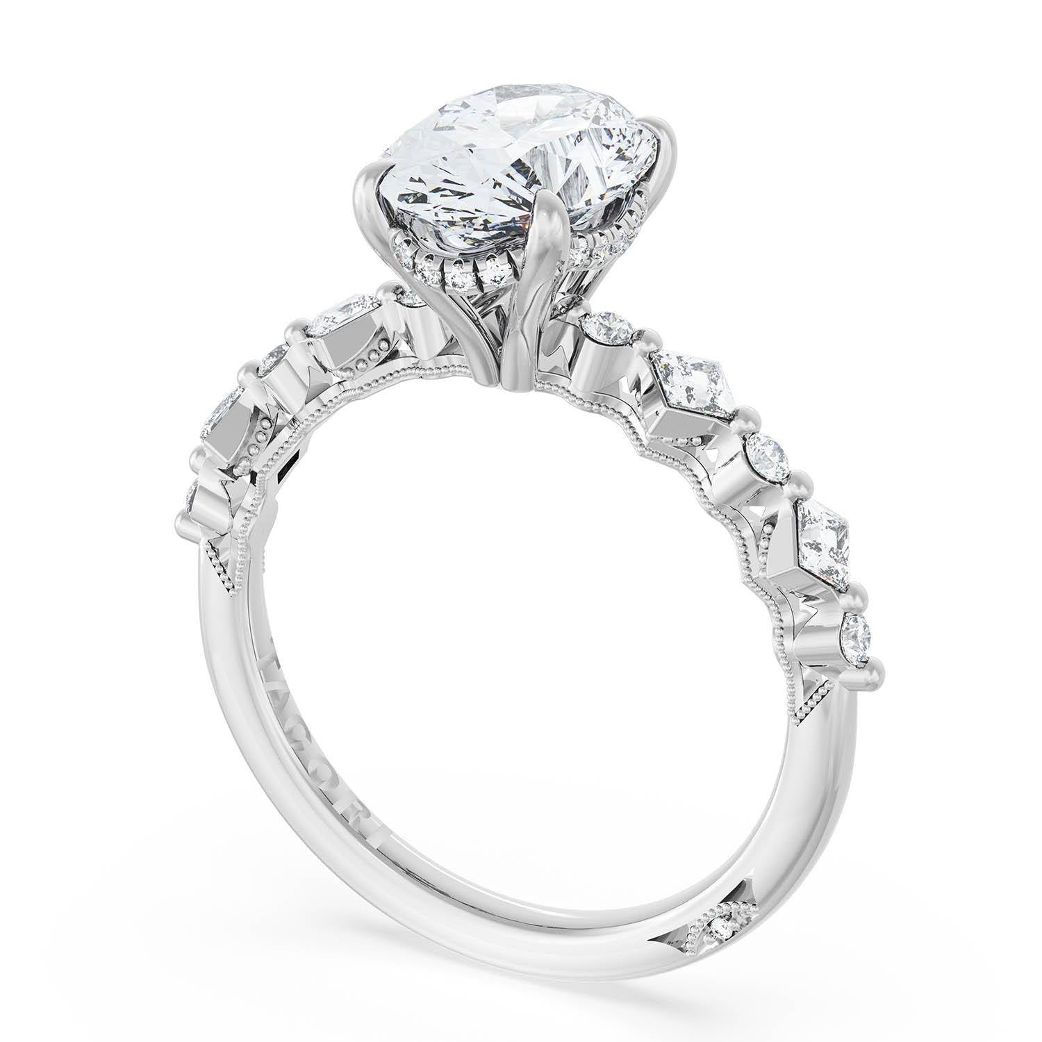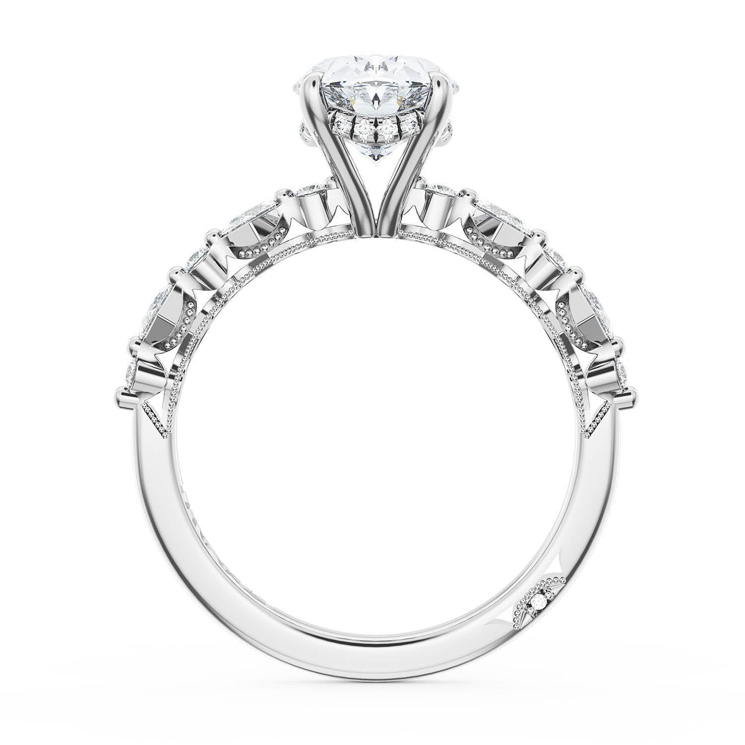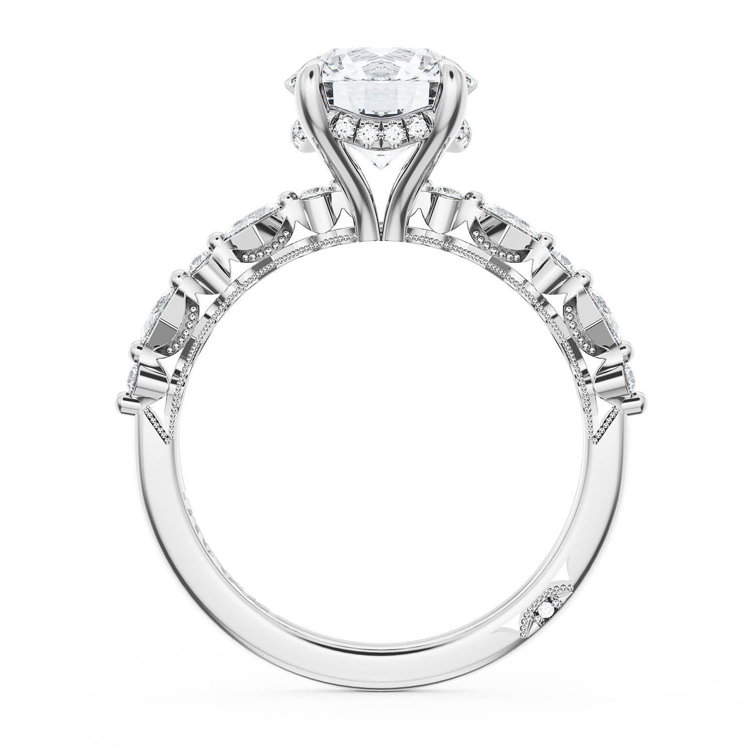 An Oval Solitaire is set into an 18kt White Gold foundation. Alternating carré and round brilliant diamonds trace up the ceiling and hand-hewn beading adds texture to the silhouette.