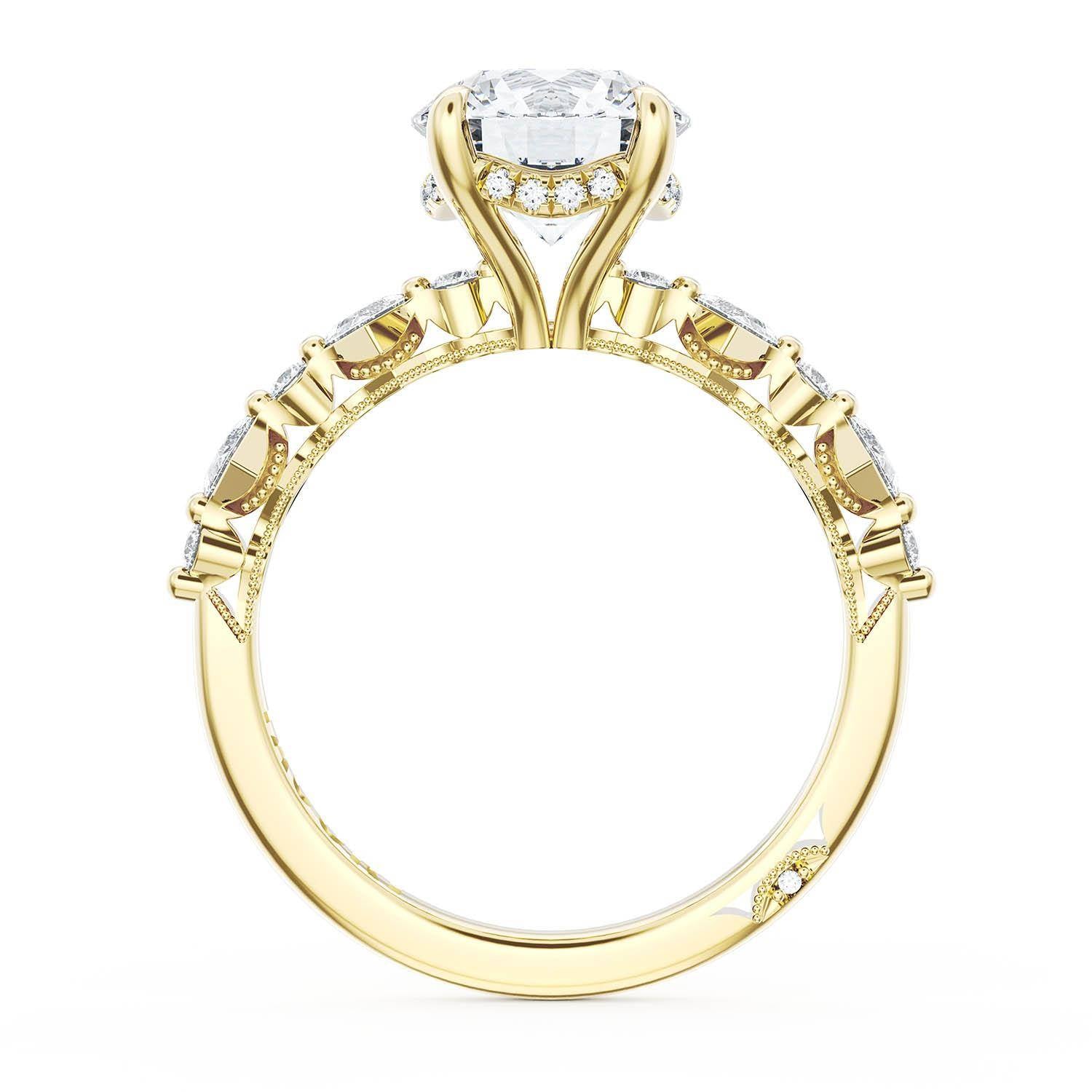 A Round Solitaire is set into an 18kt Yellow Gold foundation. Alternating carré and round brilliant diamonds trace up the ceiling and hand-hewn beading adds texture to the silhouette.