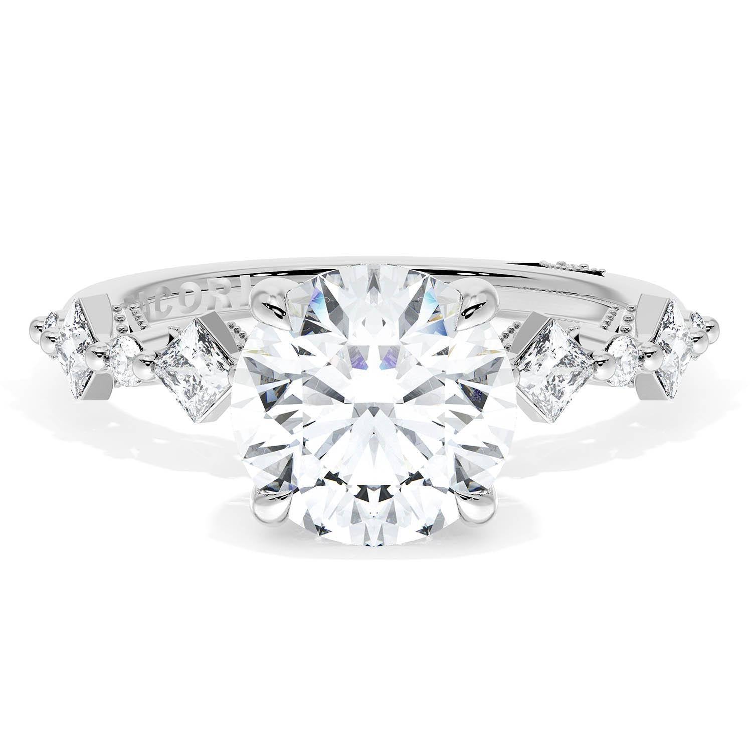 A Round Solitaire is set into an 18kt White Gold foundation. Alternating carré and round brilliant diamonds trace up the ceiling and hand-hewn beading adds texture to the silhouette.