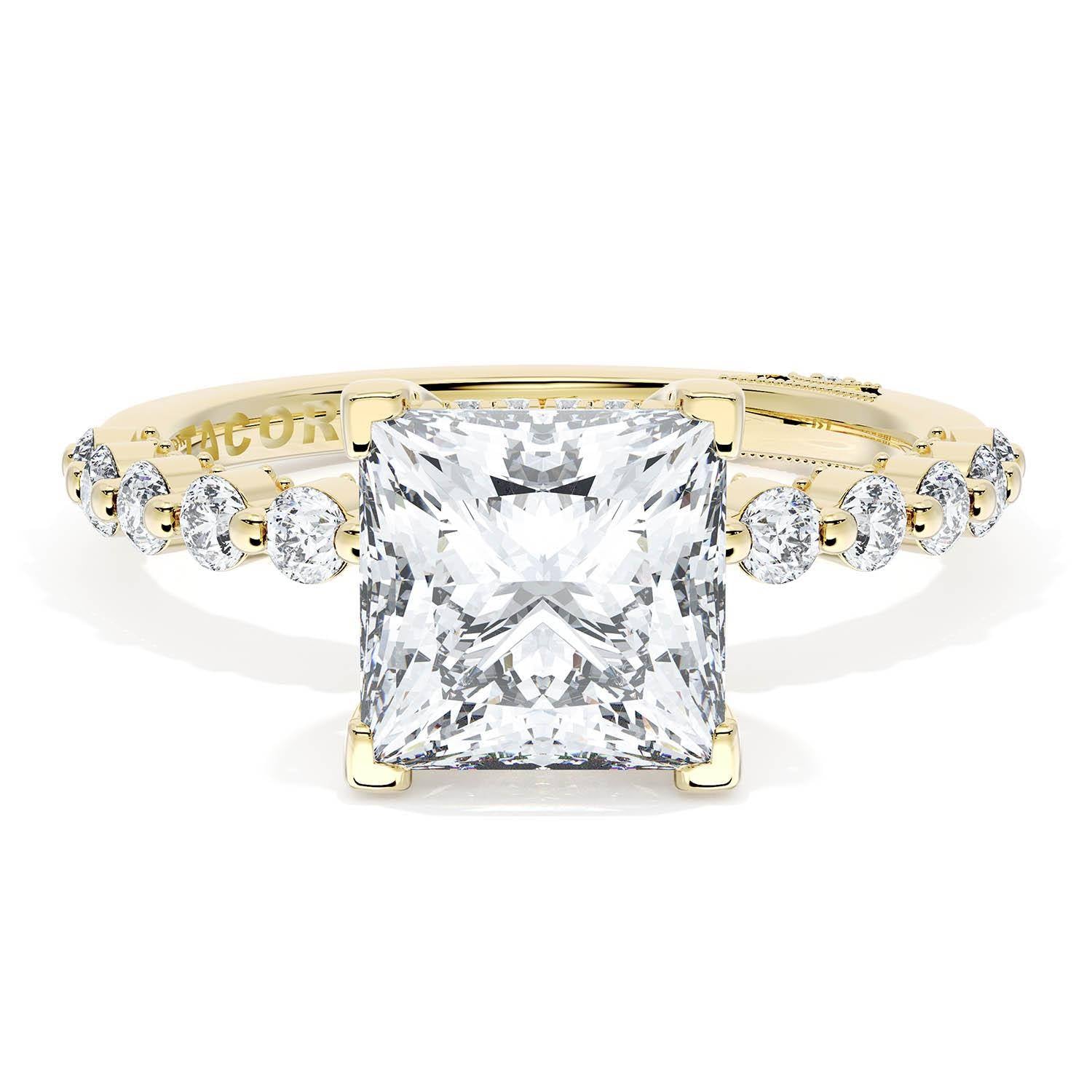 A Princess Solitaire is set into an 18kt Yellow Gold foundation. Masterfully set round brilliant diamonds trace up the ceiling and hand-hewn beading adds texture to the silhouette.