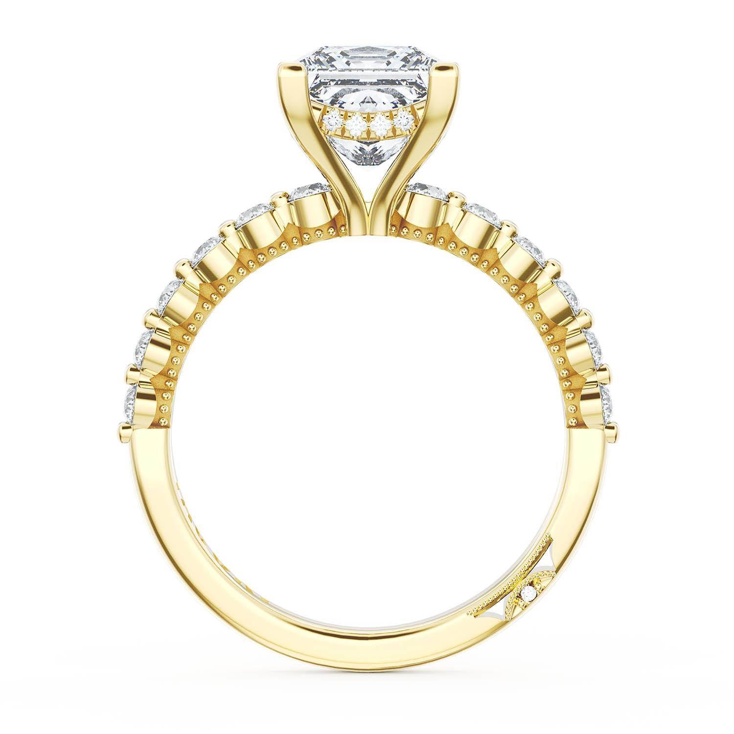 A Radiant Solitaire is set into an 18kt Yellow Gold foundation. Alternating carré and round brilliant diamonds trace up the ceiling and hand-hewn beading adds texture to the silhouette.