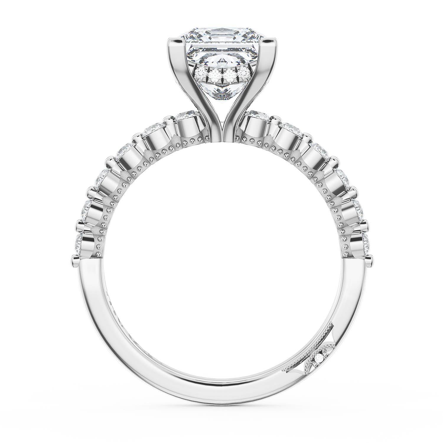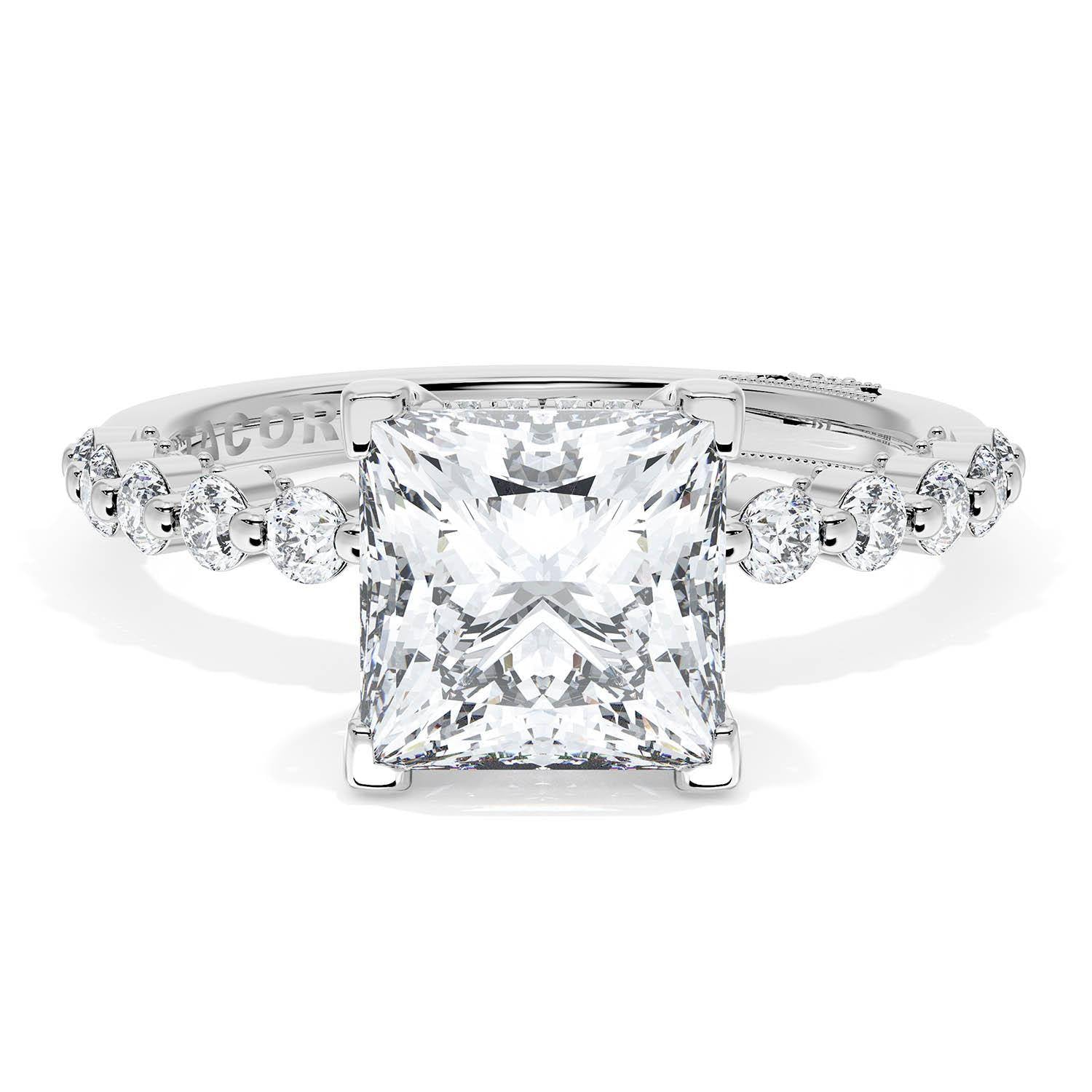 A Princess Solitaire is set into an 18kt White Gold foundation. Masterfully set round brilliant diamonds trace up the ceiling and hand-hewn beading adds texture to the silhouette.