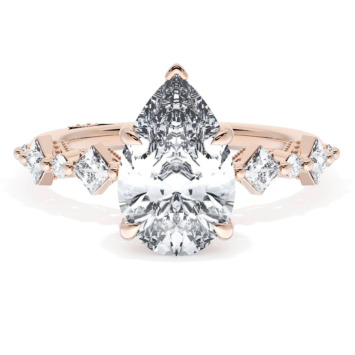 A Pear Solitaire is set into an 18kt Rose Gold foundation. Alternating carré and round brilliant diamonds trace up the ceiling and hand-hewn beading adds texture to the silhouette.