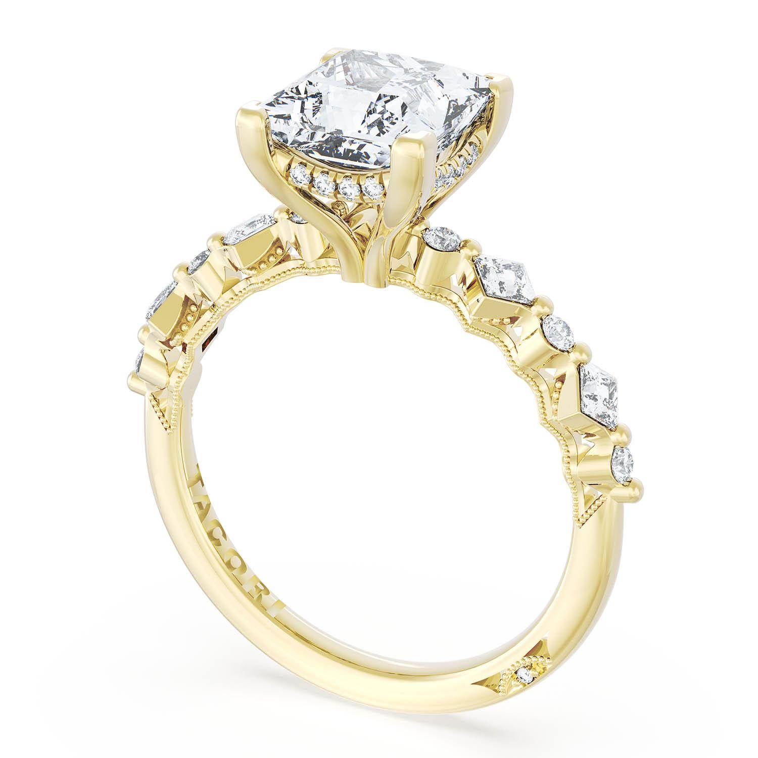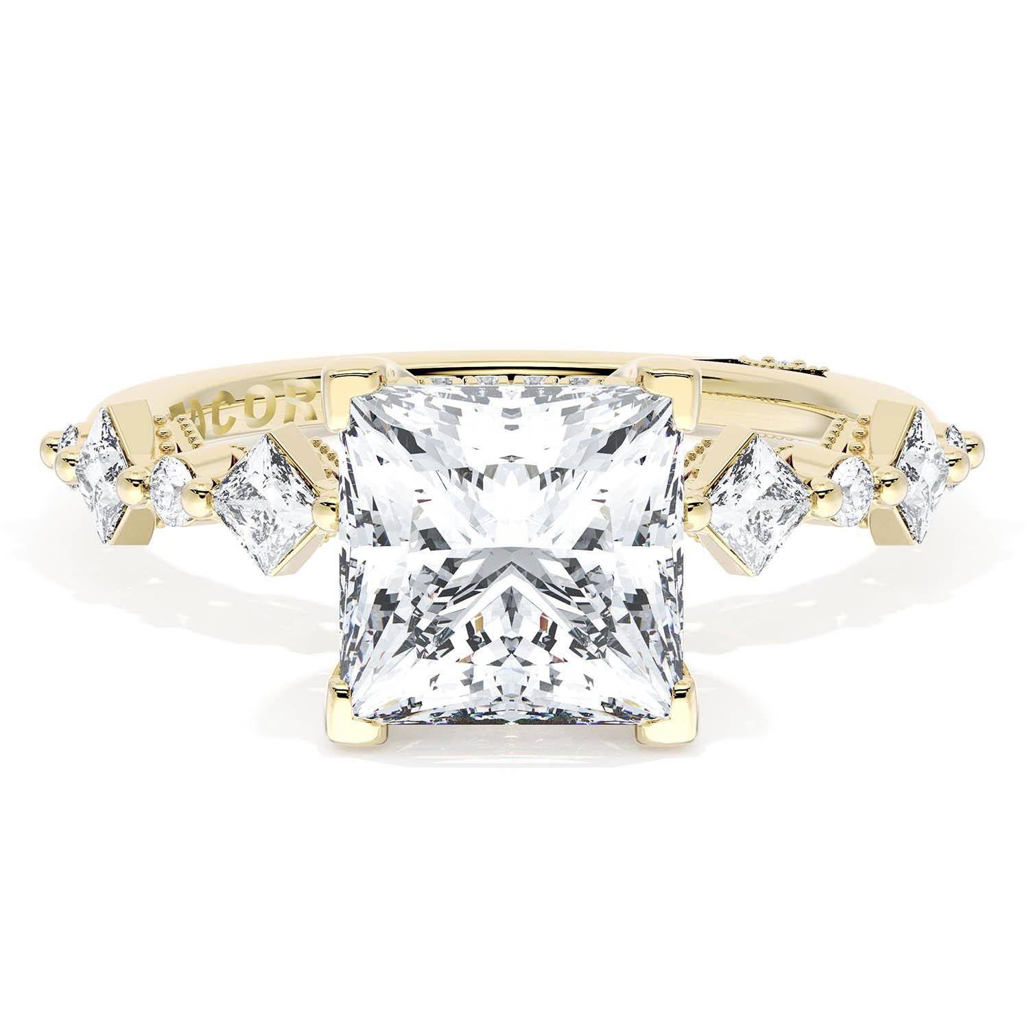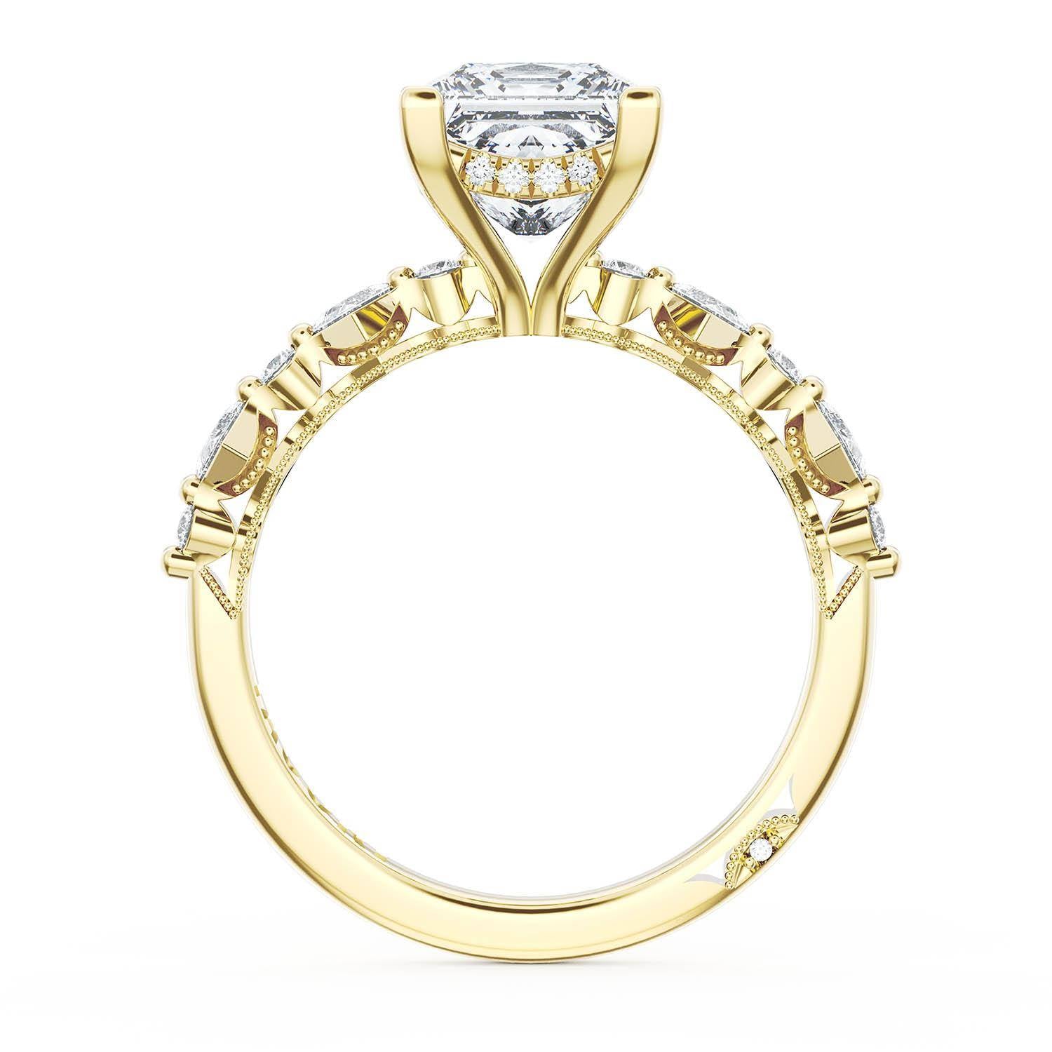 A Princess Solitaire is set into an 18kt Yellow Gold foundation. Alternating carré and round brilliant diamonds trace up the ceiling and hand-hewn beading adds texture to the silhouette.