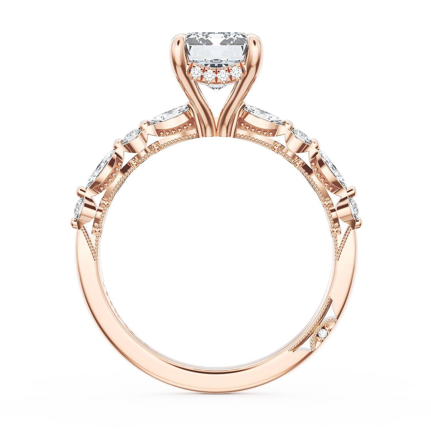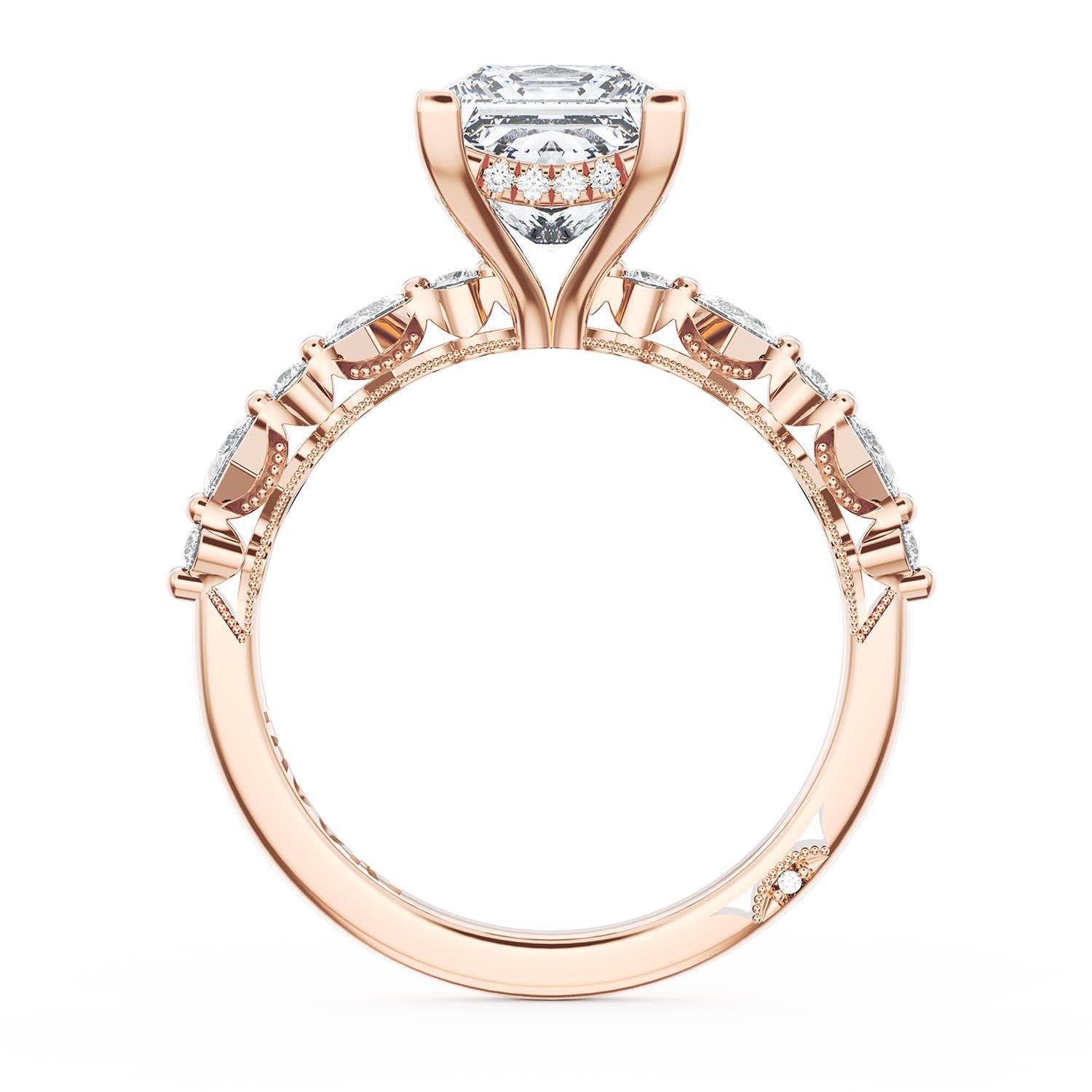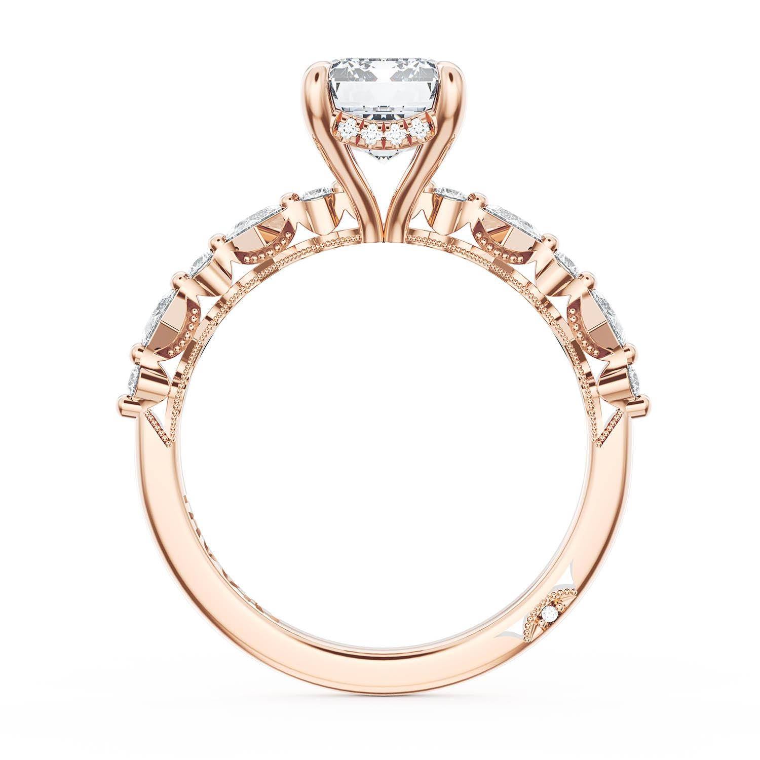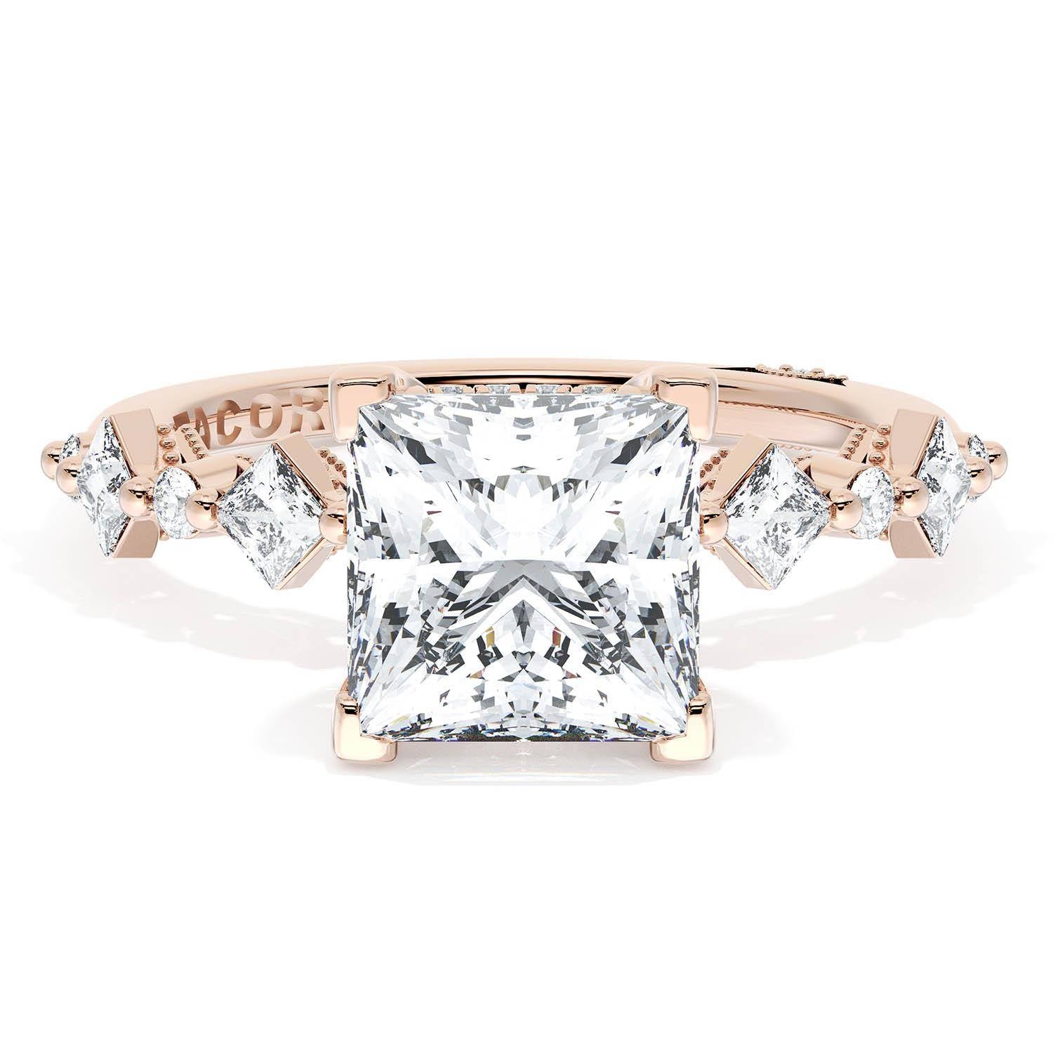 A Princess Solitaire is set into an 18kt Rose Gold foundation. Alternating carré and round brilliant diamonds trace up the ceiling and hand-hewn beading adds texture to the silhouette.