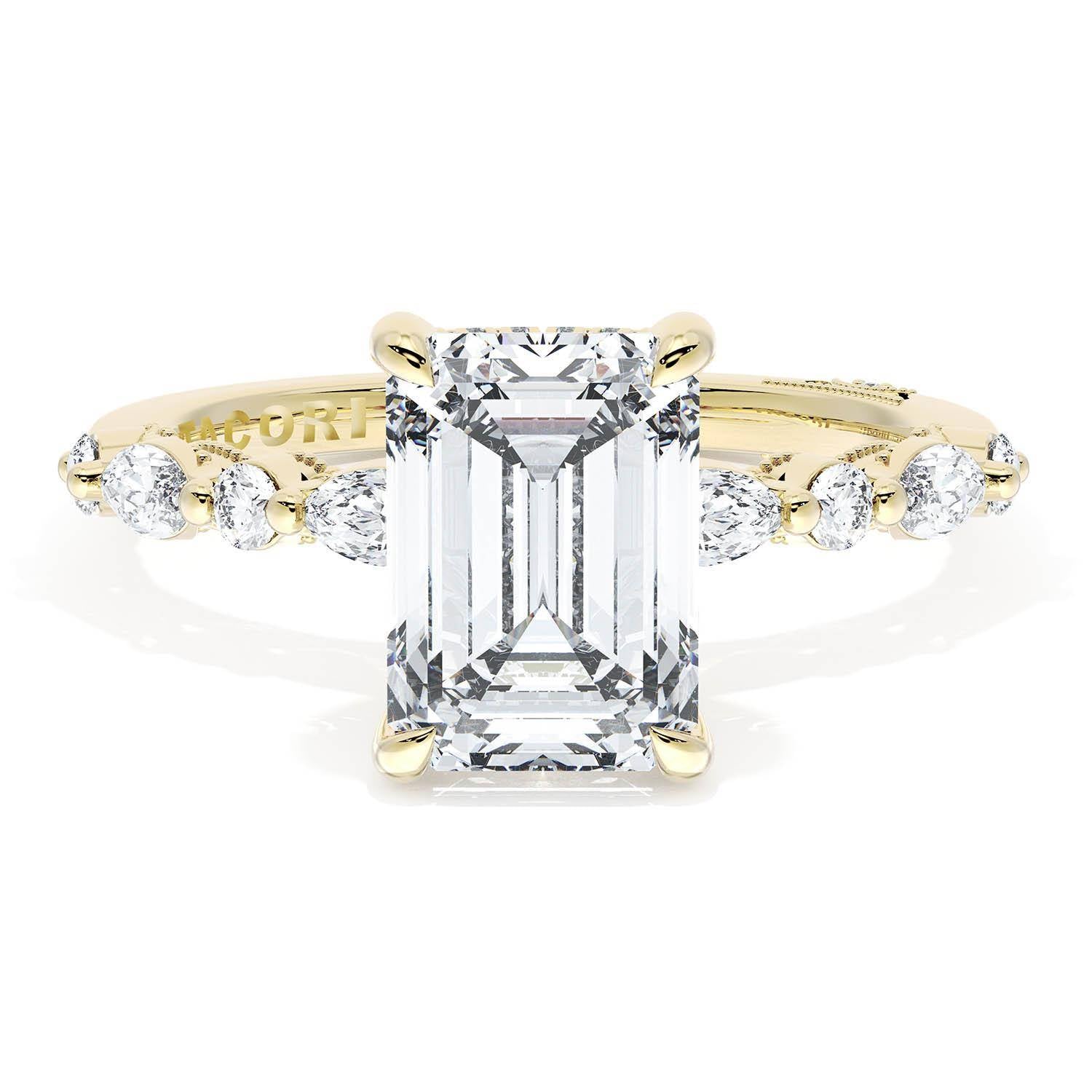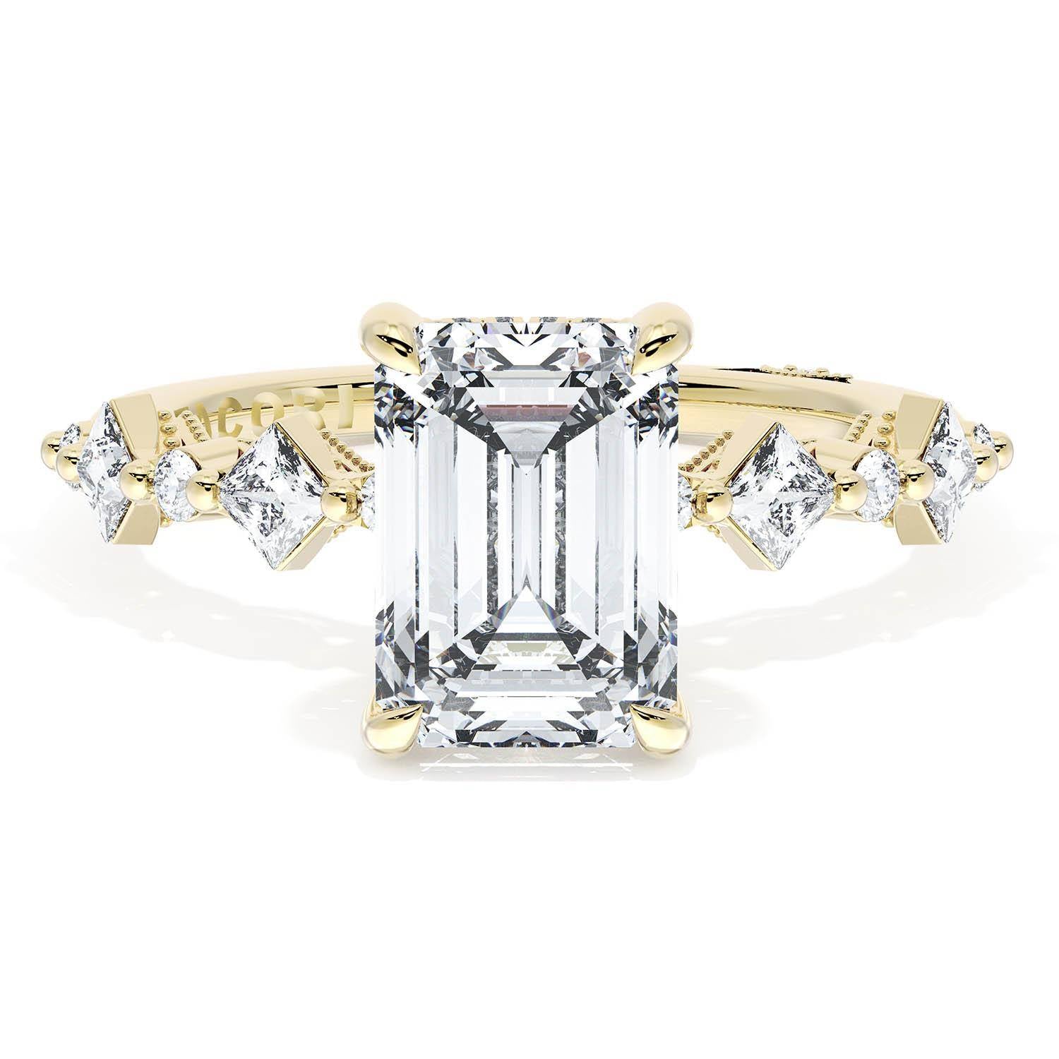 An Emerald Solitaire is set into an 18kt Yellow Gold foundation. Alternating carré and round brilliant diamonds trace up the ceiling and hand-hewn beading adds texture to the silhouette.