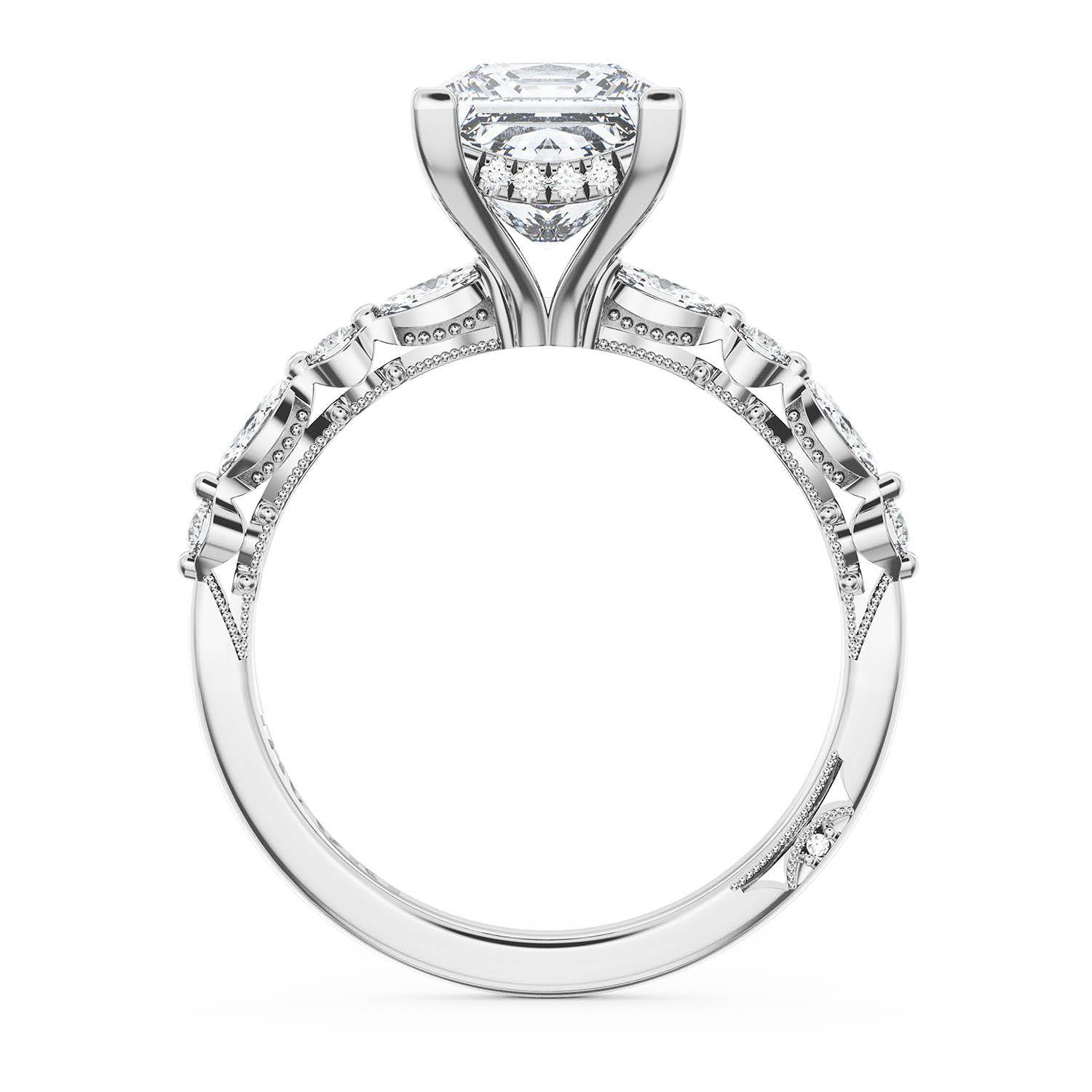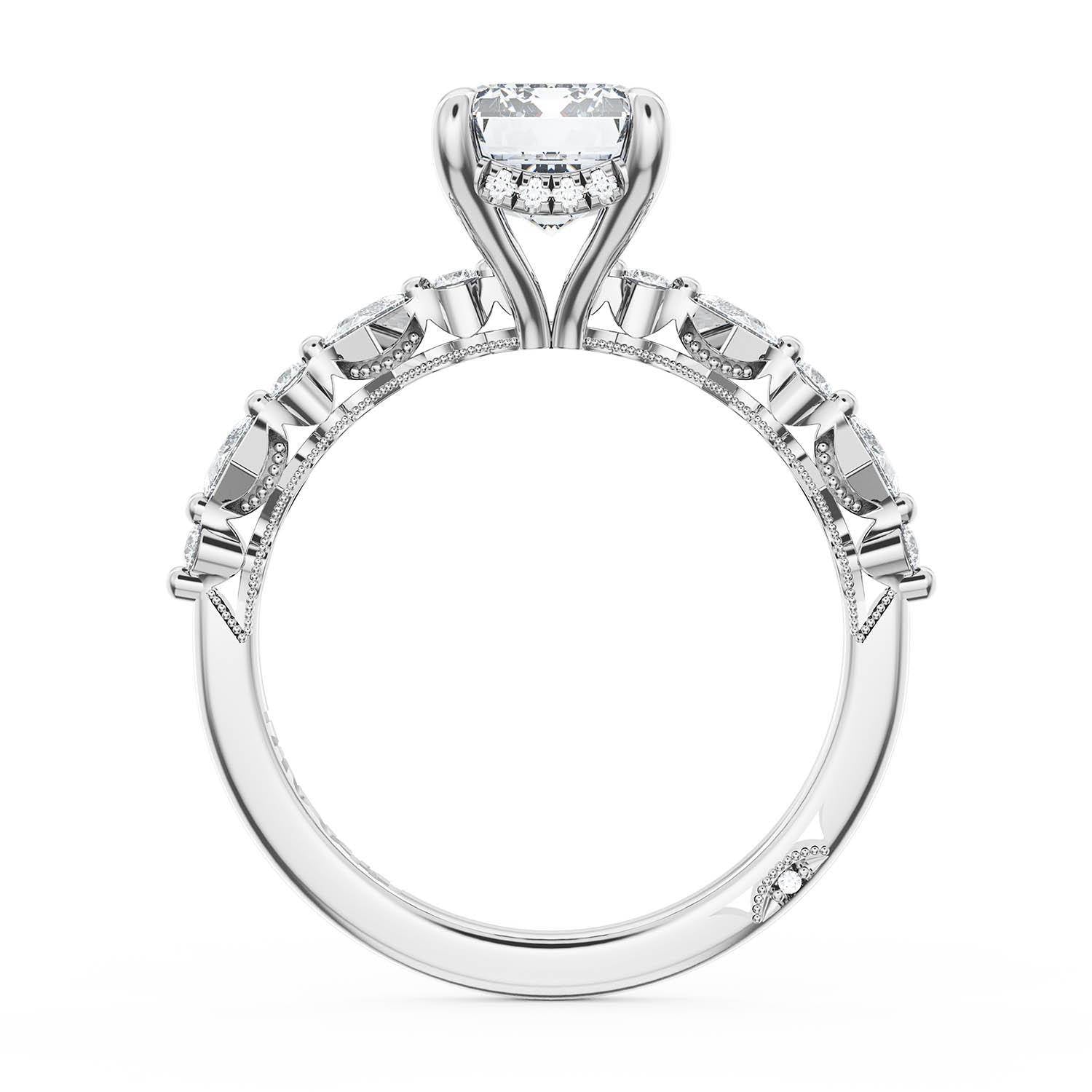 A Princess Solitaire is set into an 18kt White Gold foundation. Alternating marquise and round brilliant diamonds trace up the ceiling and hand-hewn beading adds texture to the silhouette.