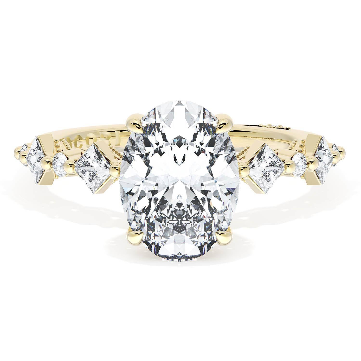 An Oval Solitaire is set into an 18kt Yellow Gold foundation. Alternating carré and round brilliant diamonds trace up the ceiling and hand-hewn beading adds texture to the silhouette.