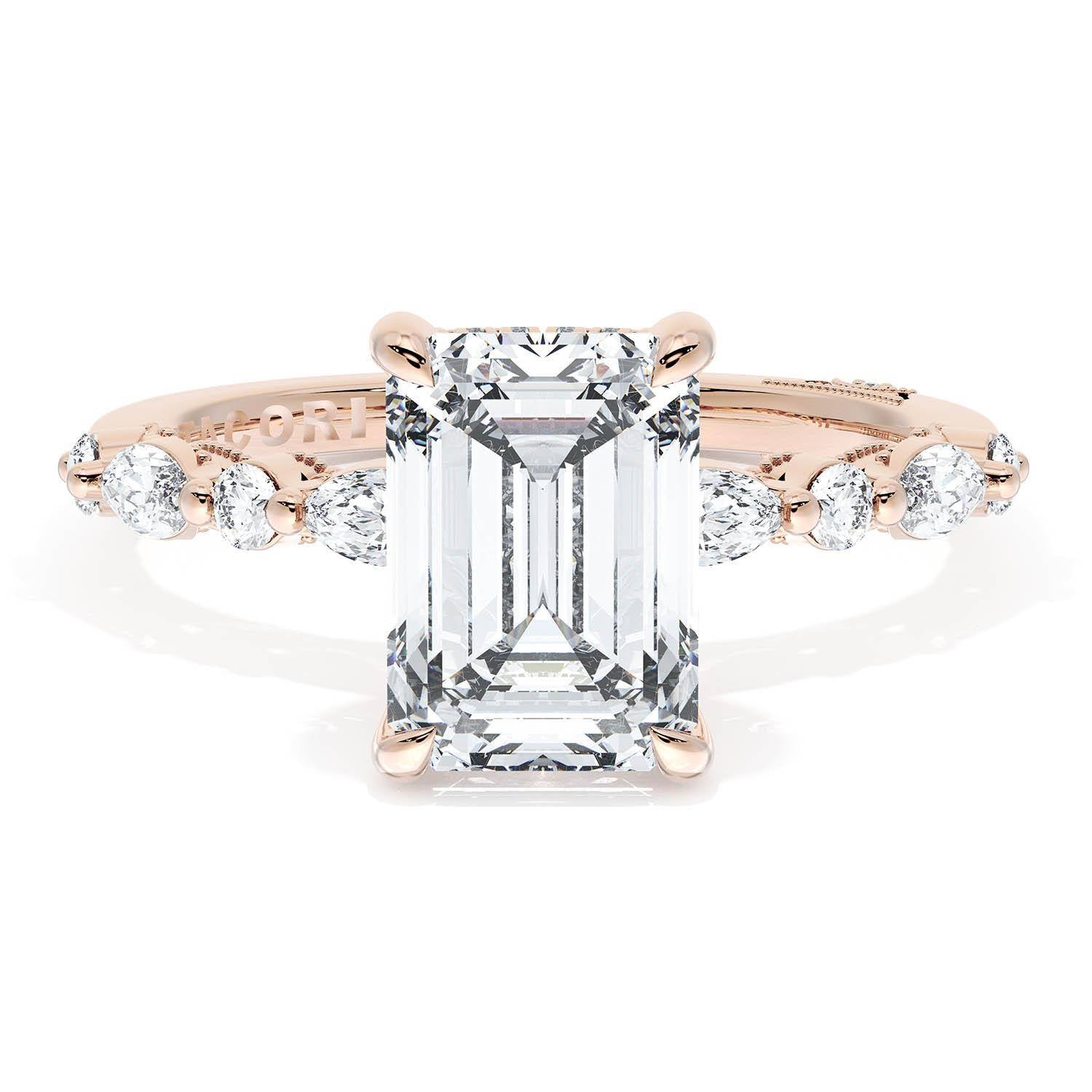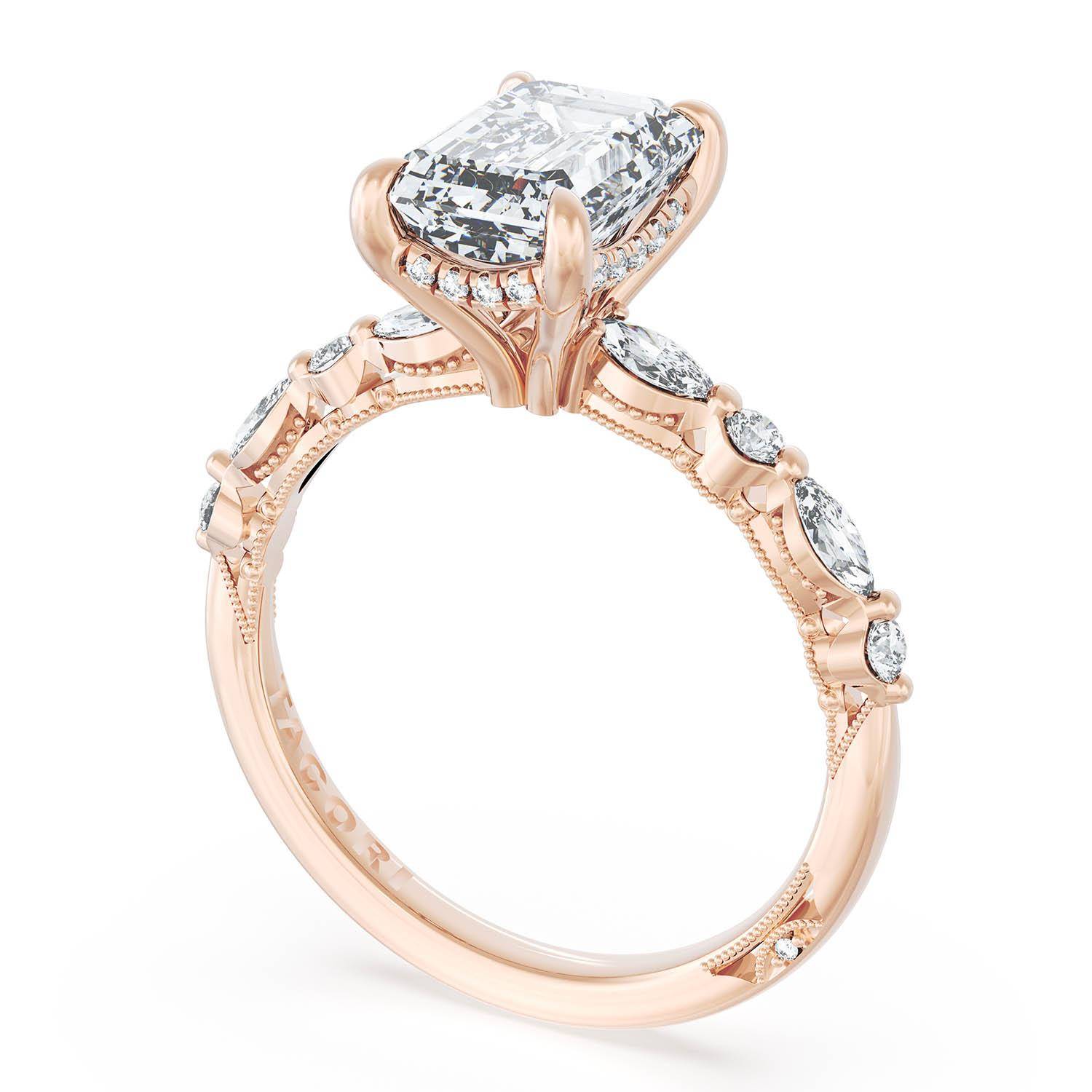 An Emerald Solitaire is set into an 18kt Rose Gold foundation. Alternating marquise and round brilliant diamonds trace up the ceiling and hand-hewn beading adds texture to the silhouette.
