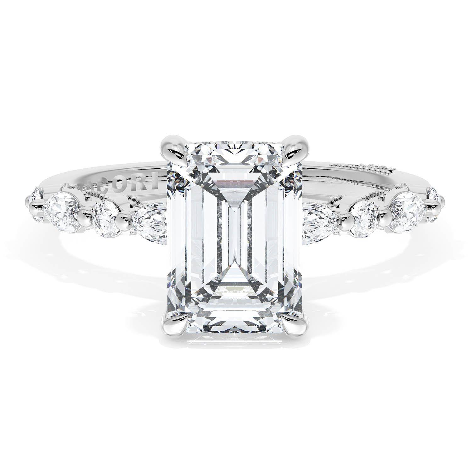 An Emerald Solitaire is set into an 18kt White Gold foundation. Alternating carré and round brilliant diamonds trace up the ceiling and hand-hewn beading adds texture to the silhouette.