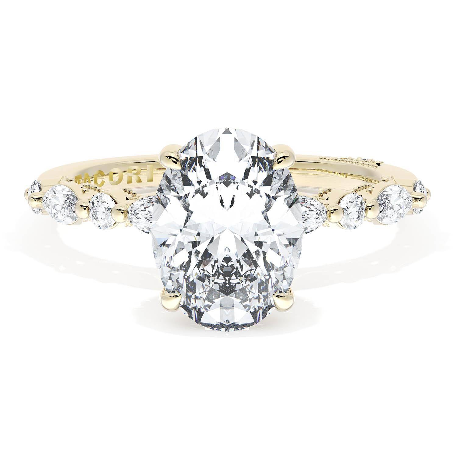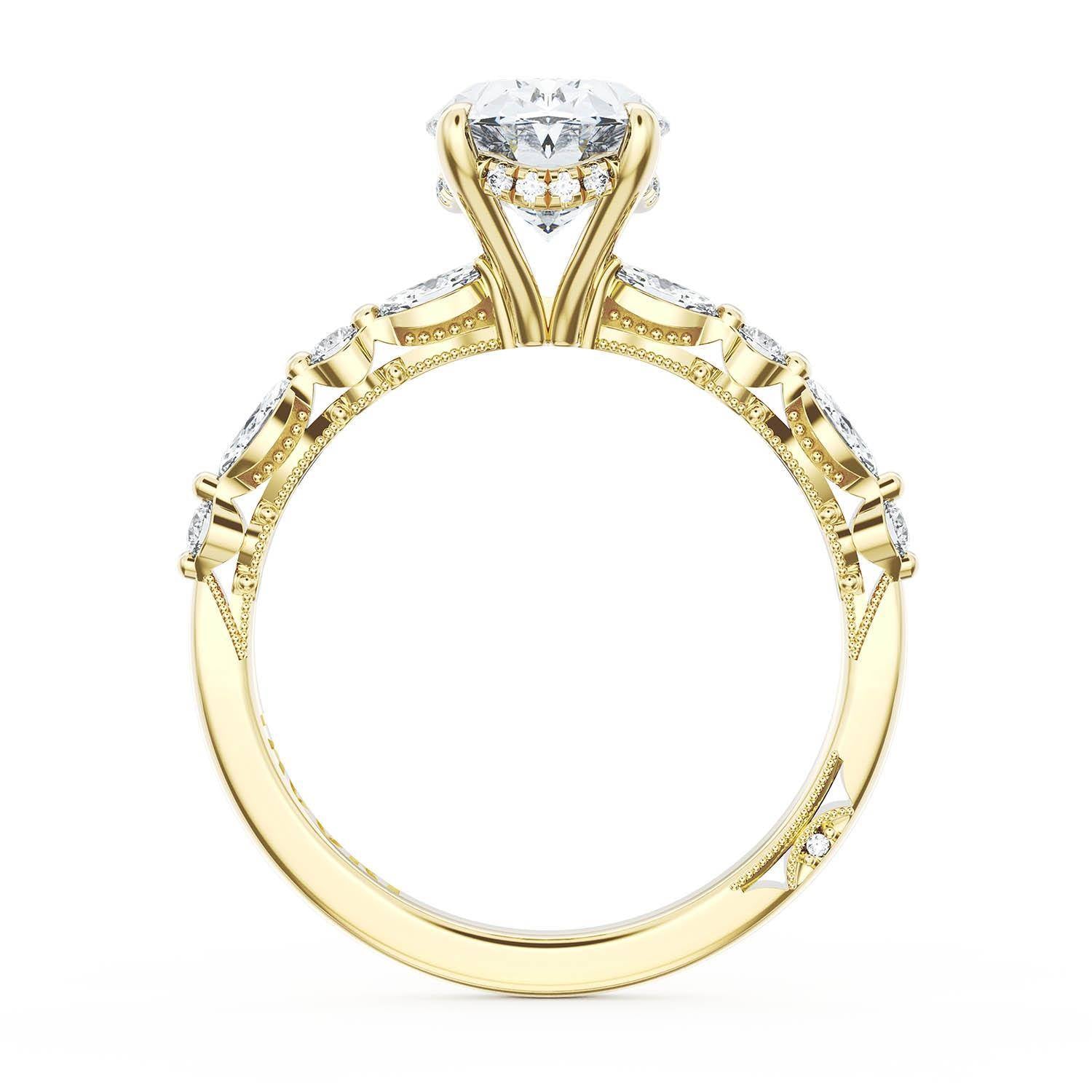 An Oval Solitaire is set into an 18kt Yellow Gold foundation. Alternating marquise and round brilliant diamonds trace up the ceiling and hand-hewn beading adds texture to the silhouette.