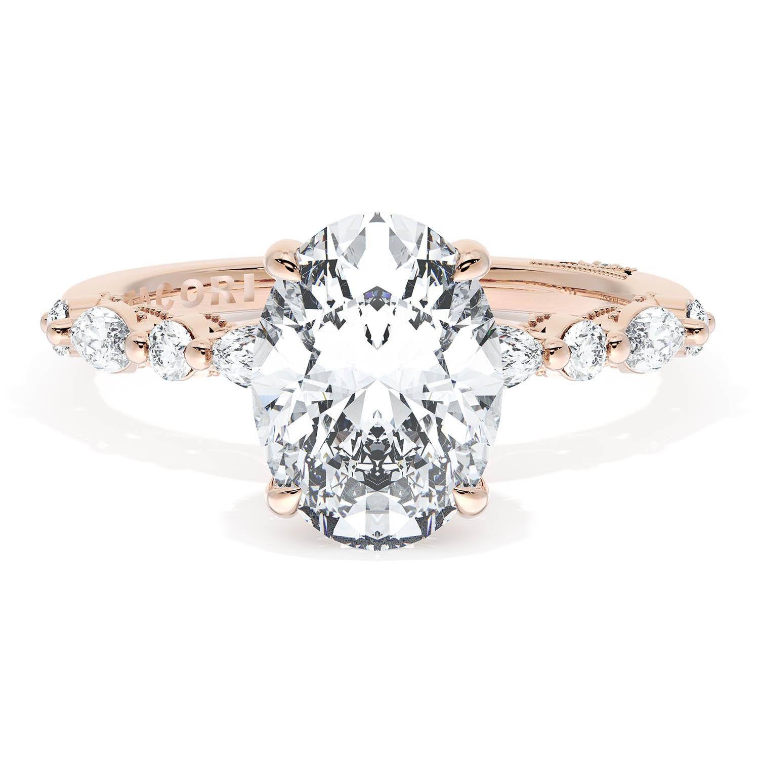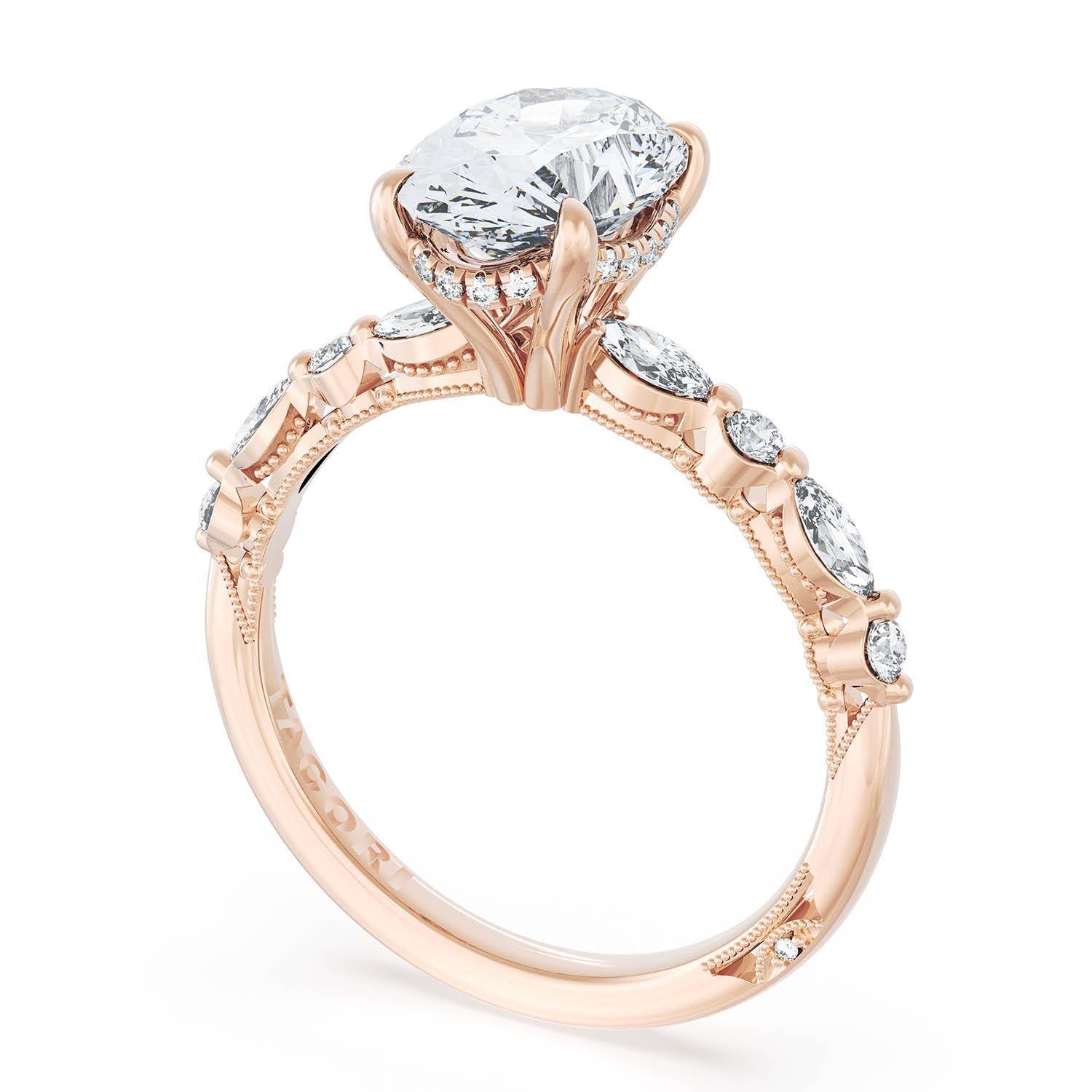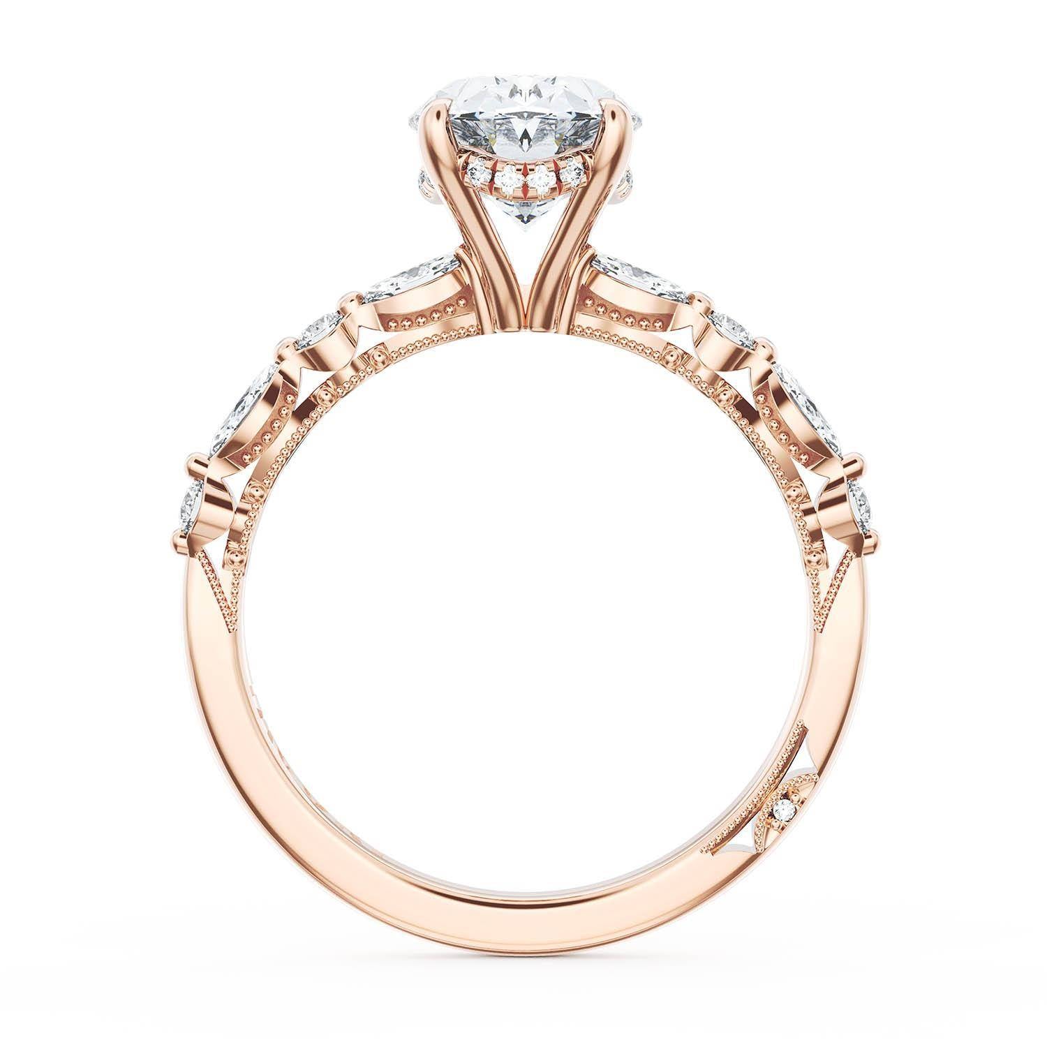 An Oval Solitaire is set into an 18kt Rose Gold foundation. Alternating marquise and round brilliant diamonds trace up the ceiling and hand-hewn beading adds texture to the silhouette.