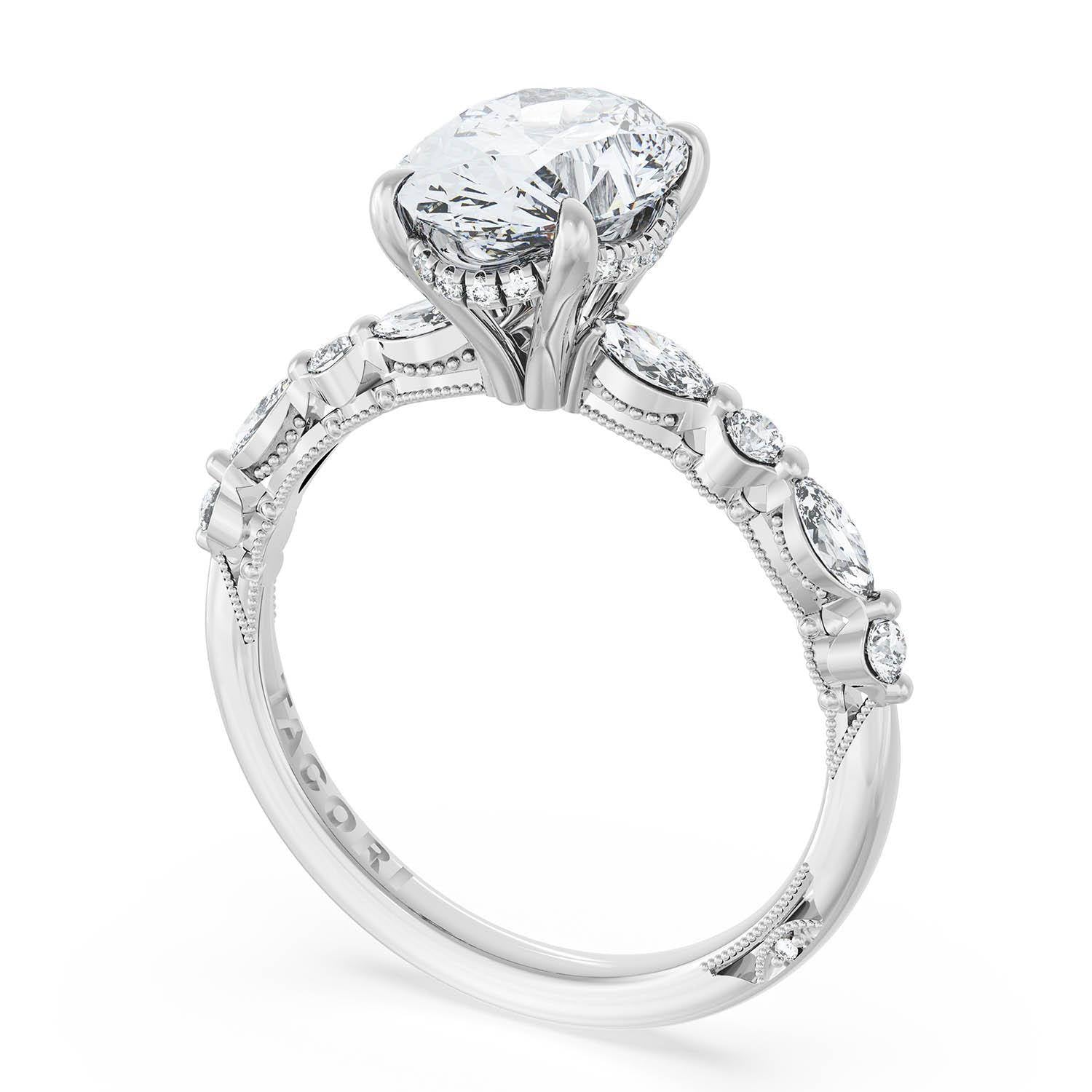 An Oval Solitaire is set into an 18kt White Gold foundation. Alternating marquise and round brilliant diamonds trace up the ceiling and hand-hewn beading adds texture to the silhouette.