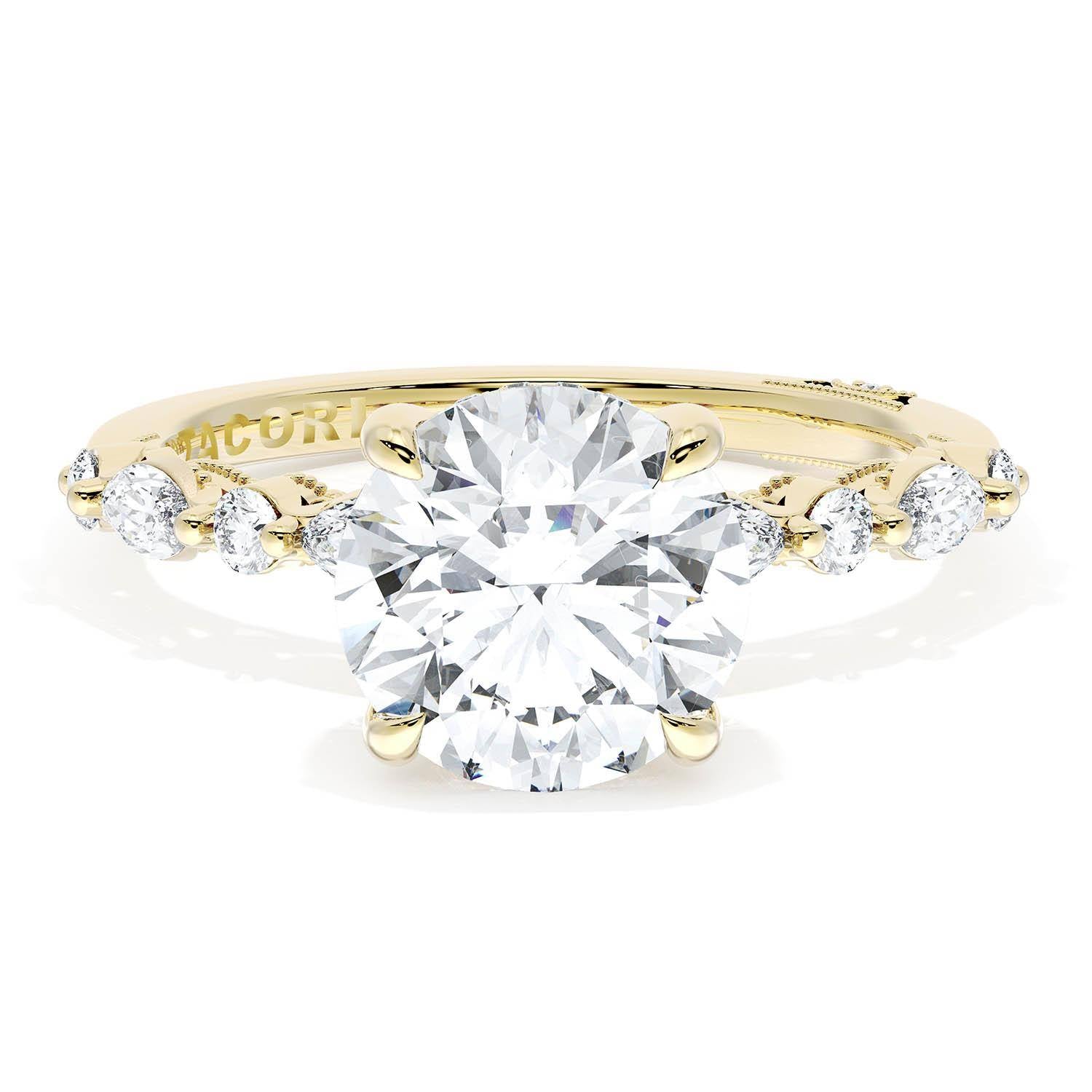 A Round Solitaire is set into an 18kt Yellow Gold foundation. Alternating marquise and round brilliant diamonds trace up the ceiling and hand-hewn beading adds texture to the silhouette.
