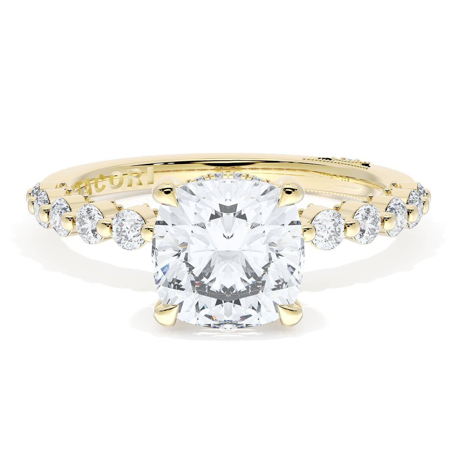 A Cushion Solitaire is set into an 18kt Yellow Gold foundation. Masterfully set round brilliant diamonds trace up the ceiling and hand-hewn beading adds texture to the silhouette.
