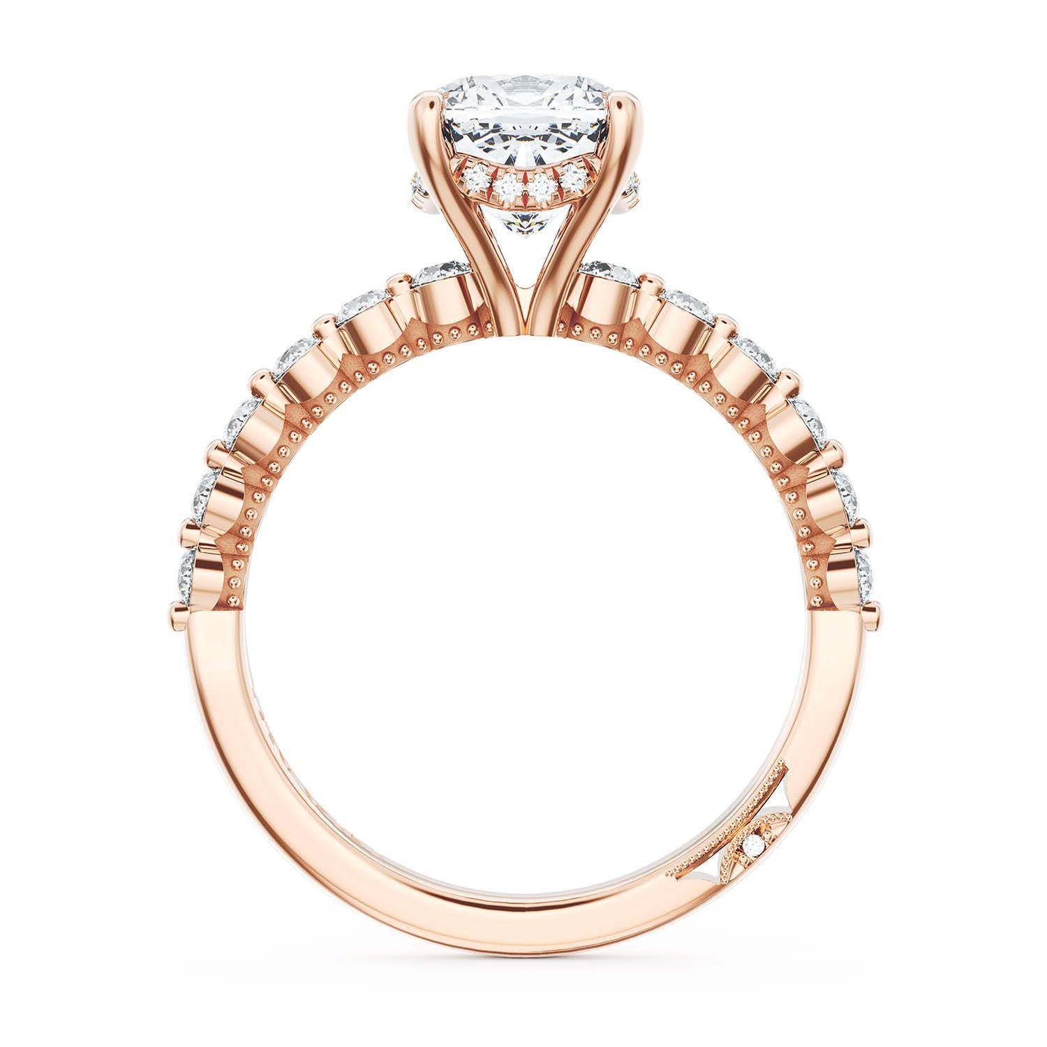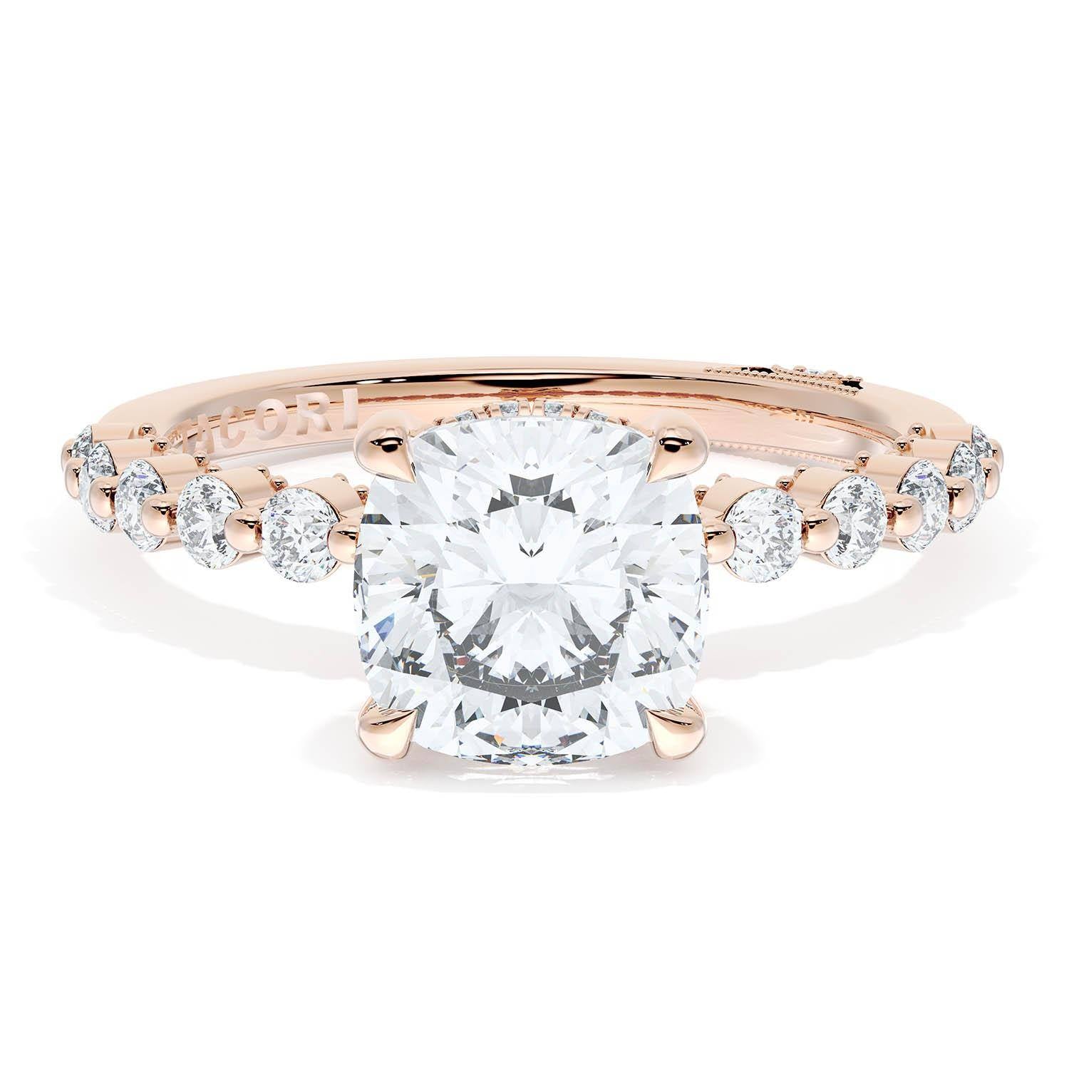 A Cushion Solitaire is set into an 18kt Rose Gold foundation. Masterfully set round brilliant diamonds trace up the ceiling and hand-hewn beading adds texture to the silhouette.