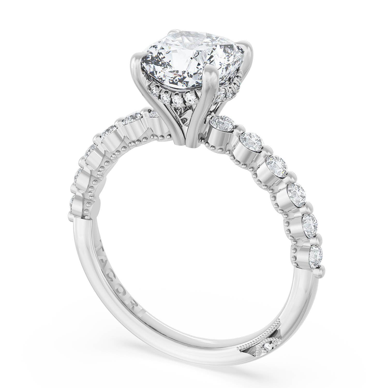A Cushion Solitaire is set into an 18kt White Gold foundation. Masterfully set round brilliant diamonds trace up the ceiling and hand-hewn beading adds texture to the silhouette.