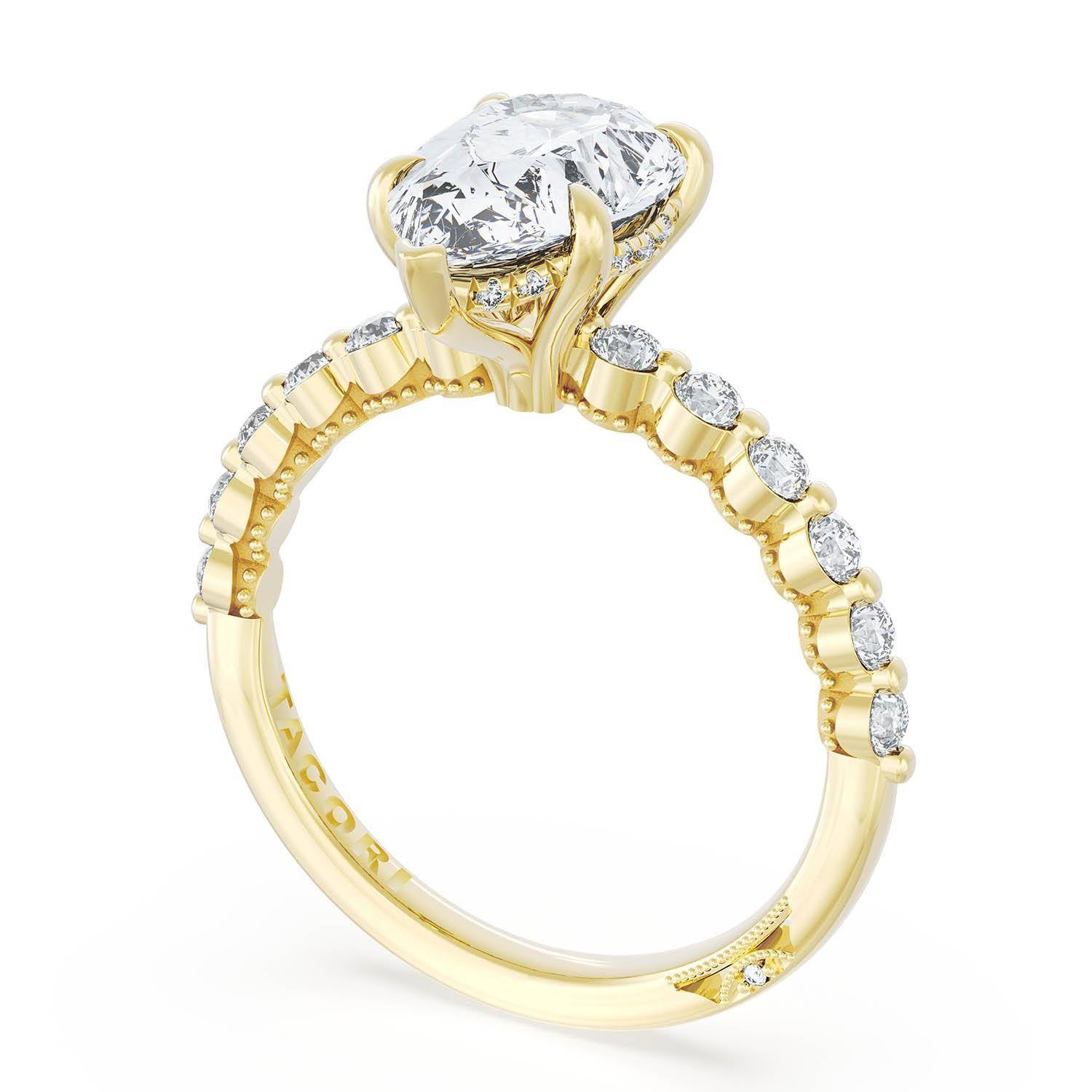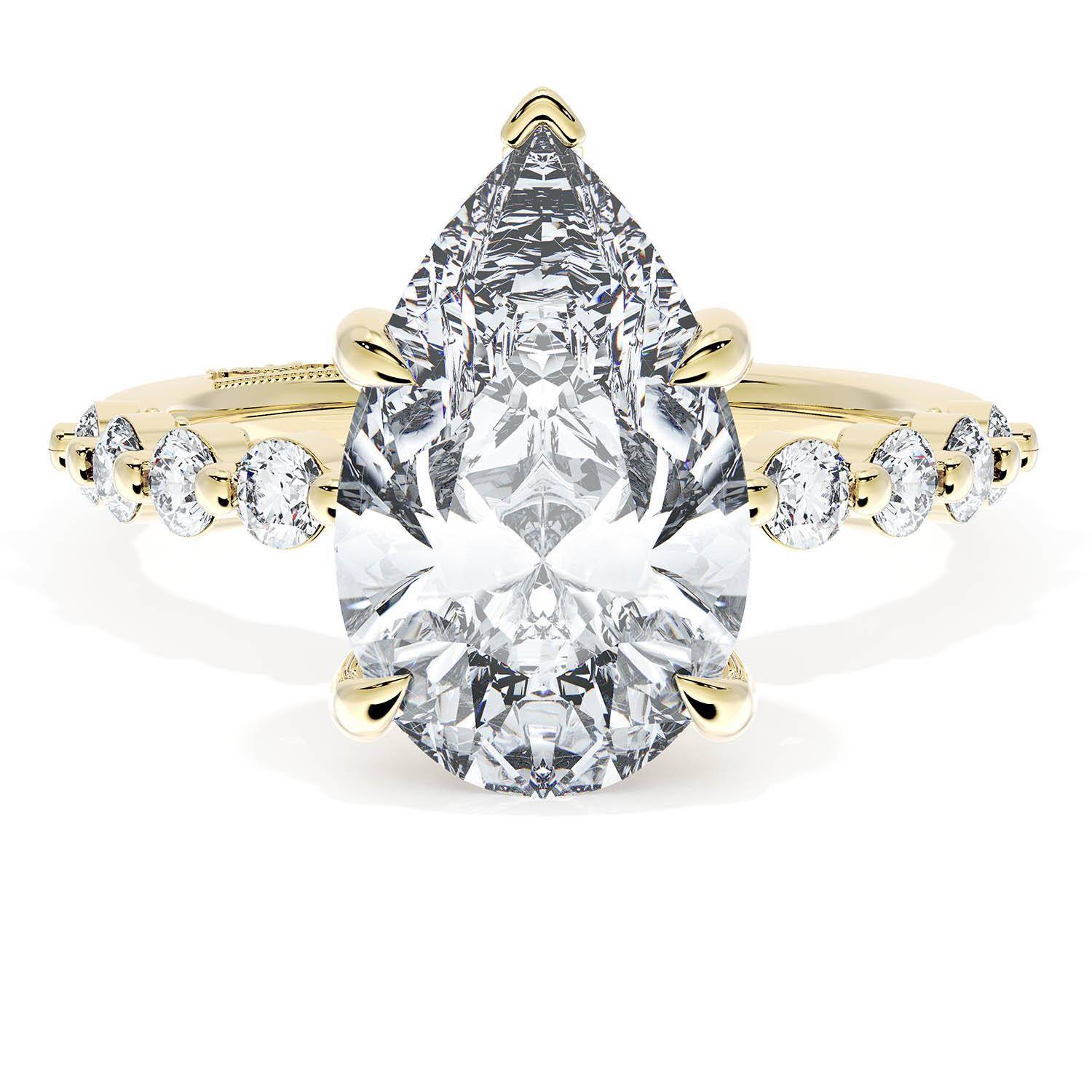 A Pear Solitaire is set into an 18kt Yellow Gold foundation. Masterfully set round brilliant diamonds trace up the ceiling and hand-hewn beading adds texture to the silhouette.