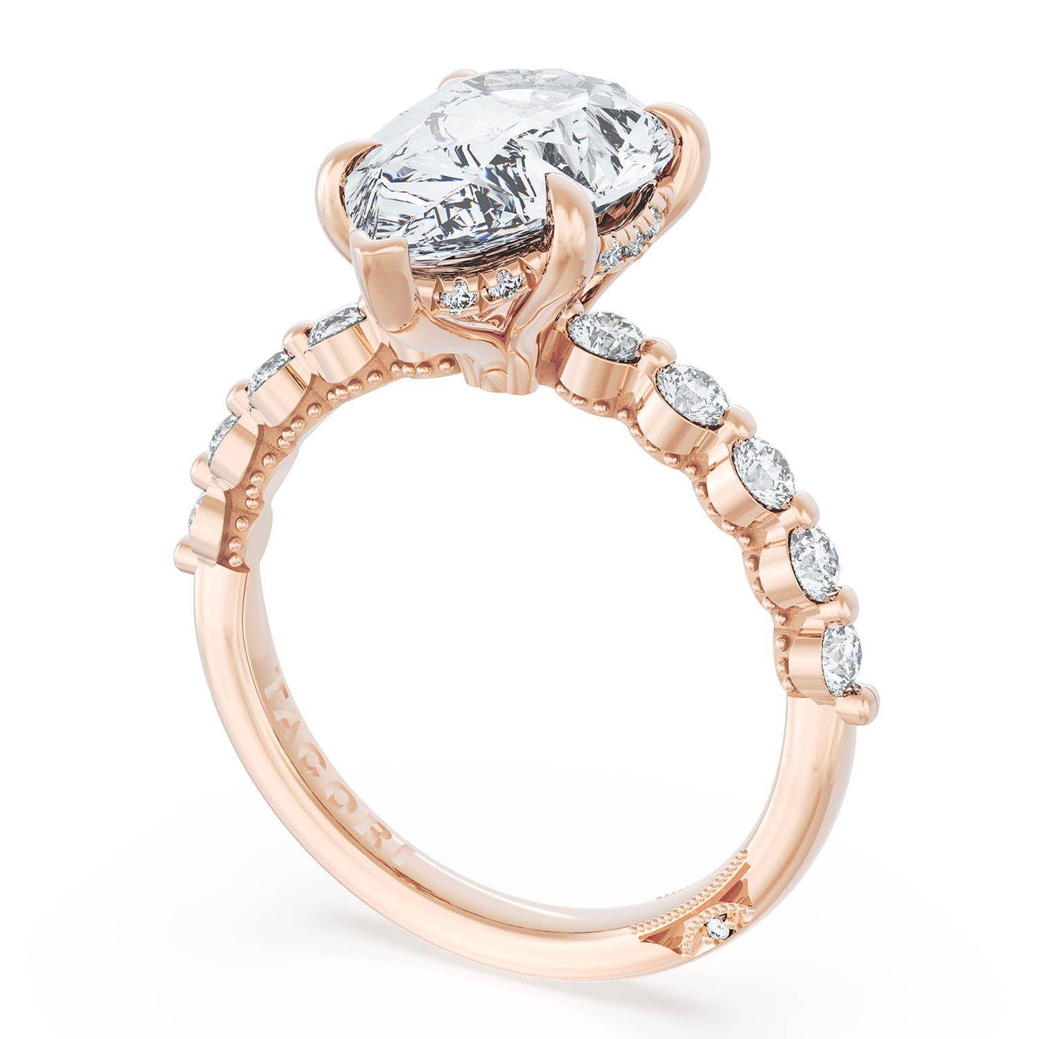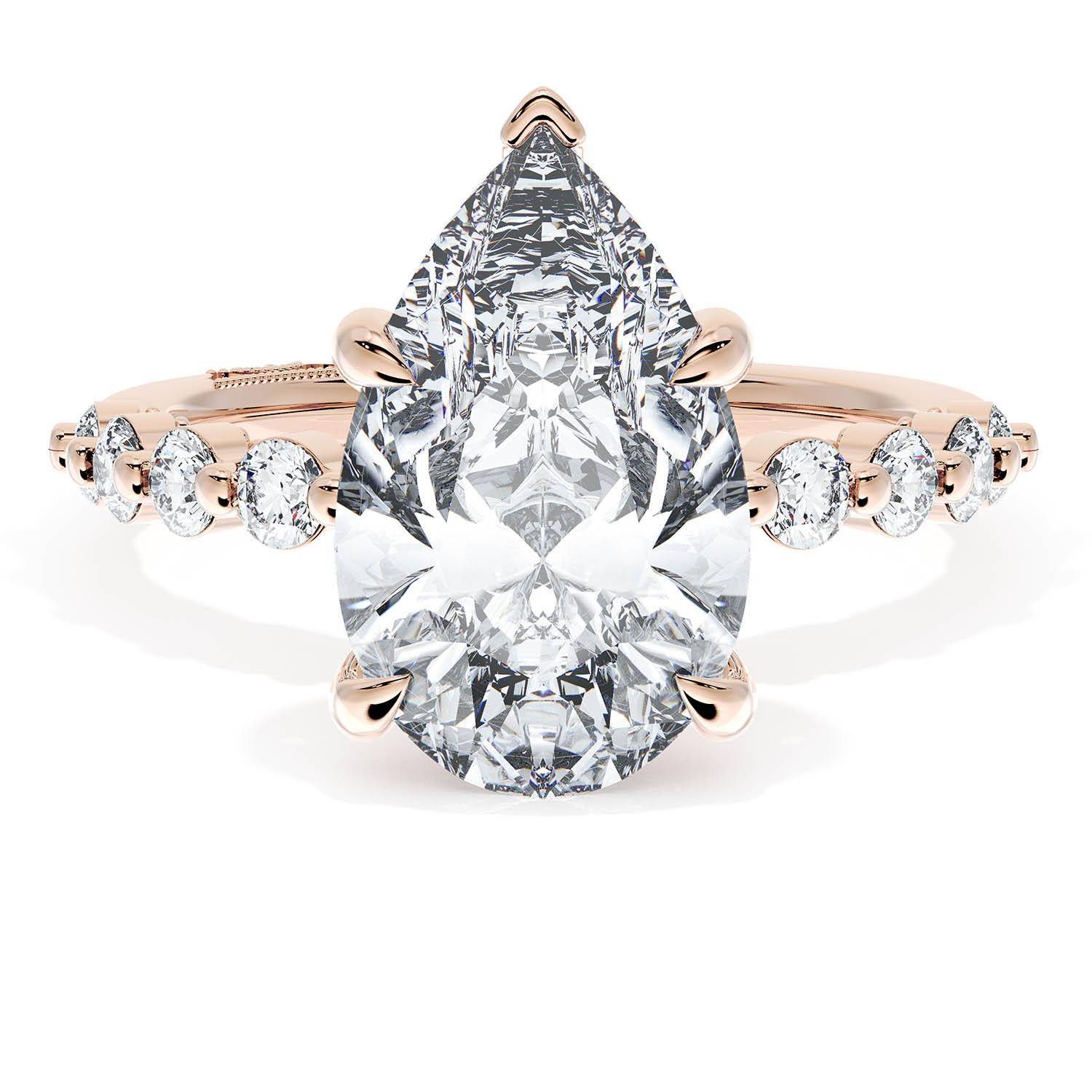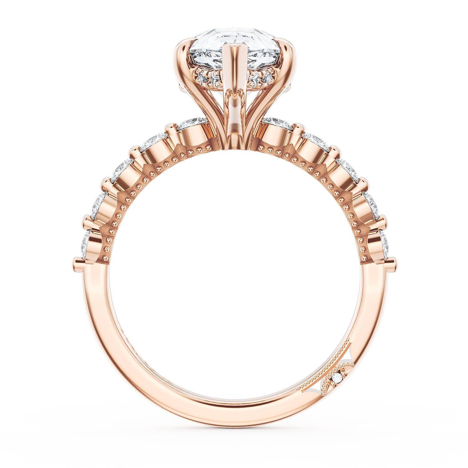 A Pear Solitaire is set into an 18kt Rose Gold foundation. Masterfully set round brilliant diamonds trace up the ceiling and hand-hewn beading adds texture to the silhouette.