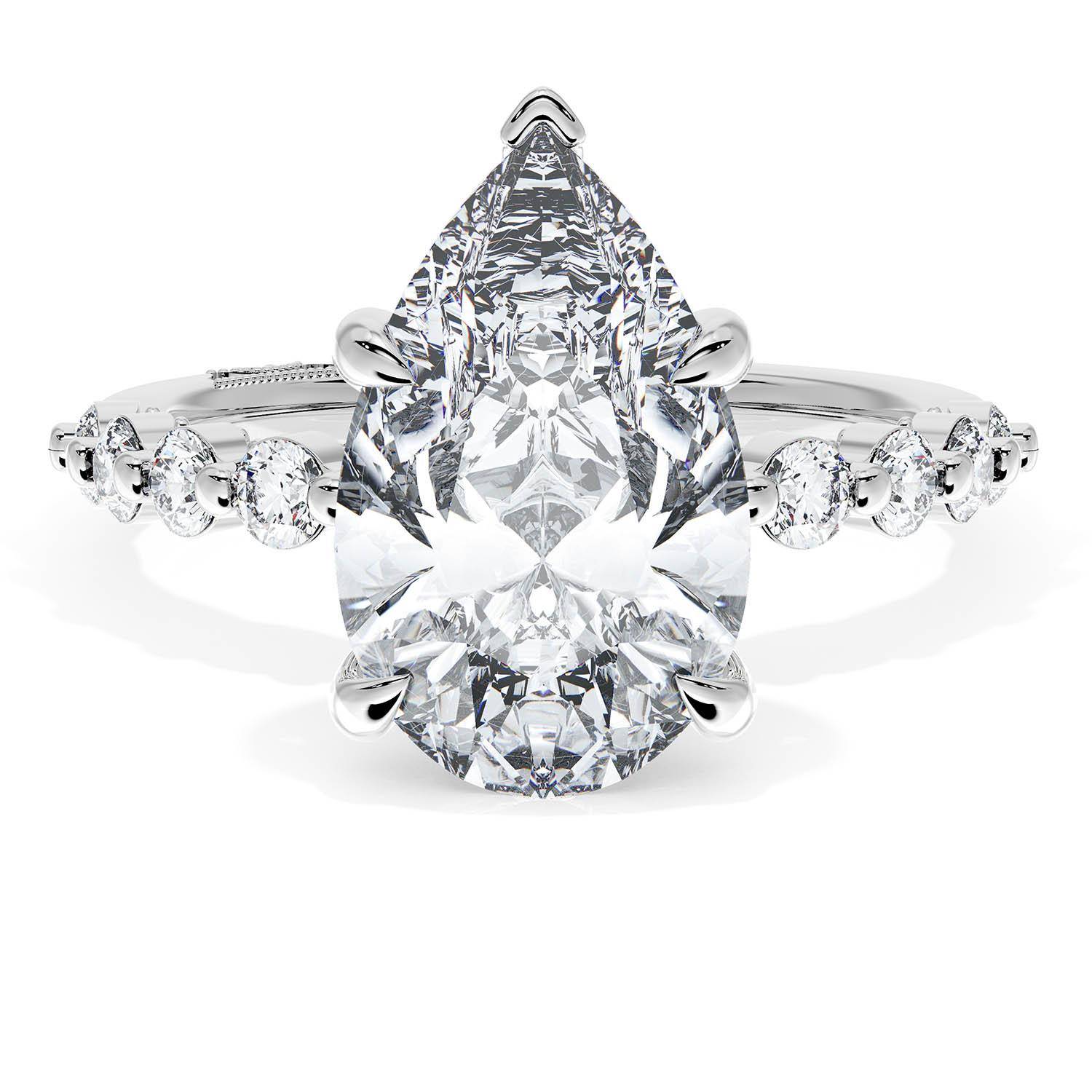 A Pear Solitaire is set into an 18kt White Gold foundation. Masterfully set round brilliant diamonds trace up the ceiling and hand-hewn beading adds texture to the silhouette.