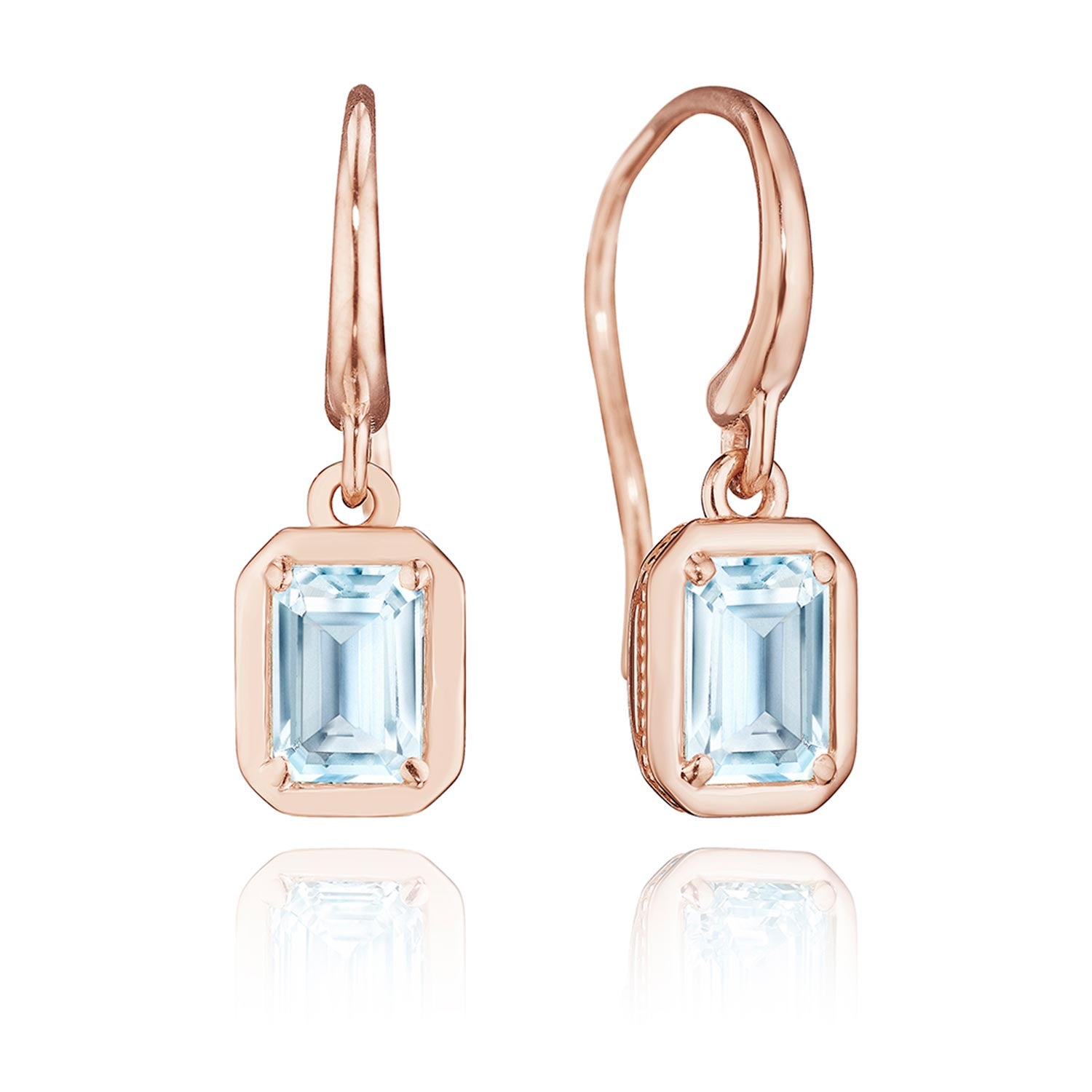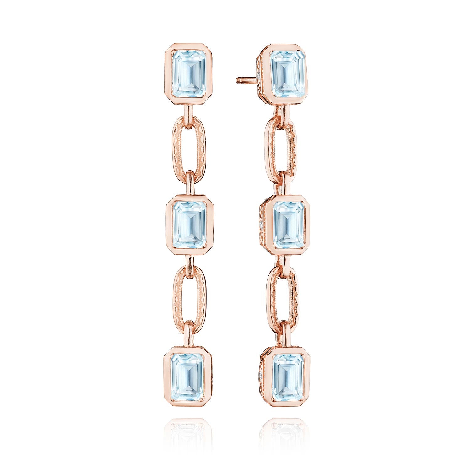 High polish bezel frames enthrall Sky Blue Topaz centers, while on the reverse, pinpoint mined diamonds add directional light. An intricate link of hand-hewn TACORI Crescent detailing connects each gemstone setting for elegant length. Each earring contains a 2.1 ct gemstone for a total carat weight of 4.2.