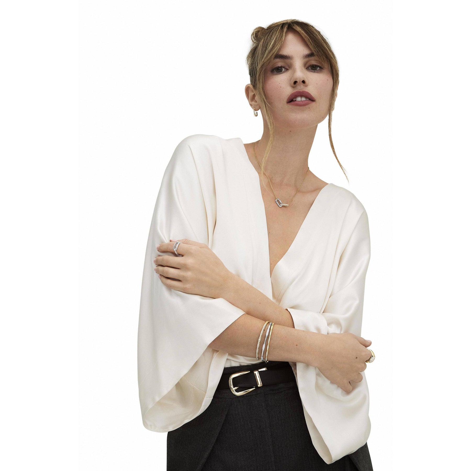High polish frames enthrall mined diamond centers, while on the reverse, meticulous hidden details and pinpoint mined diamonds add dimensional sparkle. Hand-hewn Crescent-embellished links connect each bezel setting.