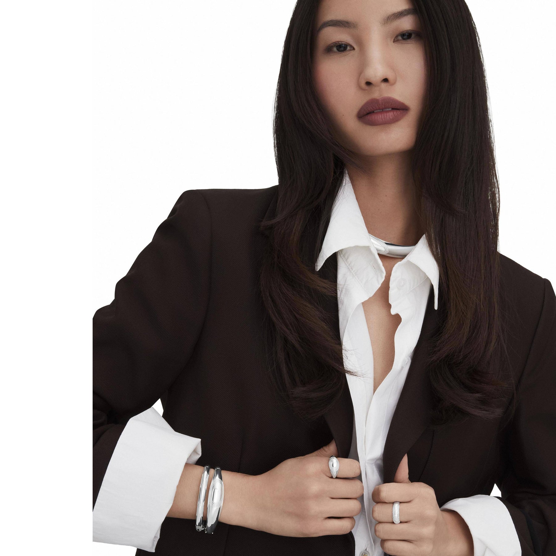 A silver high polish bangle is accented with bold, nested milgrain ellipses. The interior features hidden Crescent detailing and a hinge clasp for effortless wear.