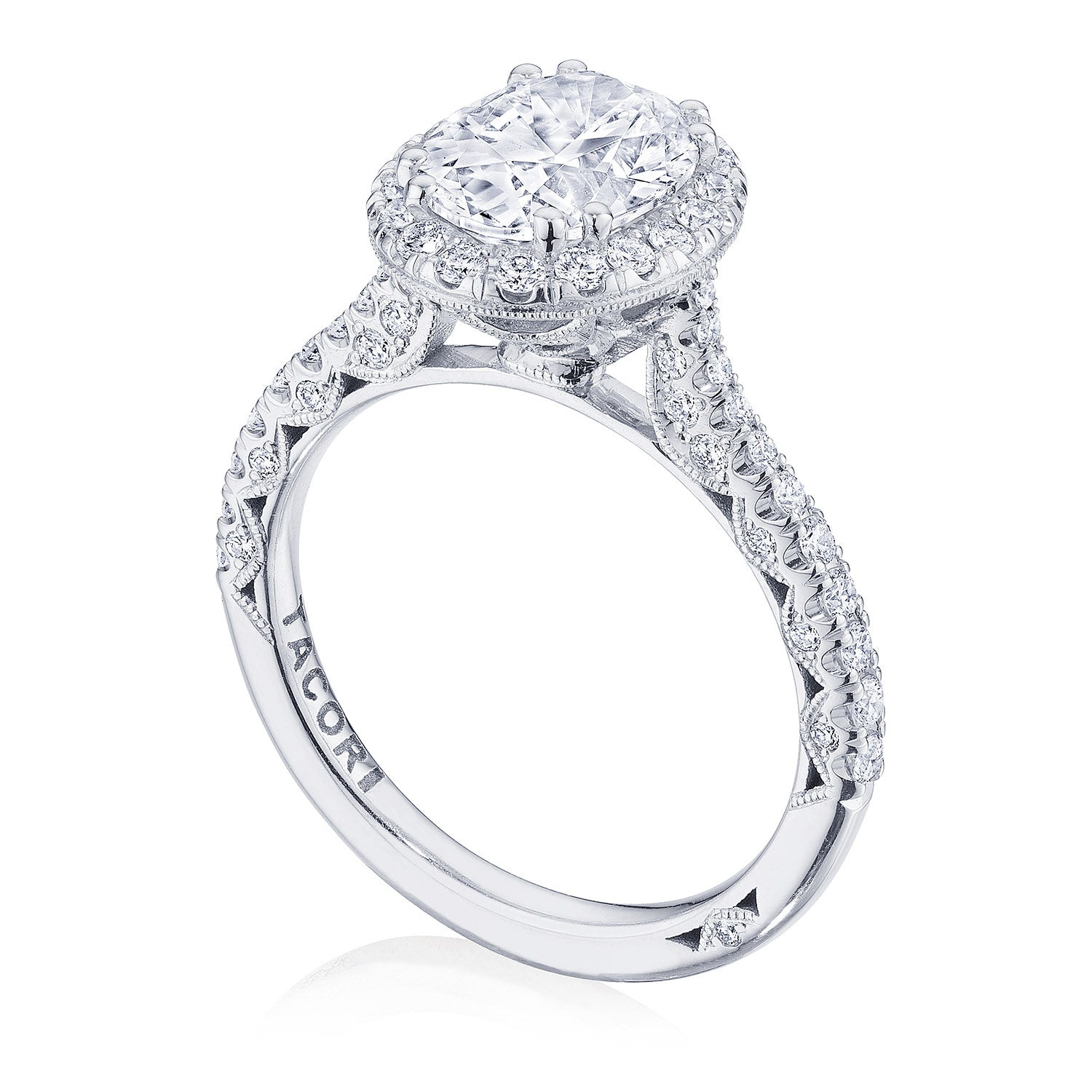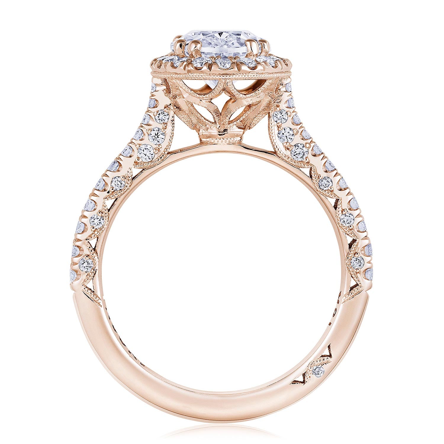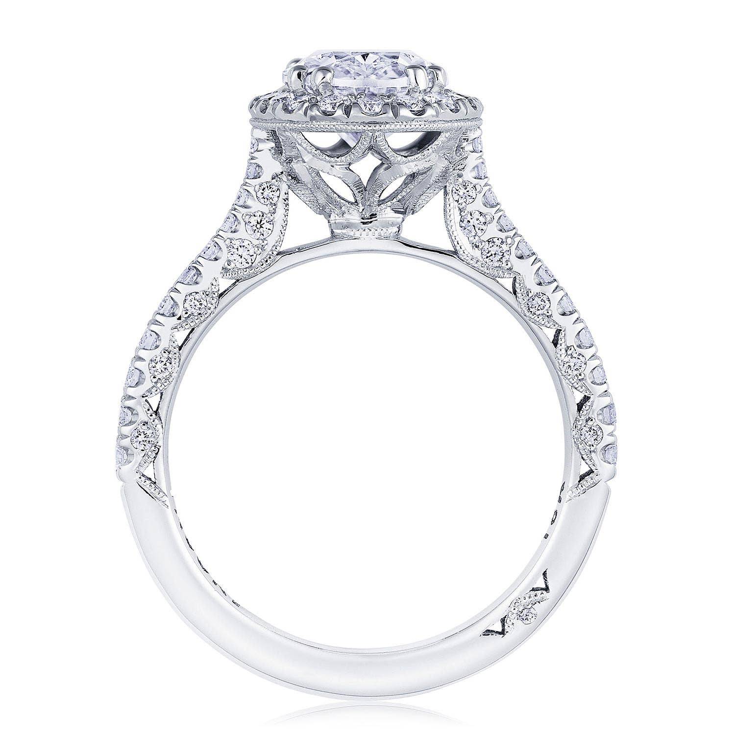 The center stone sits on a Cathedral foundation, above a high-polish band of premium metal. Simply Tacori crescent fabric adds hidden diamond detailing on the innerface fo the ring. A diamond-studded Signature Crescent marks the resting point.