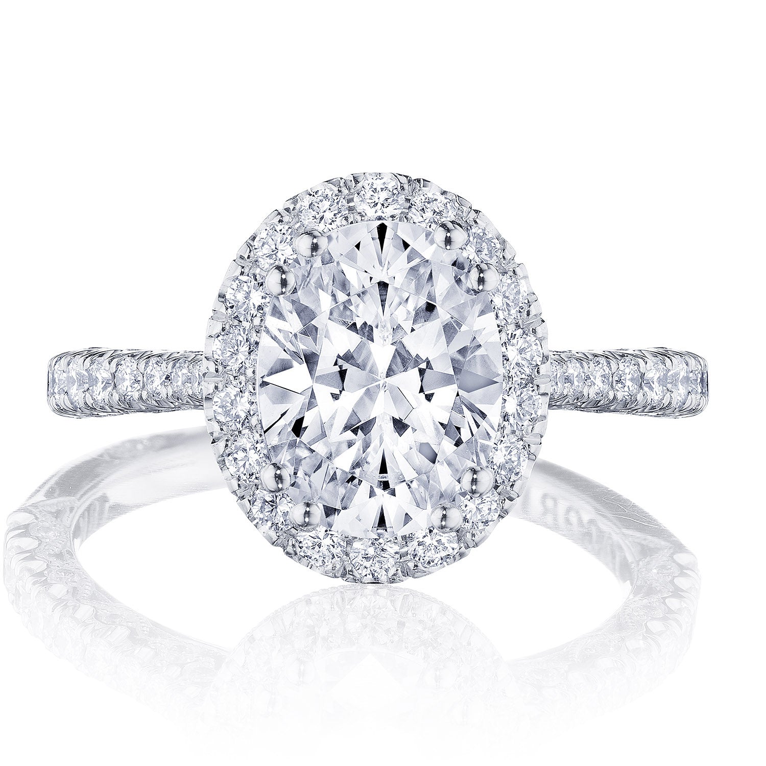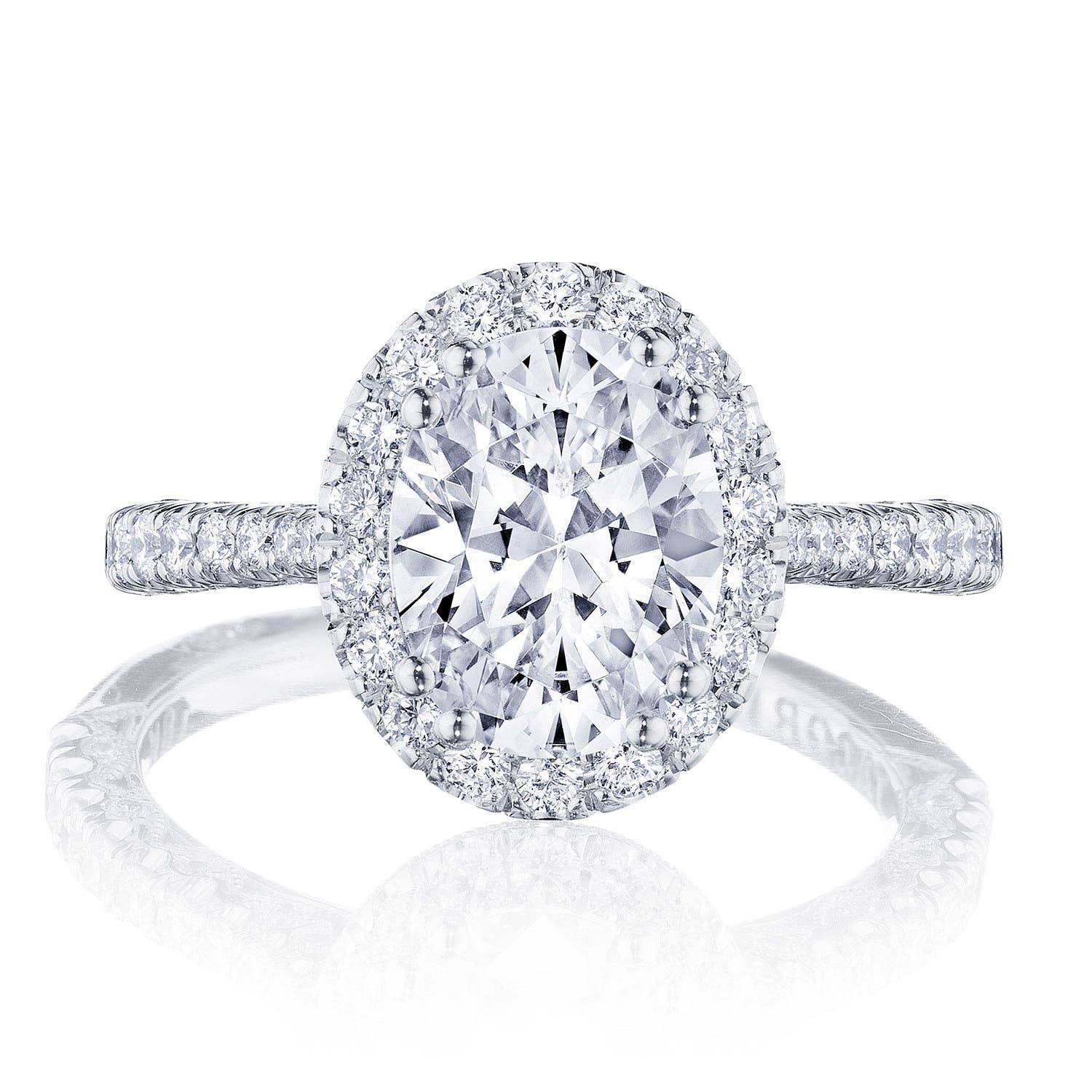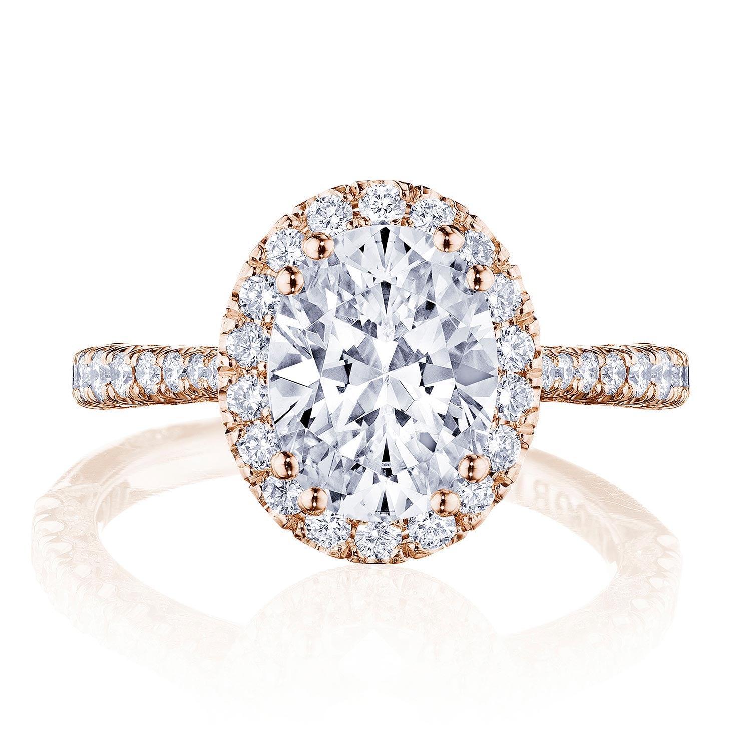 The center stone sits on a Cathedral foundation, above a high-polish band of premium metal. Simply Tacori crescent fabric adds hidden diamond detailing on the innerface fo the ring. A diamond-studded Signature Crescent marks the resting point.