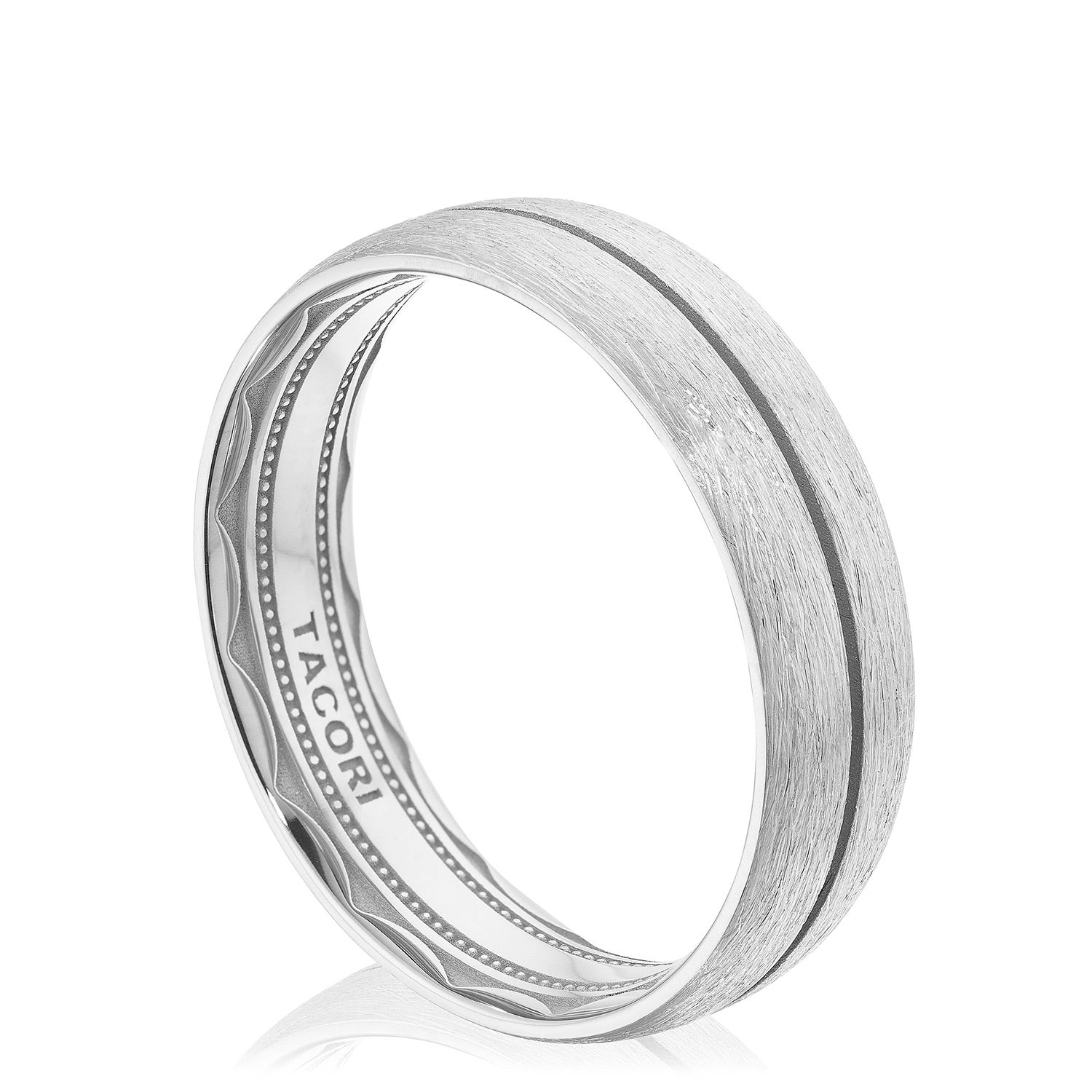 The exterior of this ring is genuinely sophisticated, with a brushed finish and a beveled accent line circling around the softly-rounded top. The interior features sculpted crescent detail with a soft-comfort fit for all-day wearability.