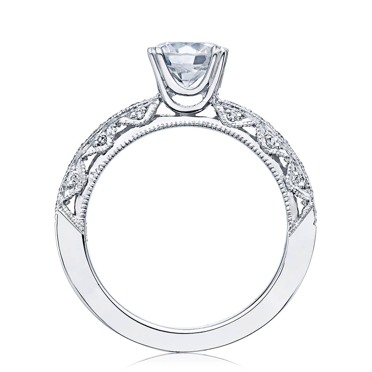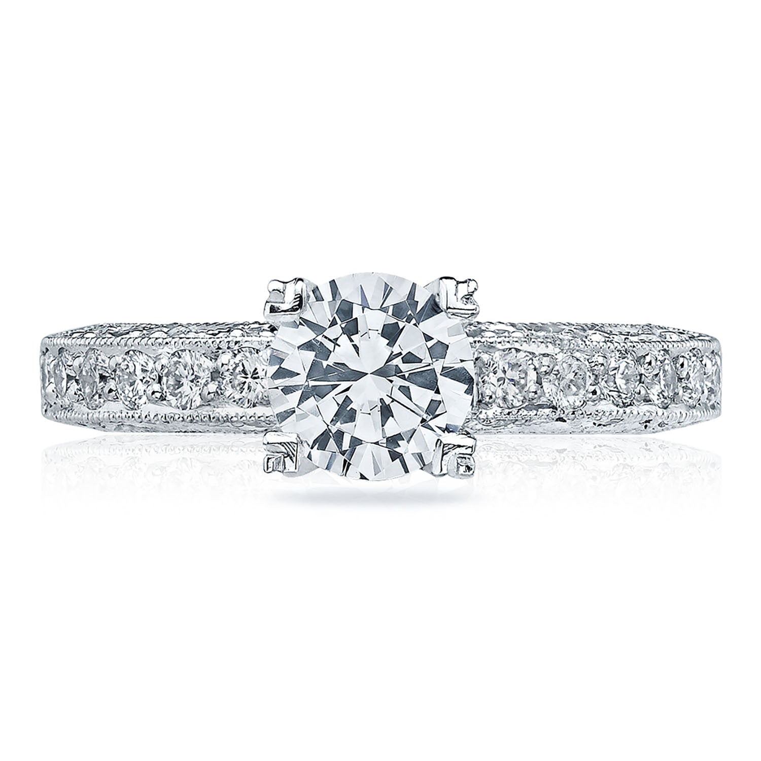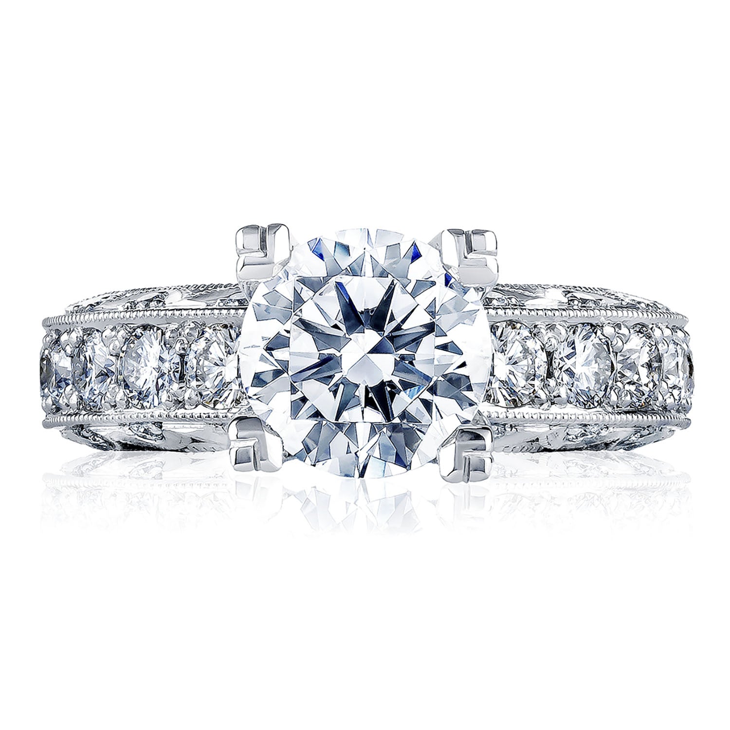 Graduated round diamonds and tapered rows of pavé lead to the round solitaire, set in a contemporary Cathedral Foundation. A Classic Crescent fabric, decorated with more diamond detailing, adds the TACORI Touch to the silhouette of the band.