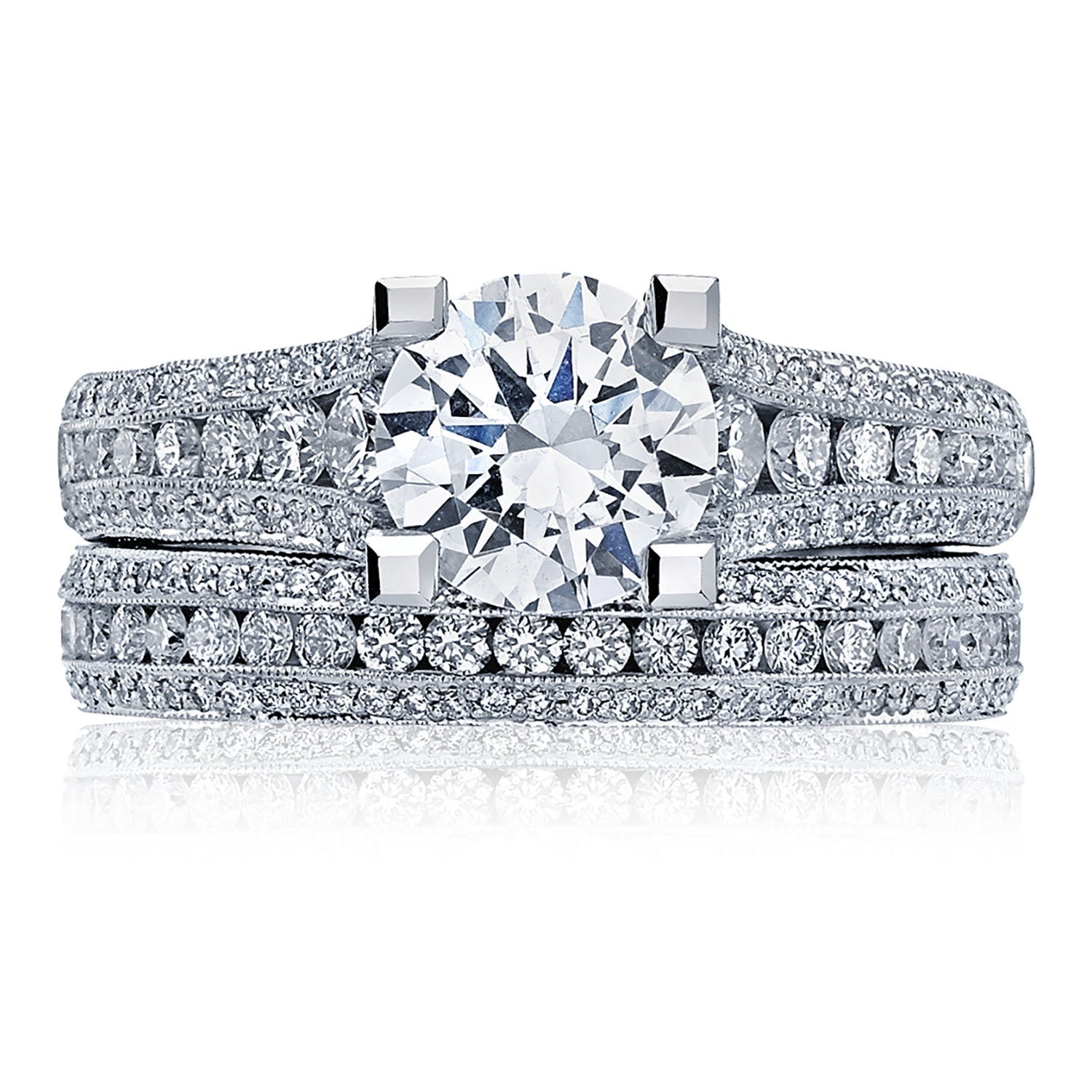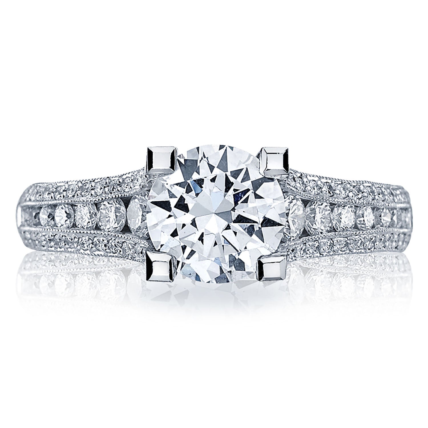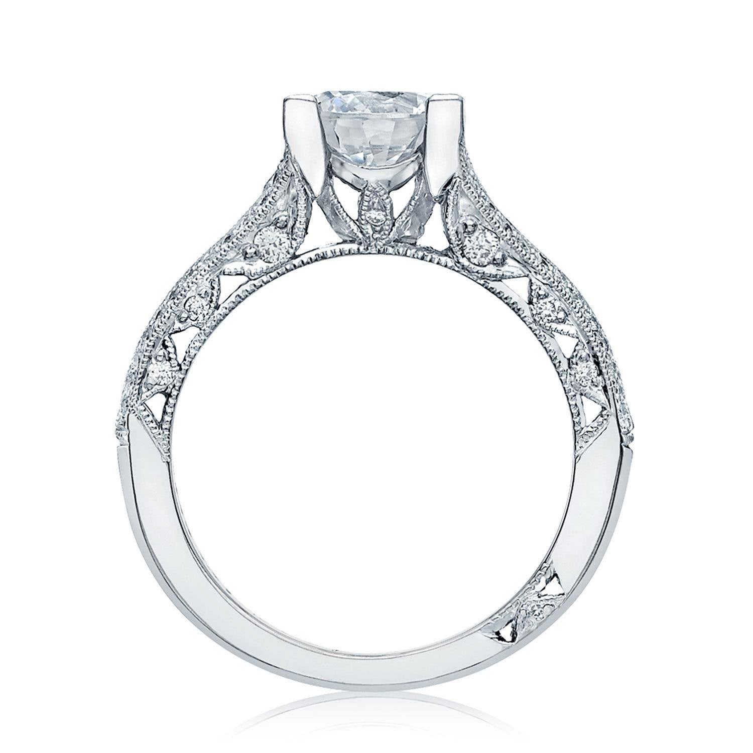 Graduated round diamonds and tapered rows of pavé lead to the round solitaire, set in a contemporary Cathedral Foundation. A Classic Crescent fabric, decorated with more diamond detailing, adds the TACORI Touch to the silhouette of the band.