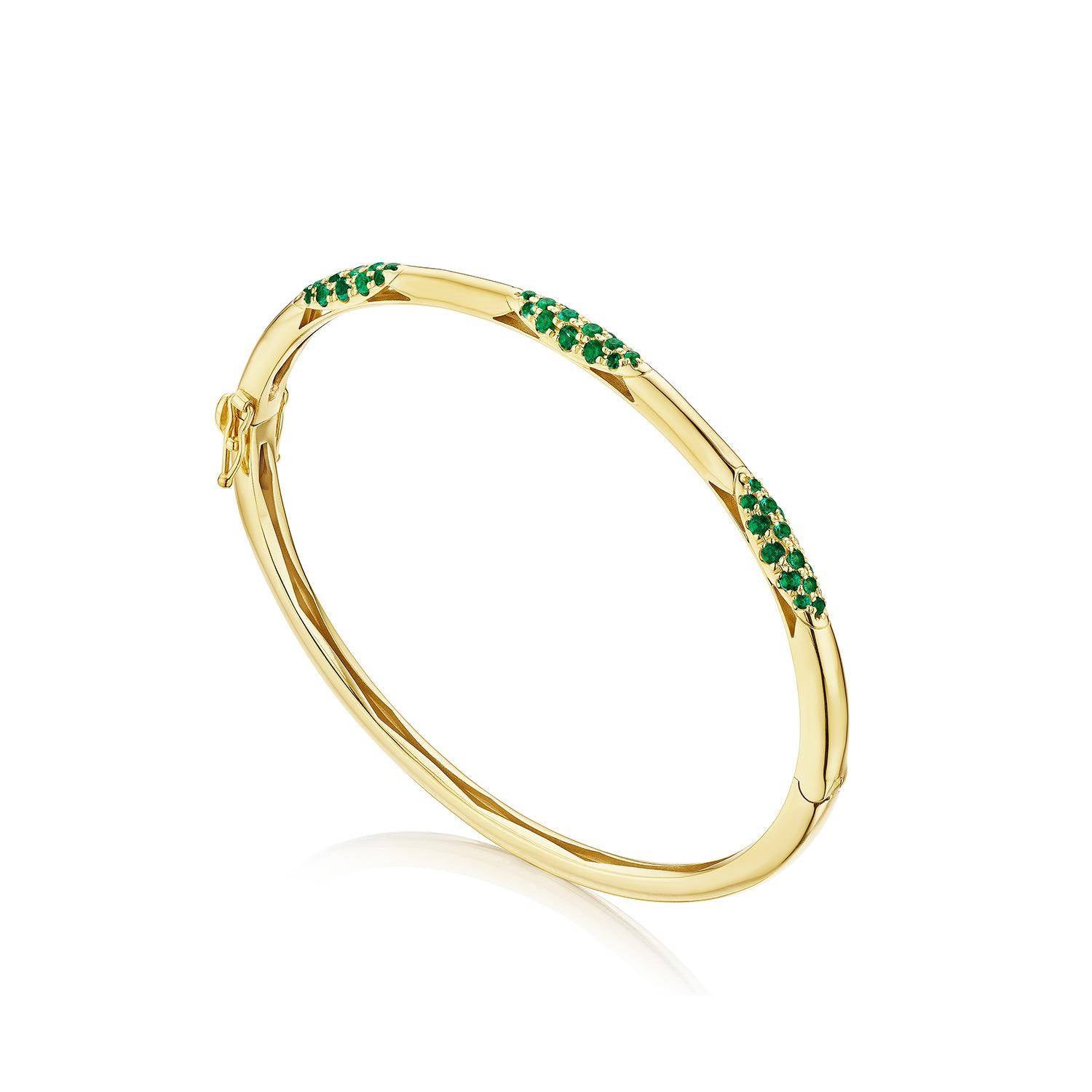 Set on a bold bangle of 18k gold, clean lines are balanced with three ellipse-shaped crescents of round brilliant Diamonds. Sculpted crescent carvings decorate the interior, demonstrating a meticulous attention to detail.