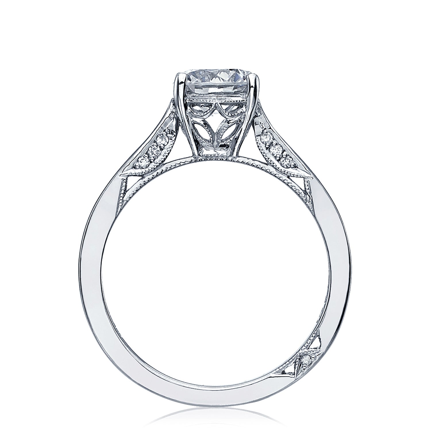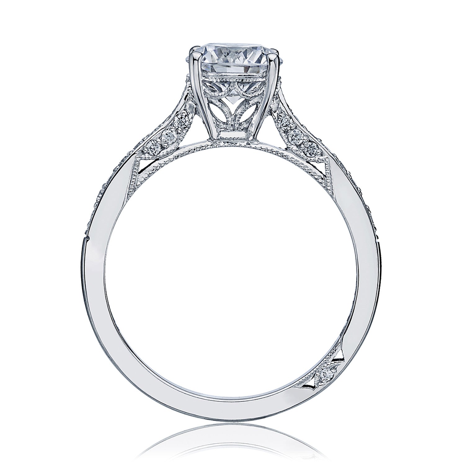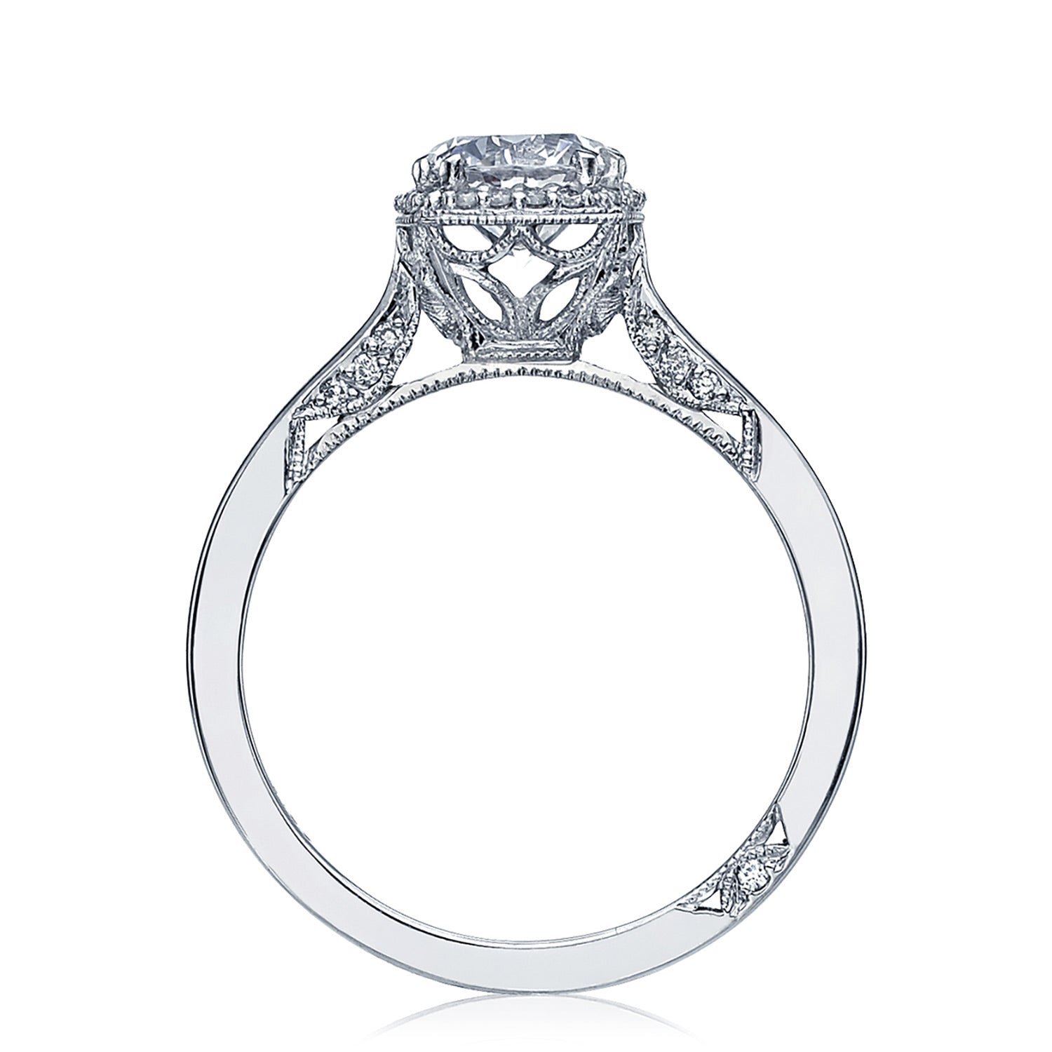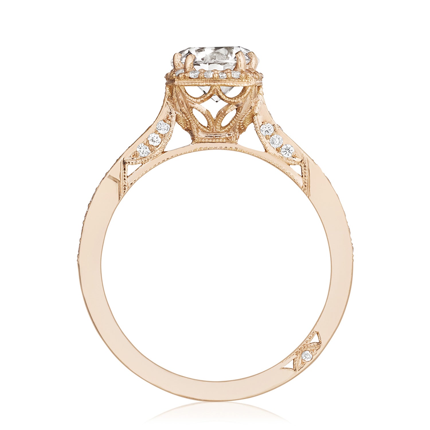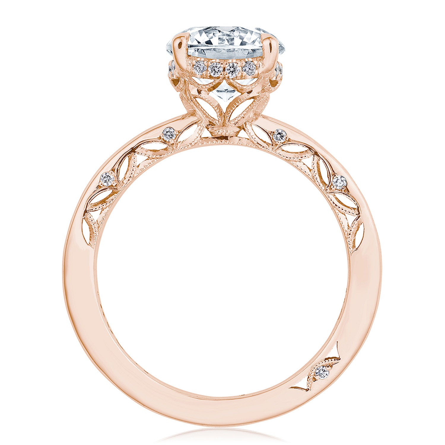 A TACORI bloom elevates the center stone, which rests on a lace-like, milgrian-studded Cathedral foundation. A pavé ceiling branches and embraces the solitaire, while a signature crescent marks the resting point of the ring.