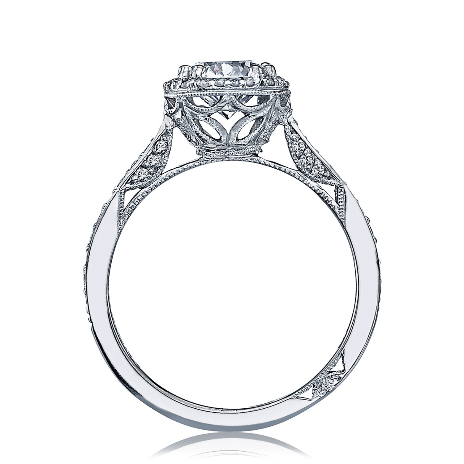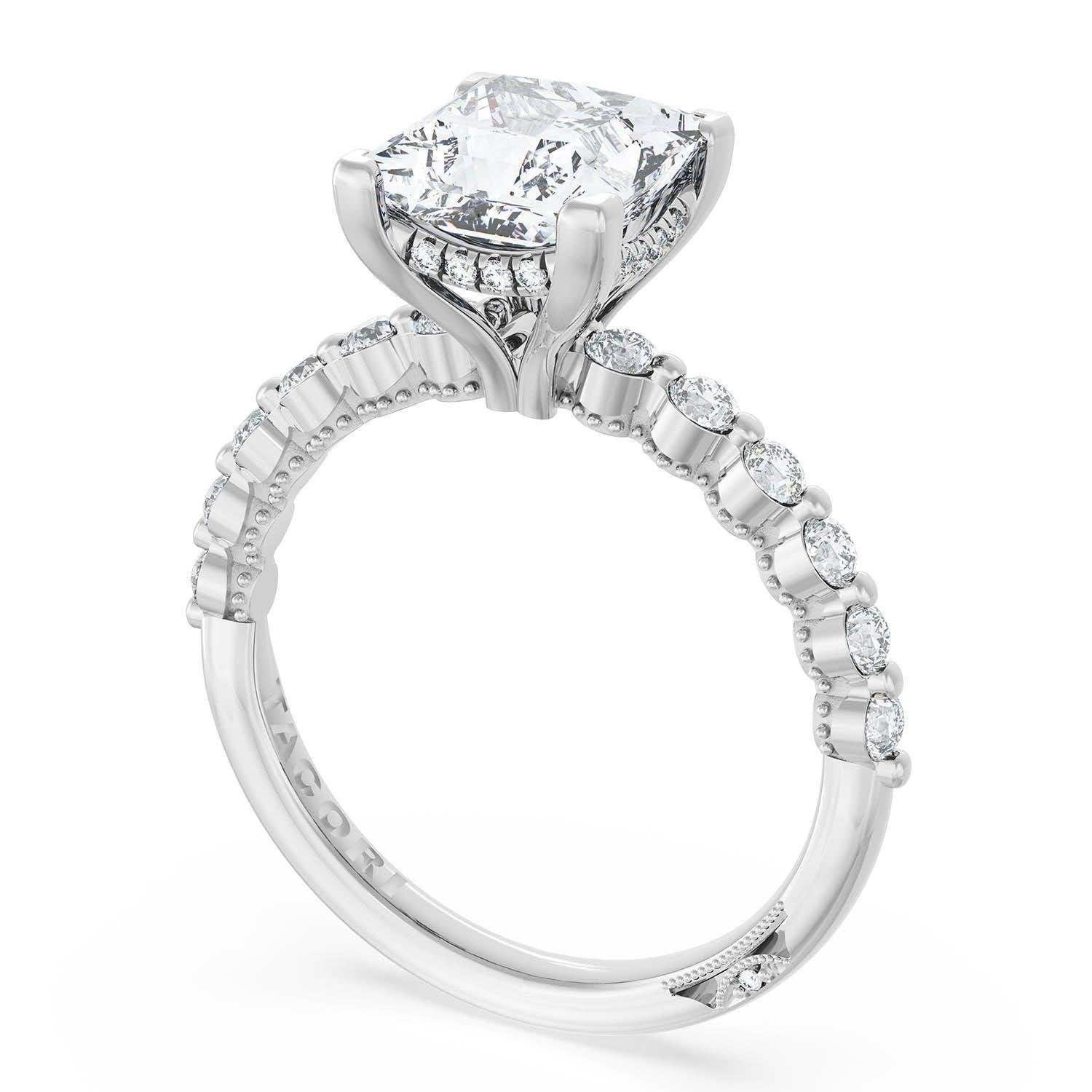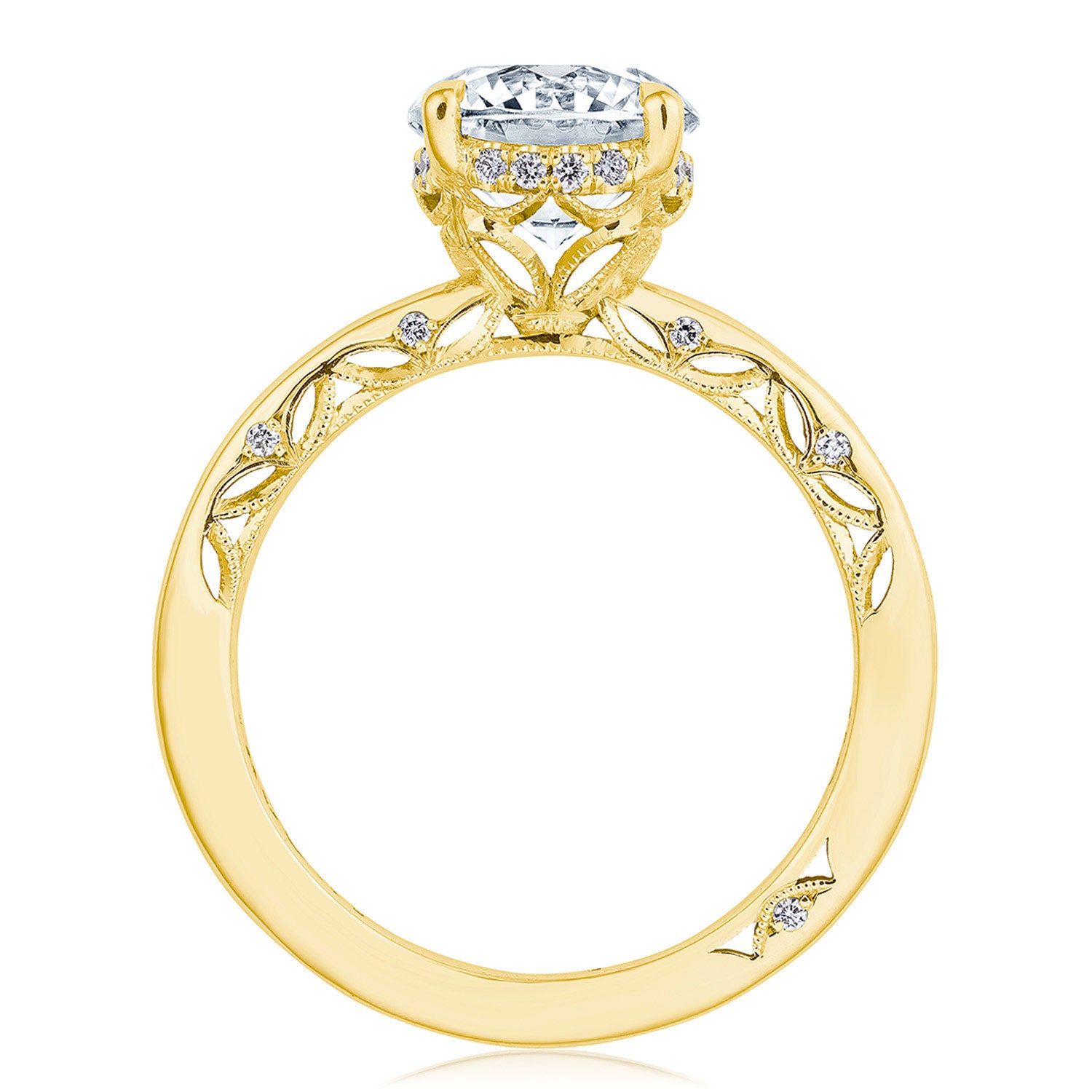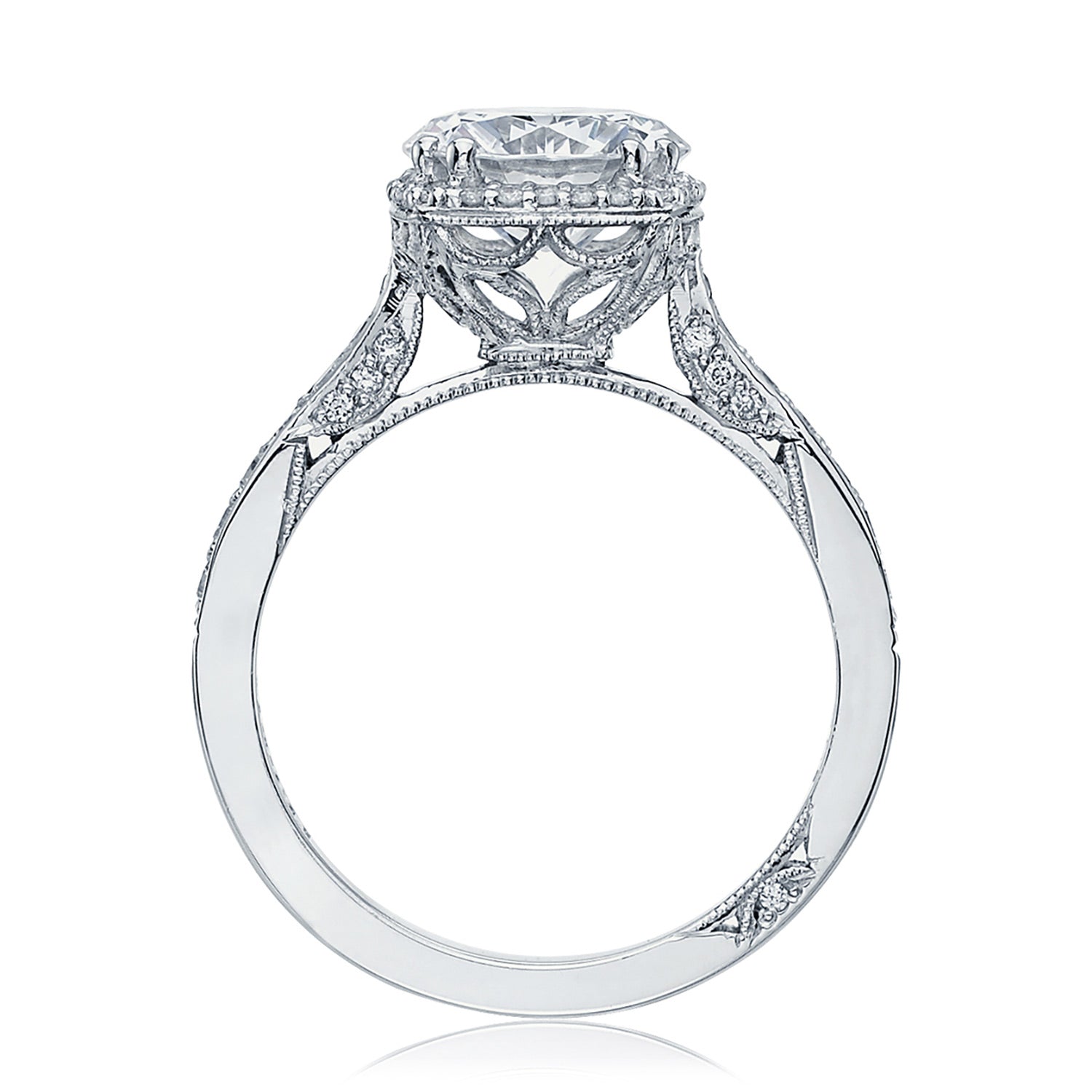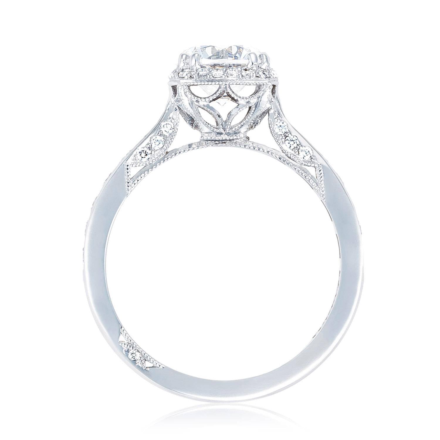 A TACORI bloom elevates the center stone, which rests on a lace-like, milgrian-studded Cathedral foundation. A pavé ceiling branches and embraces the solitaire, while a signature crescent marks the resting point of the ring.