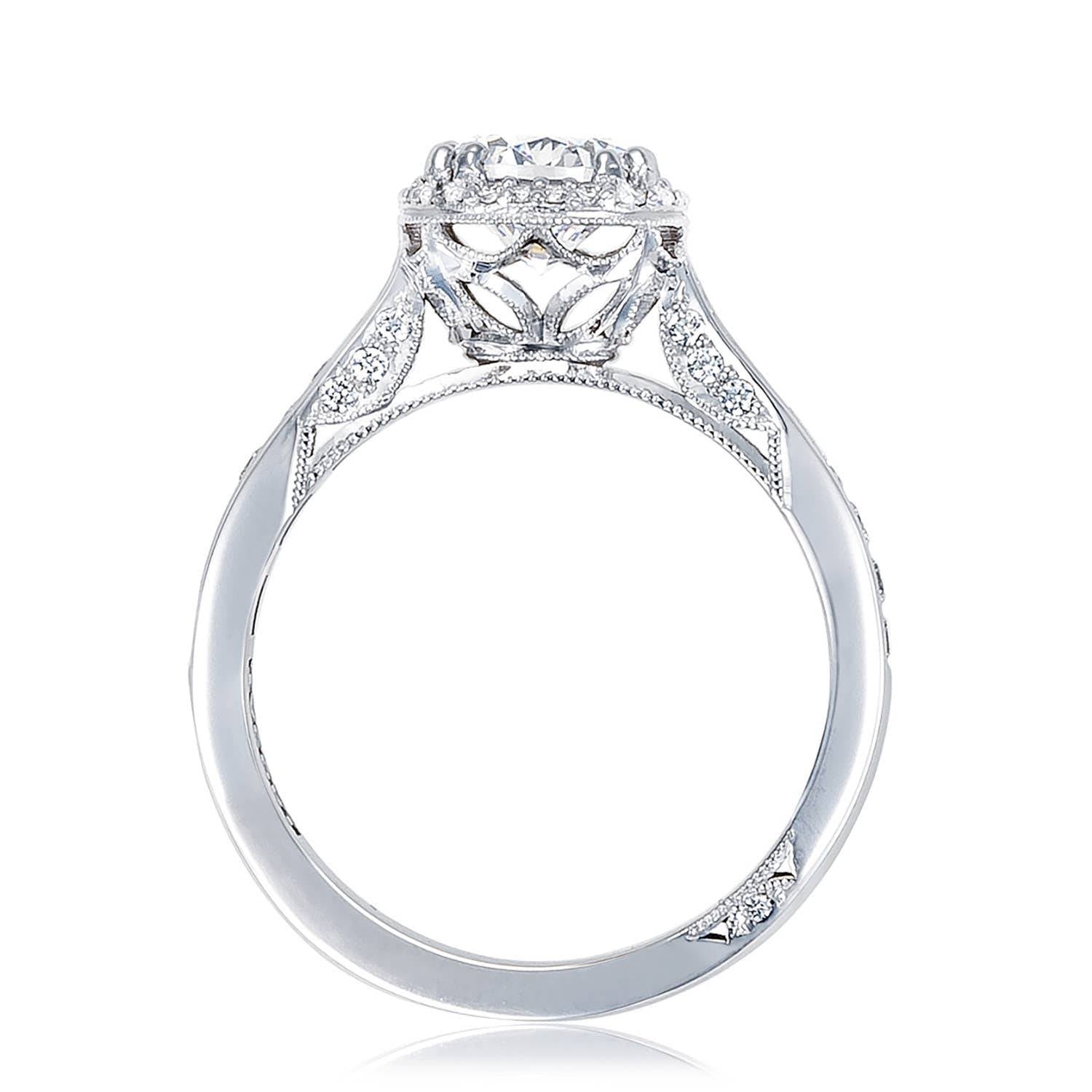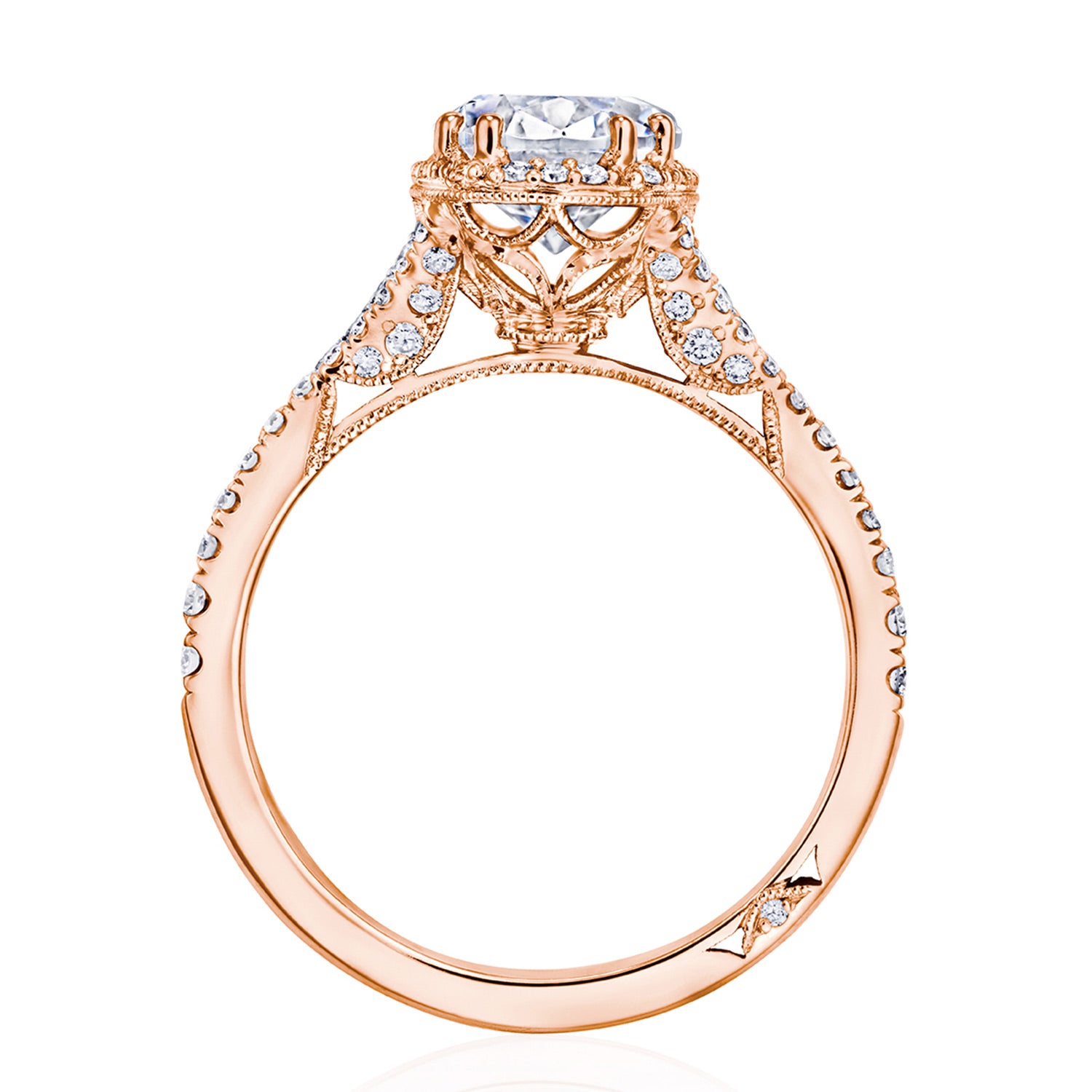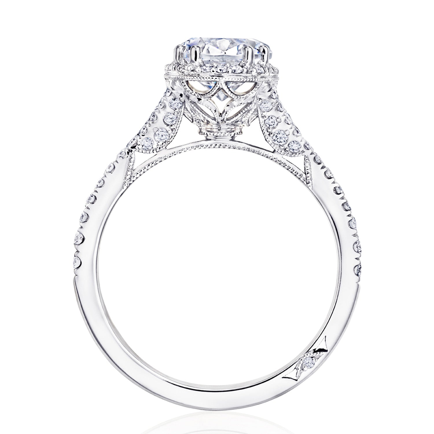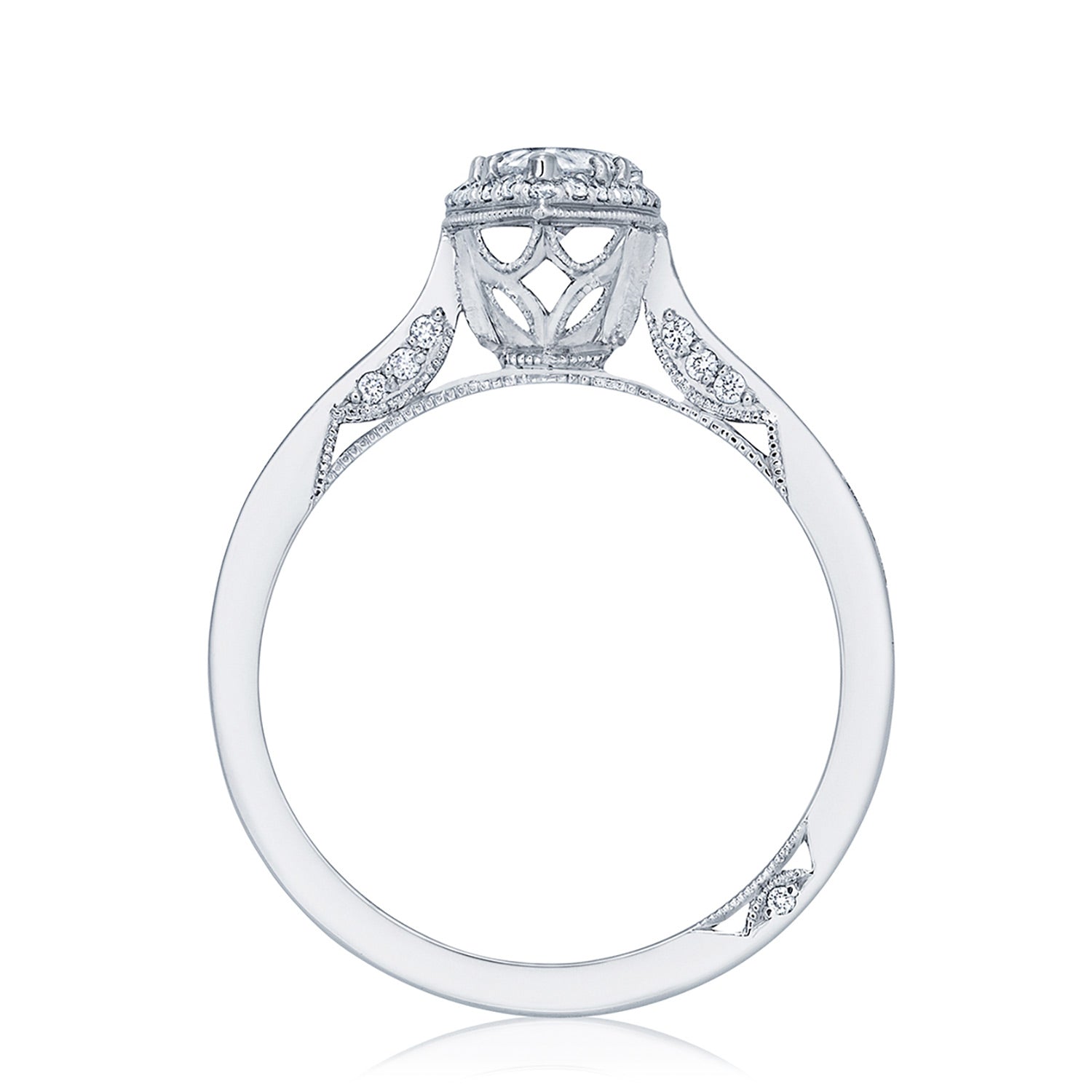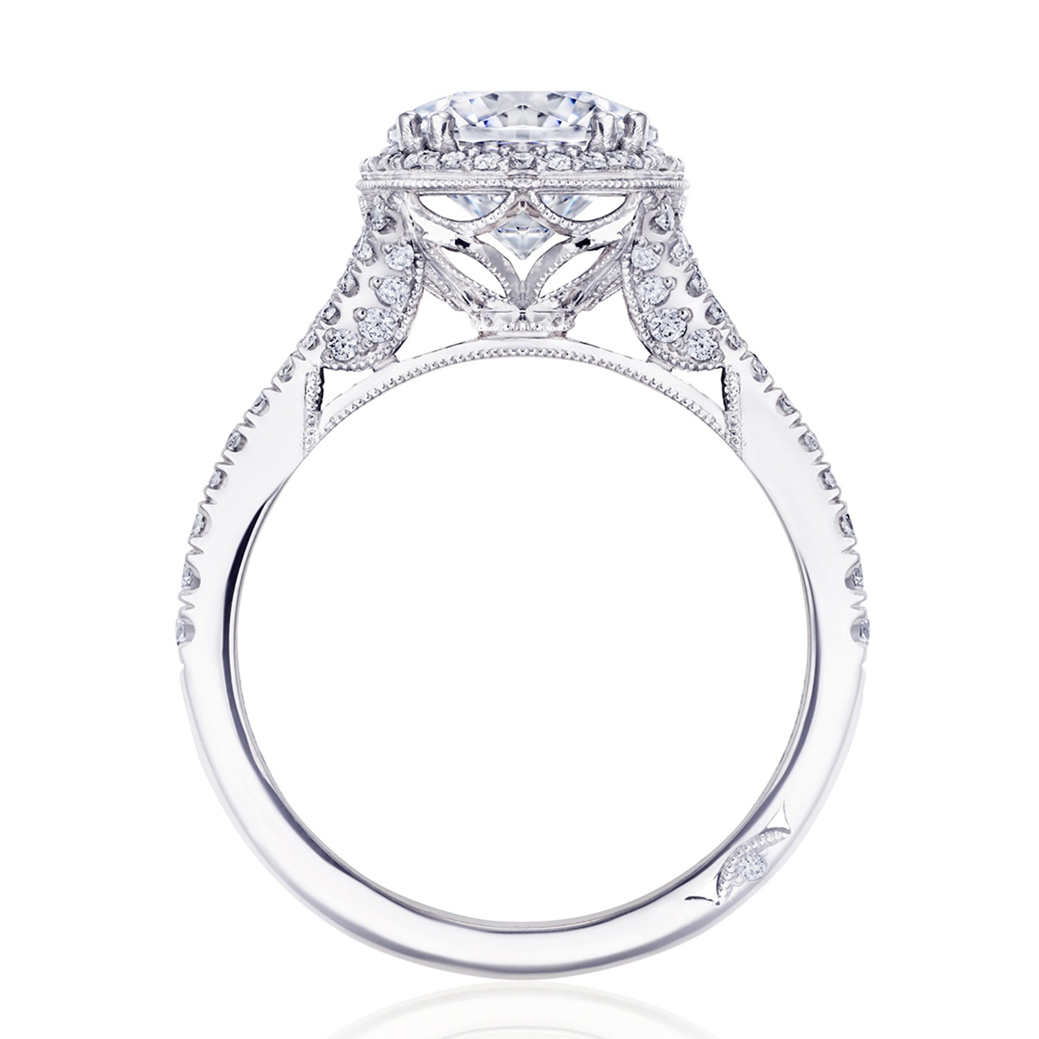 A TACORI bloom elevates the center stone, which rests on a lace-like, milgrian-studded Cathedral foundation. A pavé ceiling branches and embraces the solitaire, while a signature crescent marks the resting point of the ring.