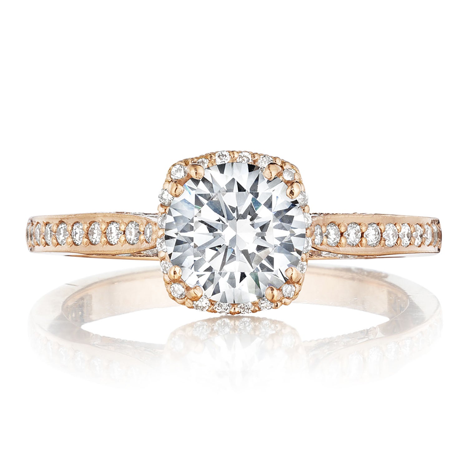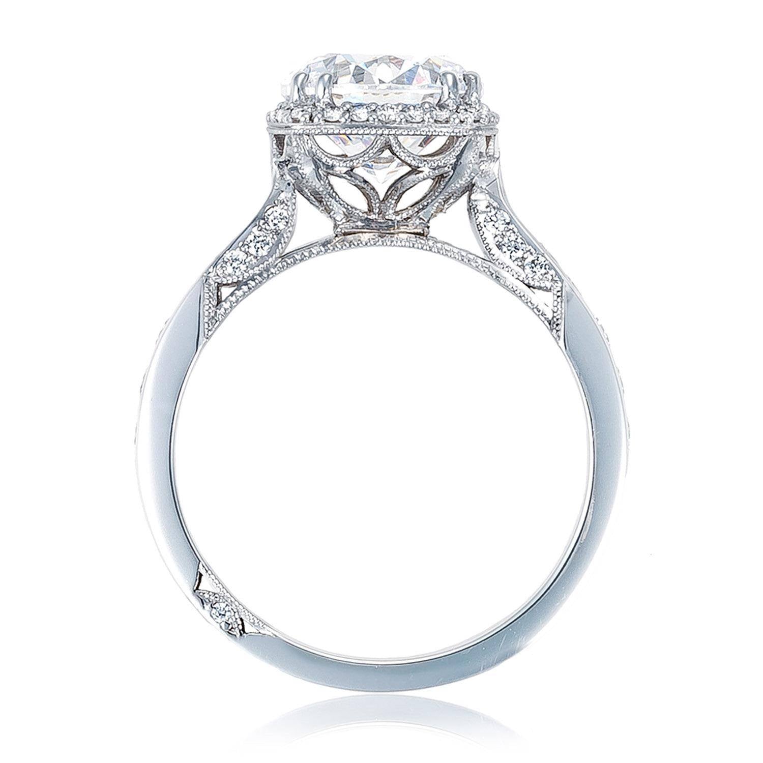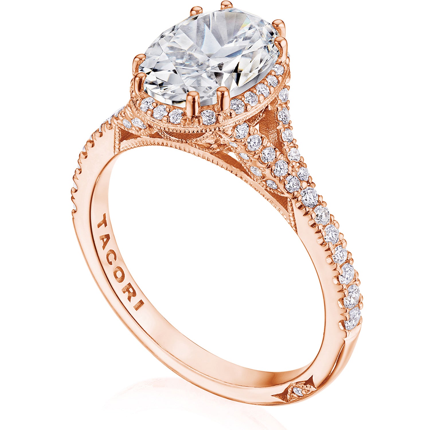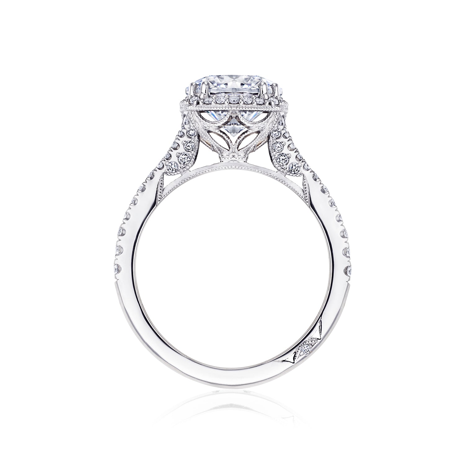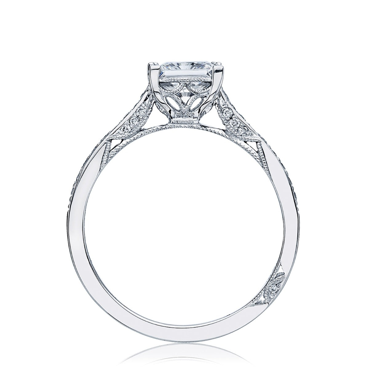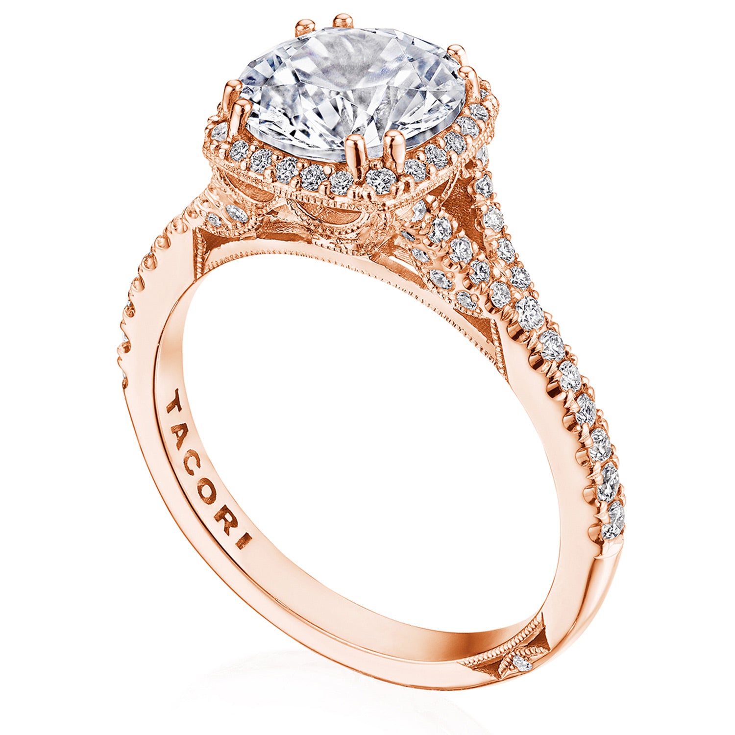 A TACORI bloom elevates the center stone, which rests on a lace-like, milgrian-studded Cathedral foundation. A pavé ceiling branches and embraces the solitaire, while a signature crescent marks the resting point of the ring.
