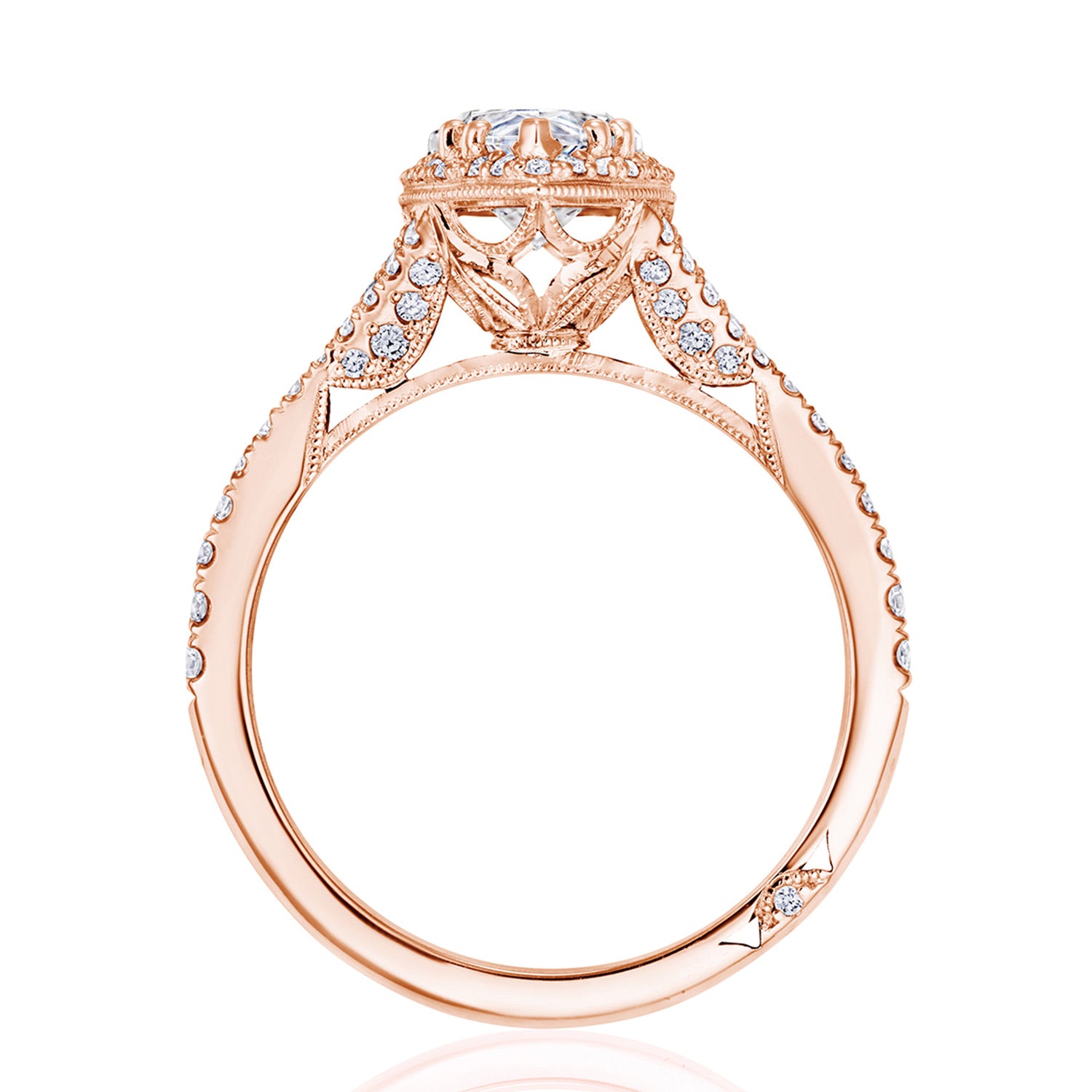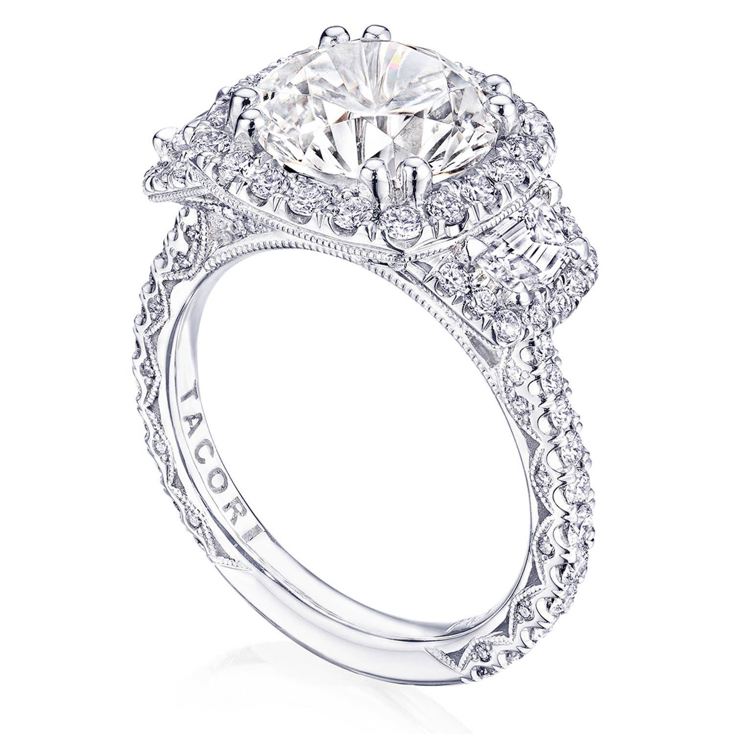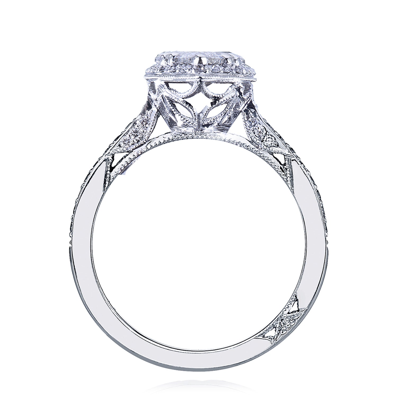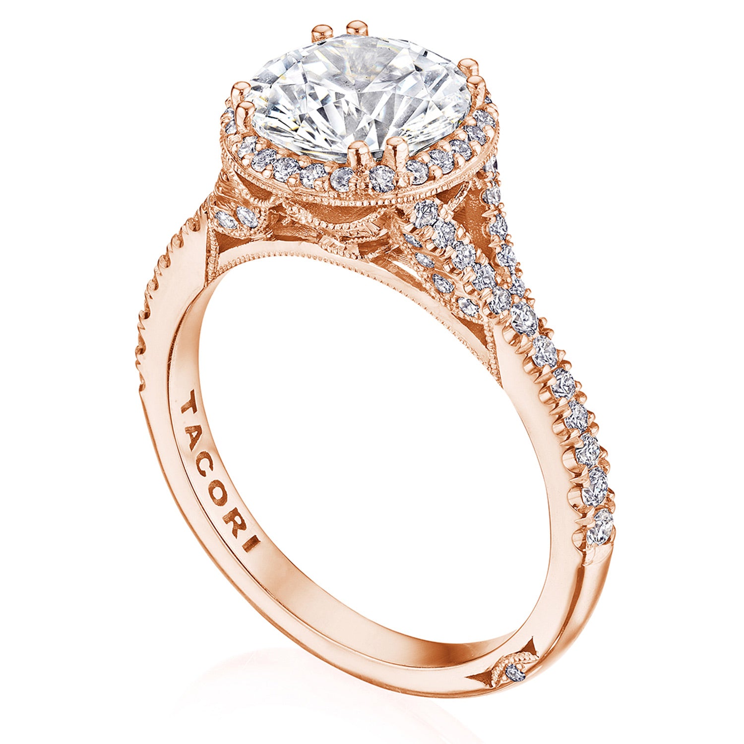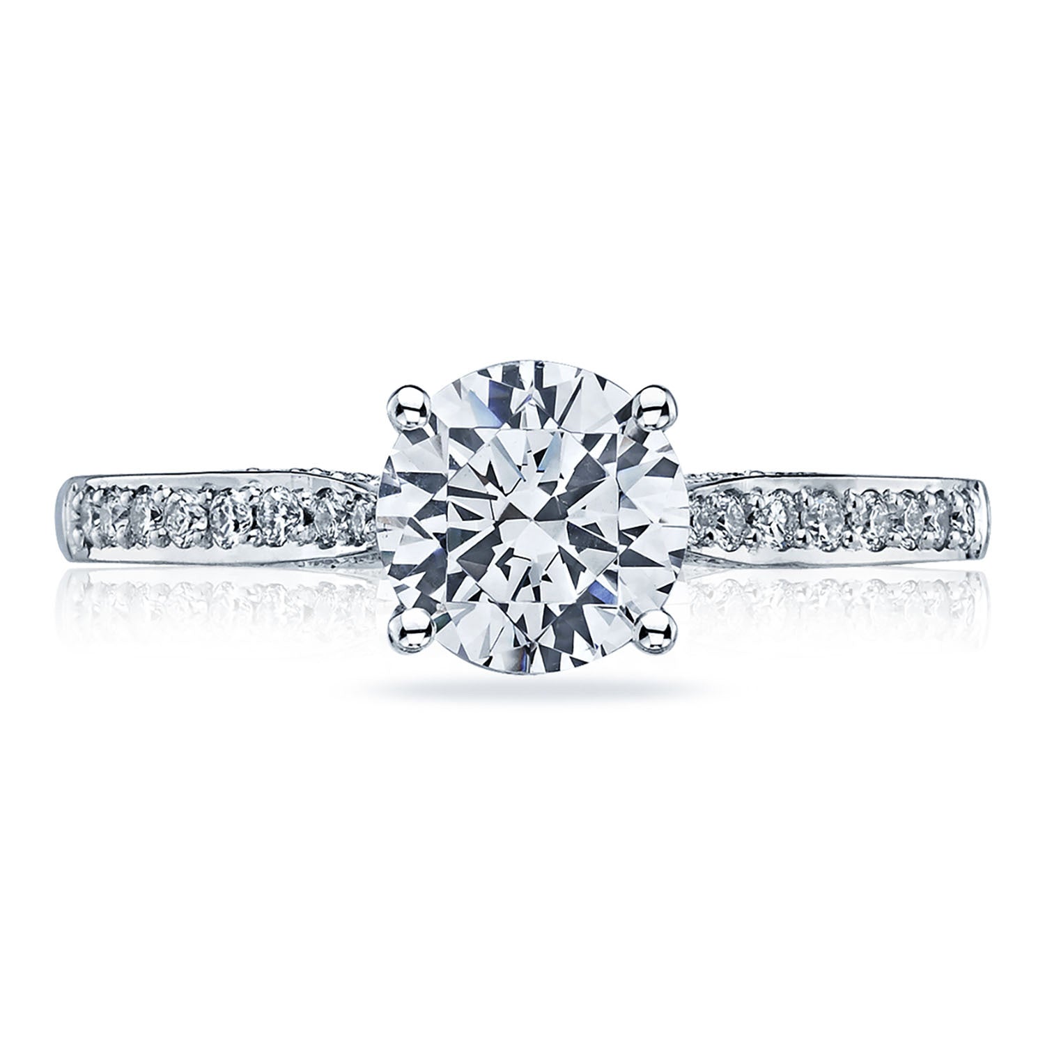 A TACORI bloom elevates the center stone, which rests on a lace-like, milgrian-studded Cathedral foundation. A pavé ceiling branches and embraces the solitaire, while a signature crescent marks the resting point of the ring.