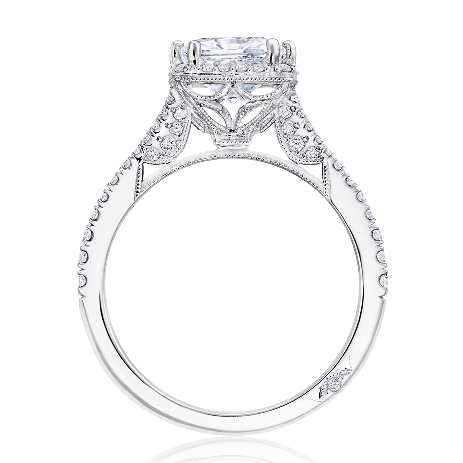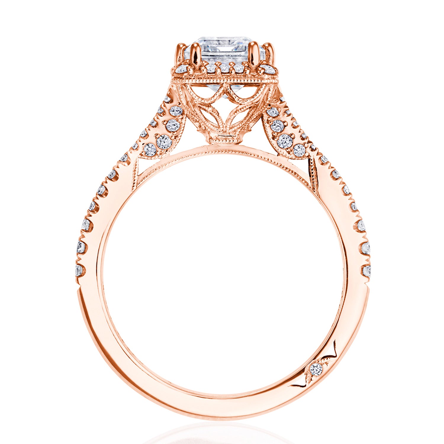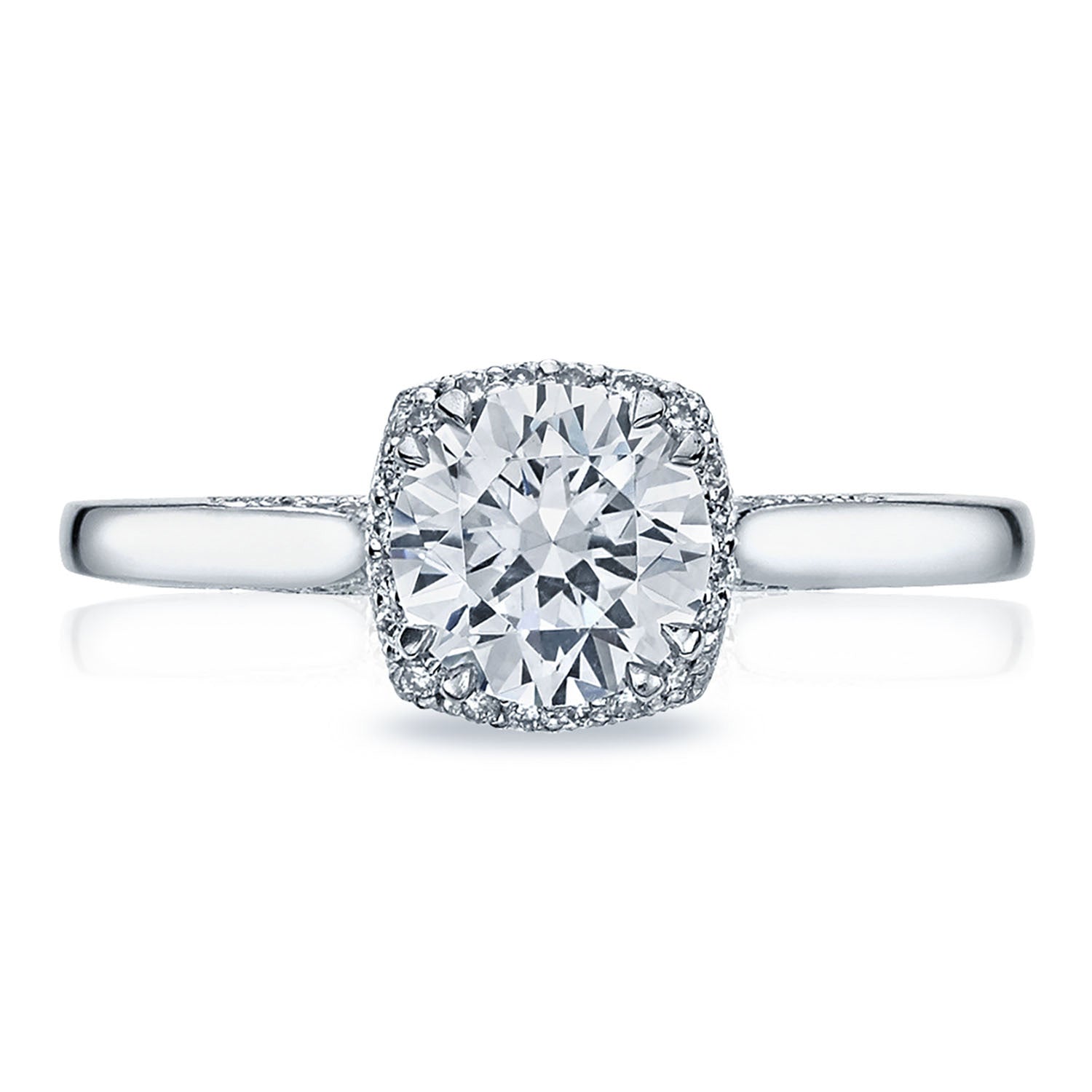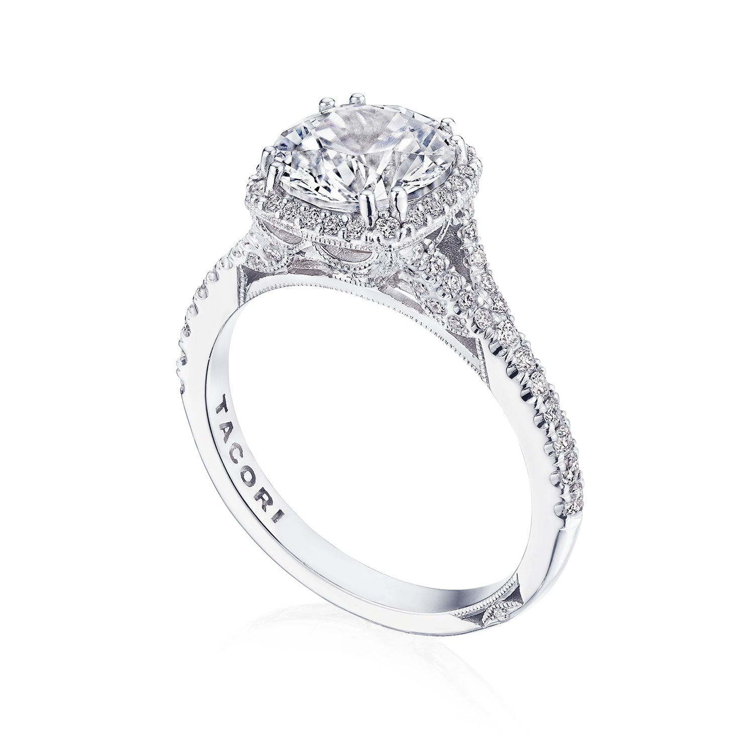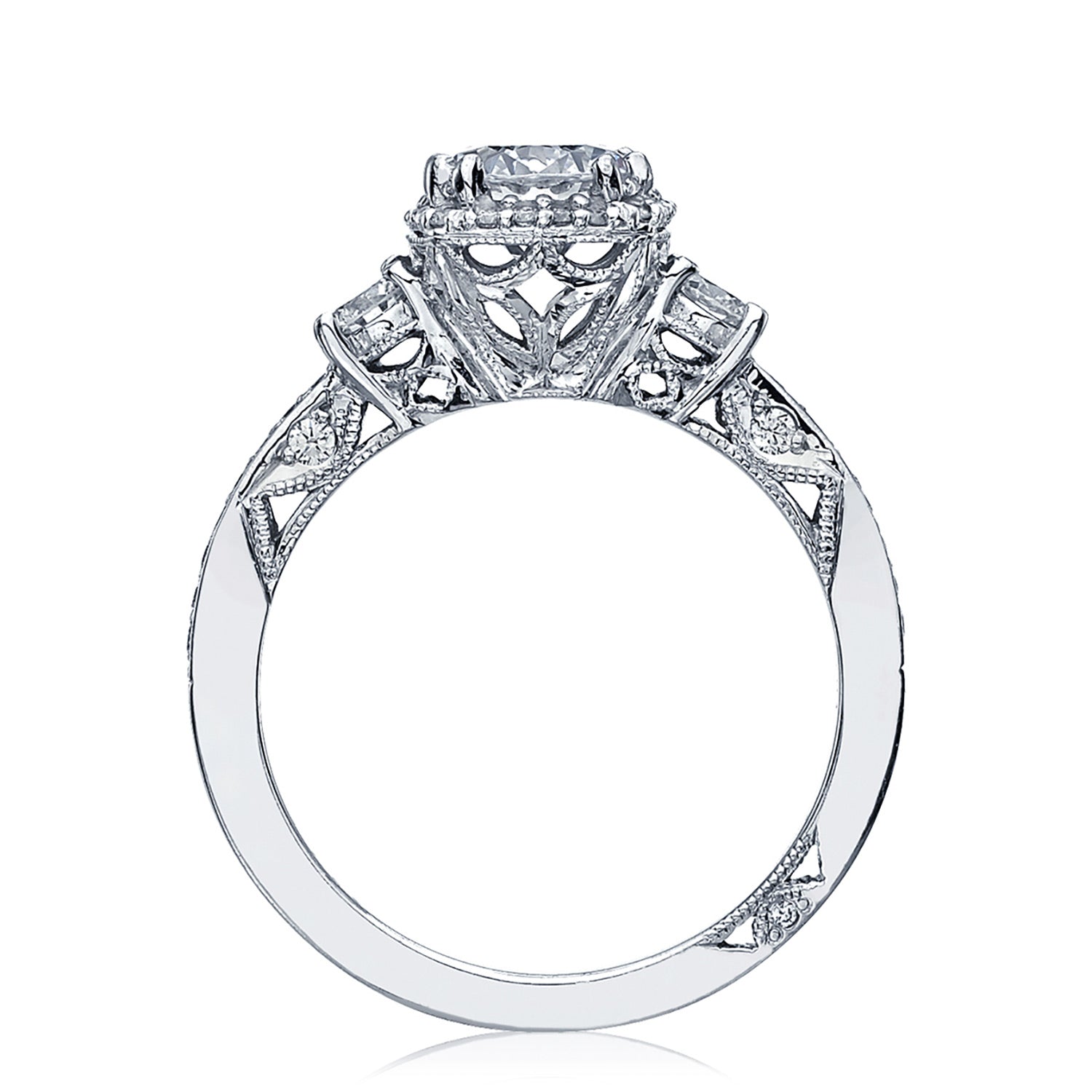 A TACORI bloom elevates the center stone, which rests on a lace-like, milgrian-studded Cathedral foundation. A pavé ceiling branches and embraces the solitaire, while a signature crescent marks the resting point of the ring.
