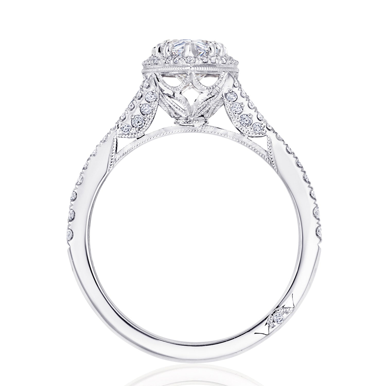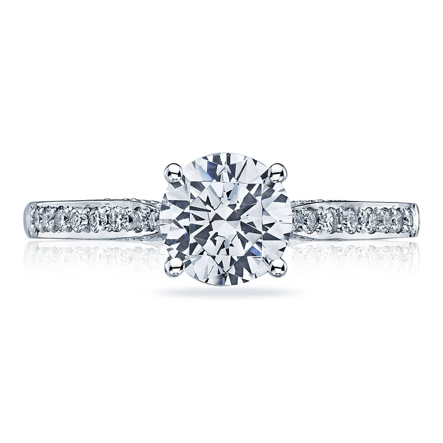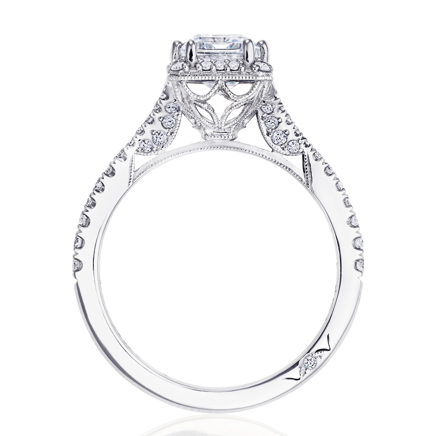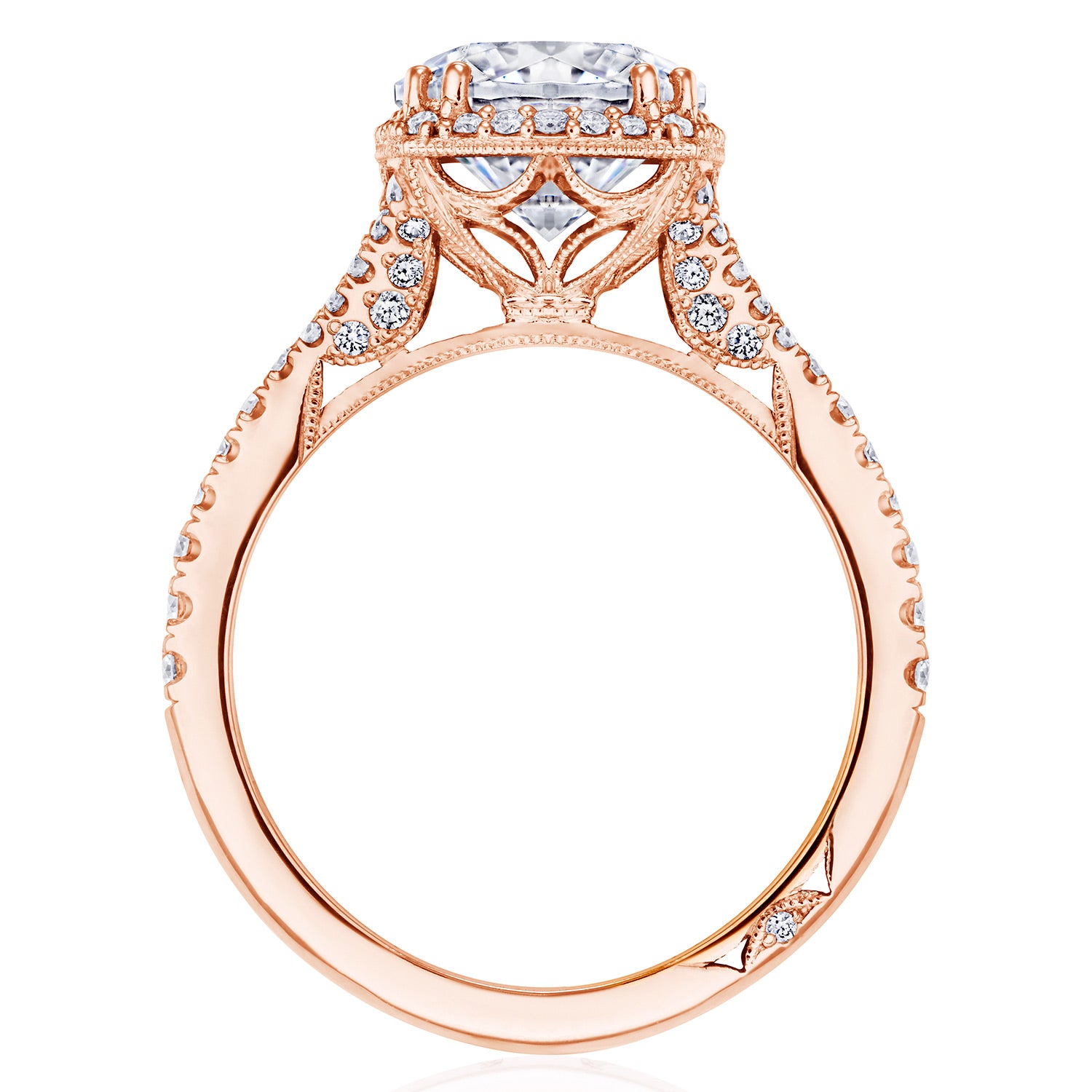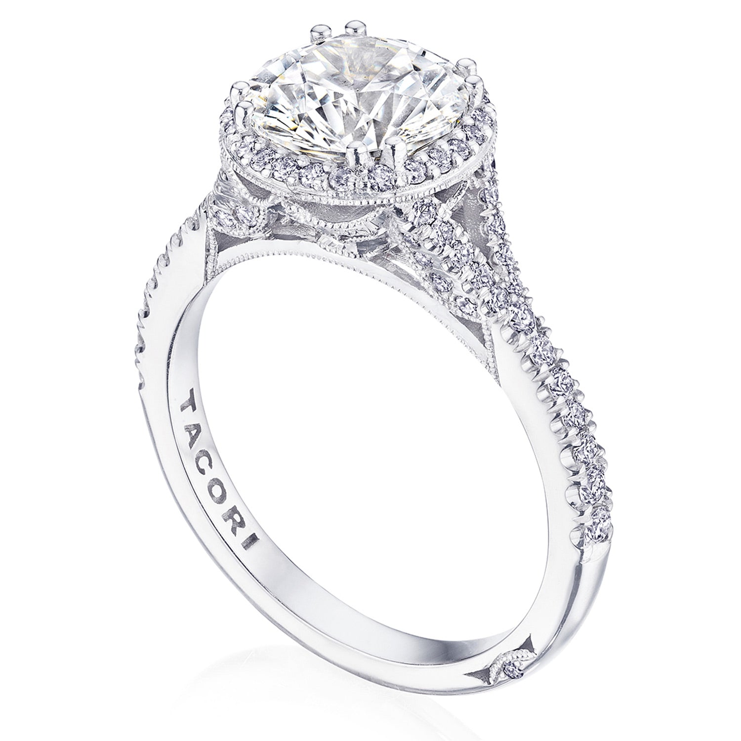 A TACORI bloom elevates the center stone, which rests on a lace-like, milgrian-studded Cathedral foundation. A pavé ceiling branches and embraces the solitaire, while a signature crescent marks the resting point of the ring.