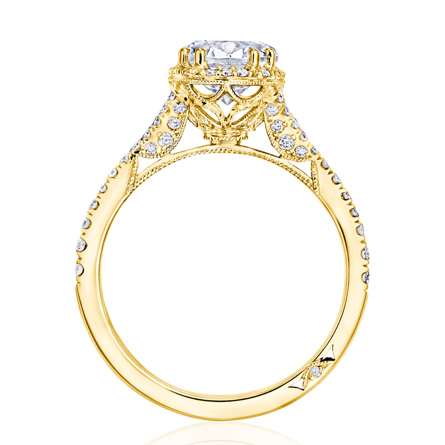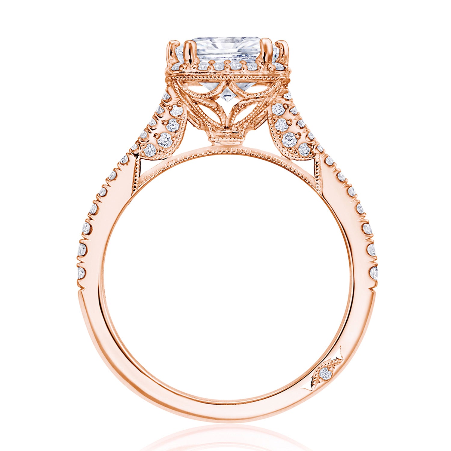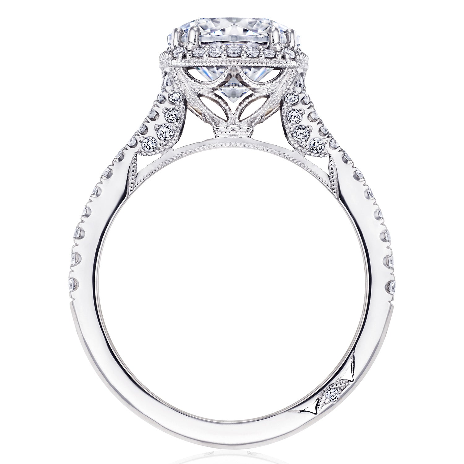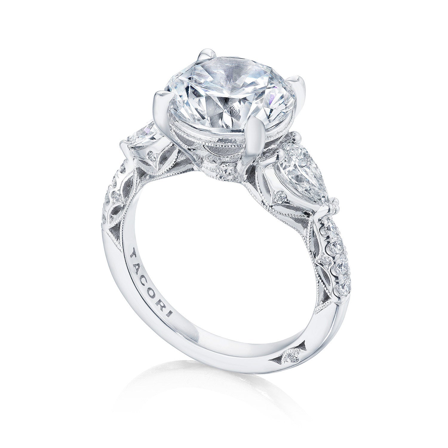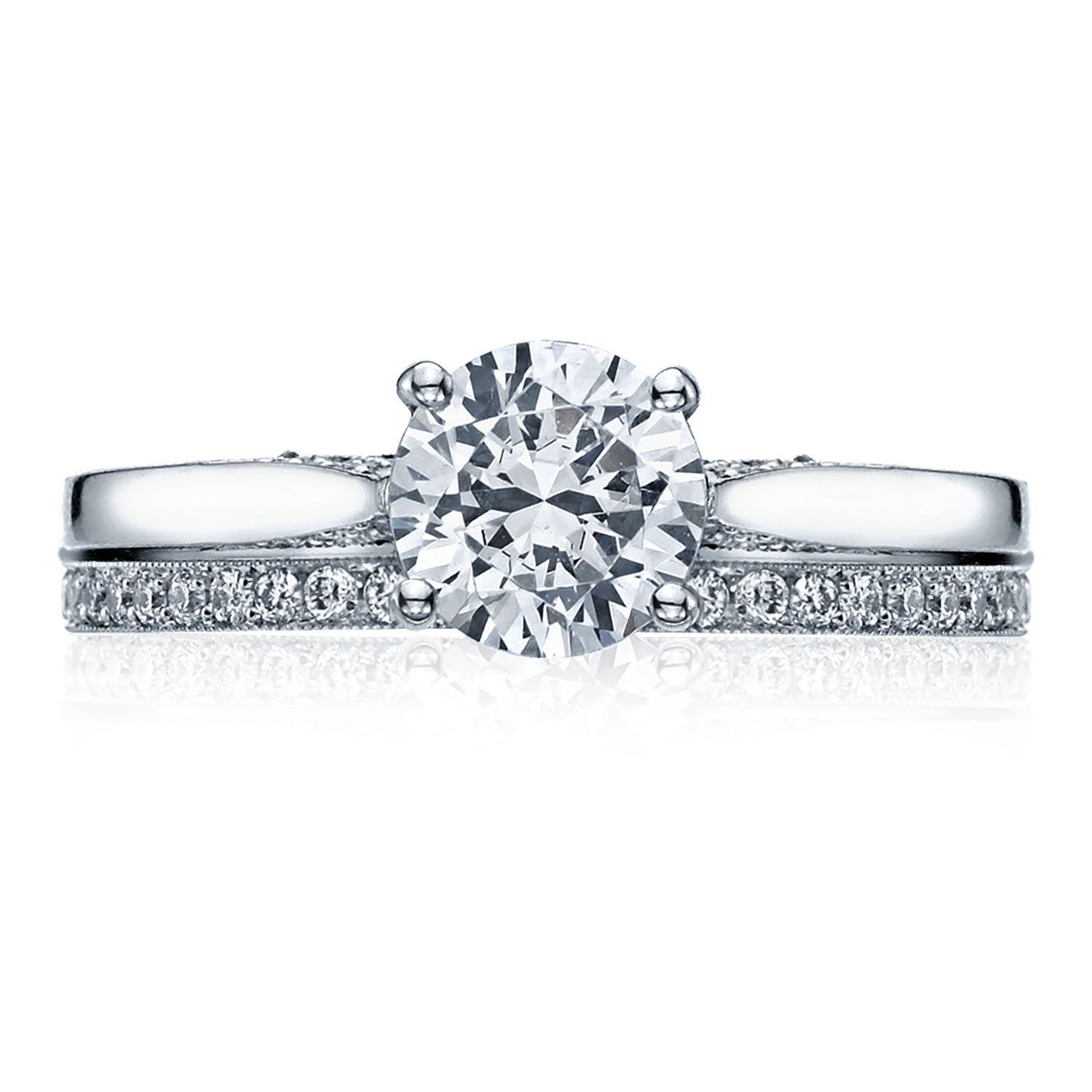 A TACORI bloom elevates the center stone, which rests on a lace-like, milgrian-studded Cathedral foundation. A pavé ceiling branches and embraces the solitaire, while a signature crescent marks the resting point of the ring.
