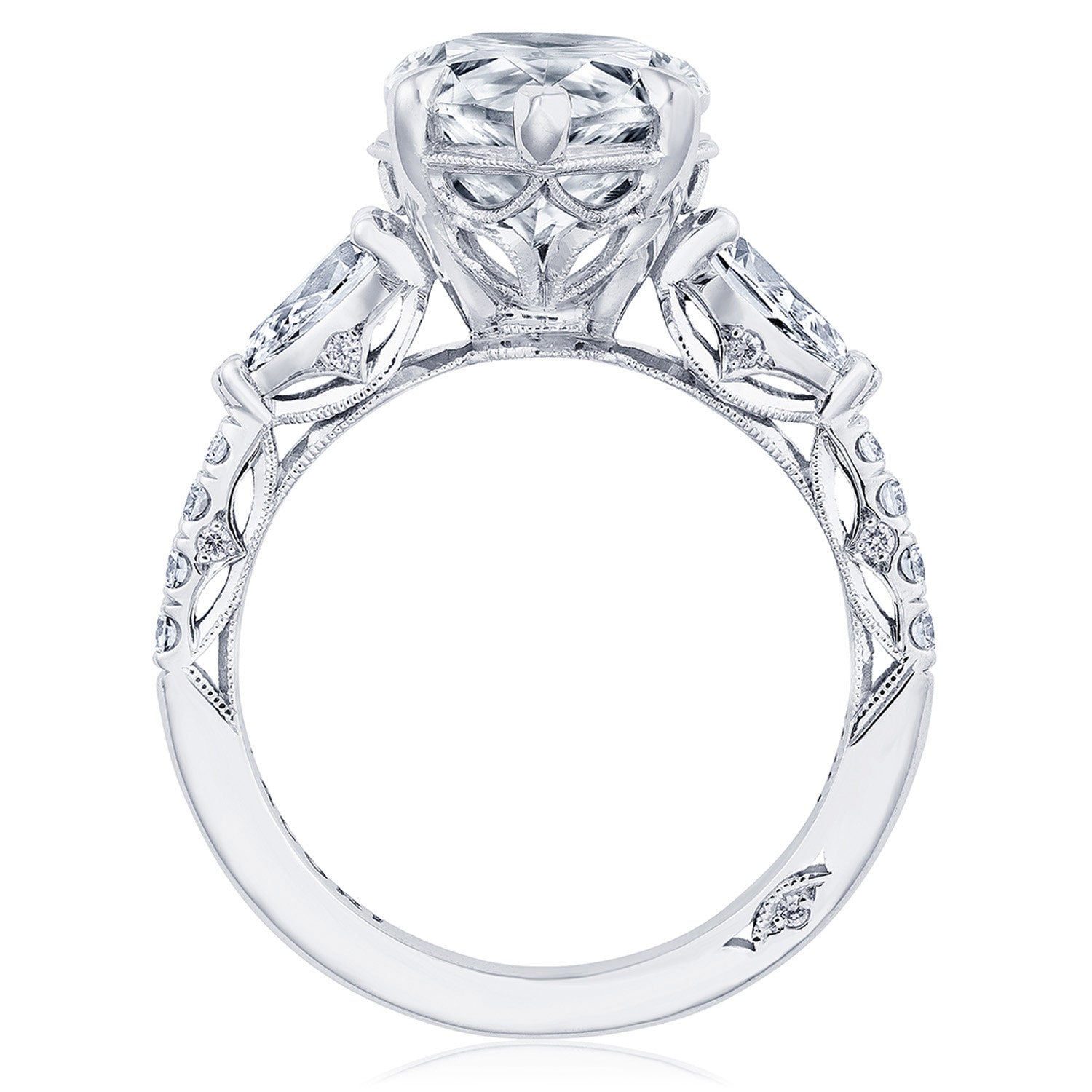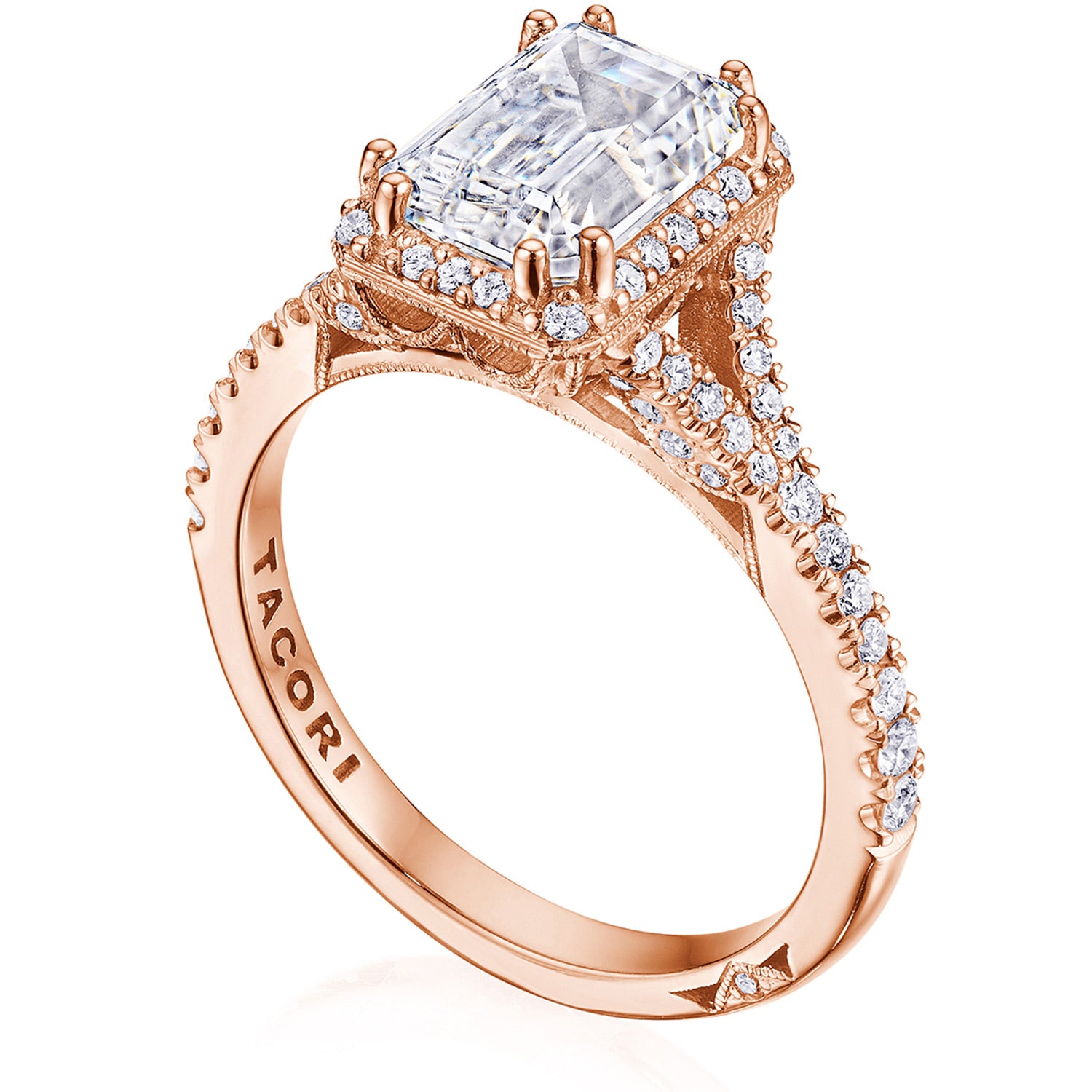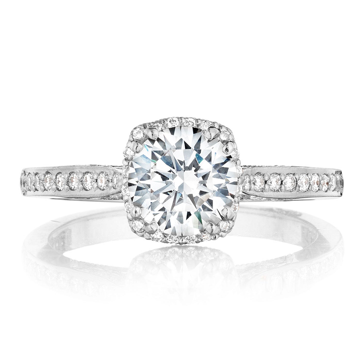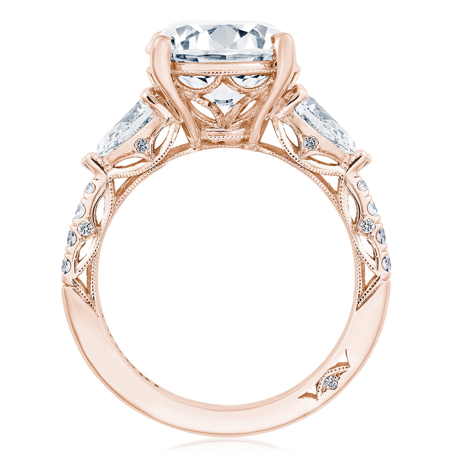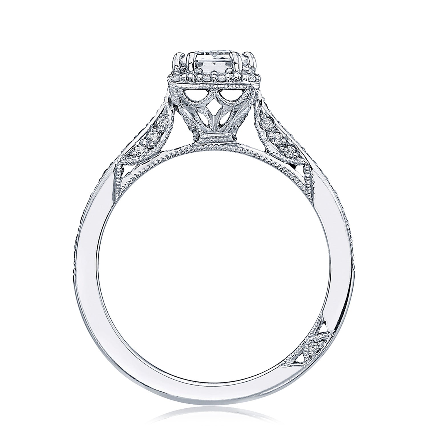 A TACORI bloom elevates the center stone, which rests on a lace-like, milgrian-studded Cathedral foundation. A pavé ceiling branches and embraces the solitaire, while a signature crescent marks the resting point of the ring.