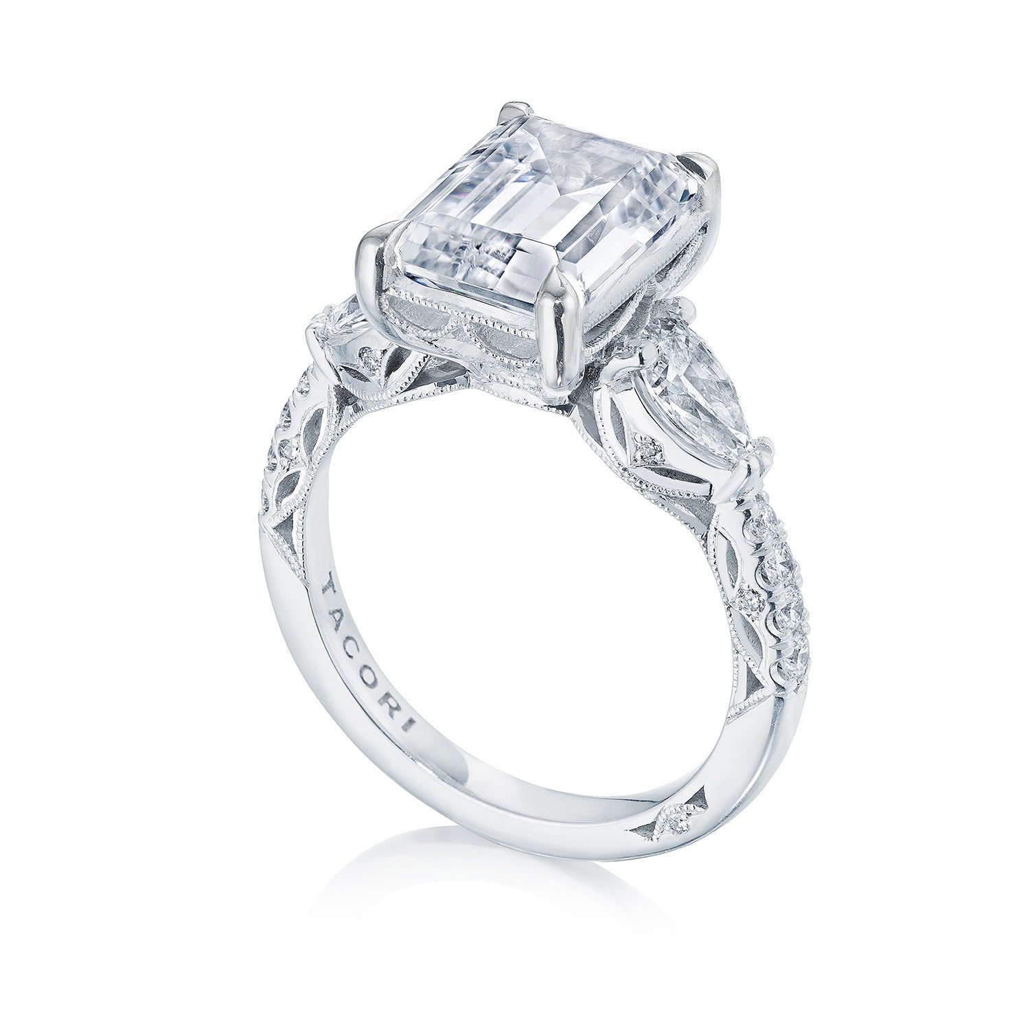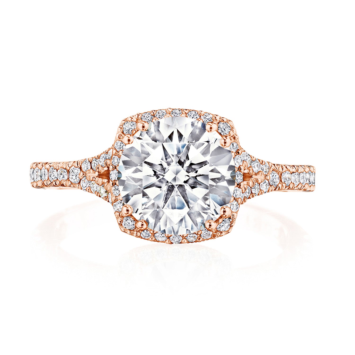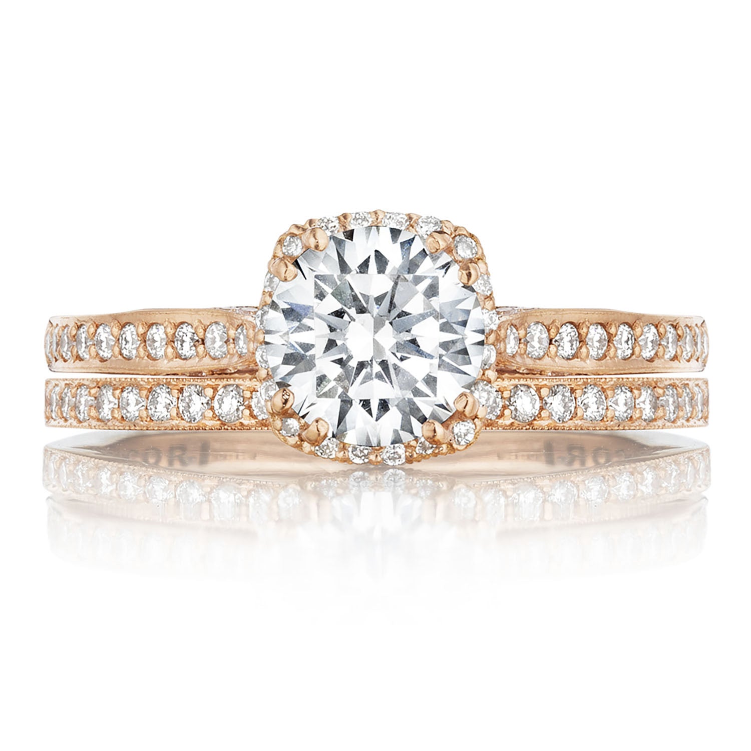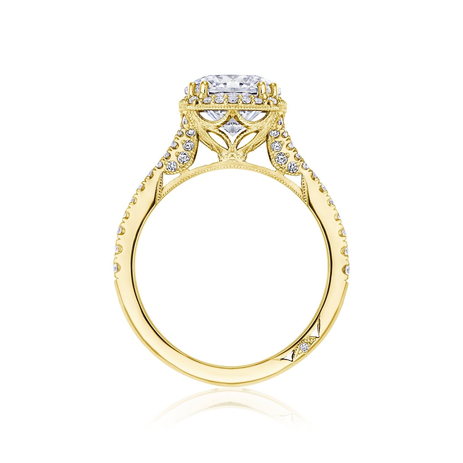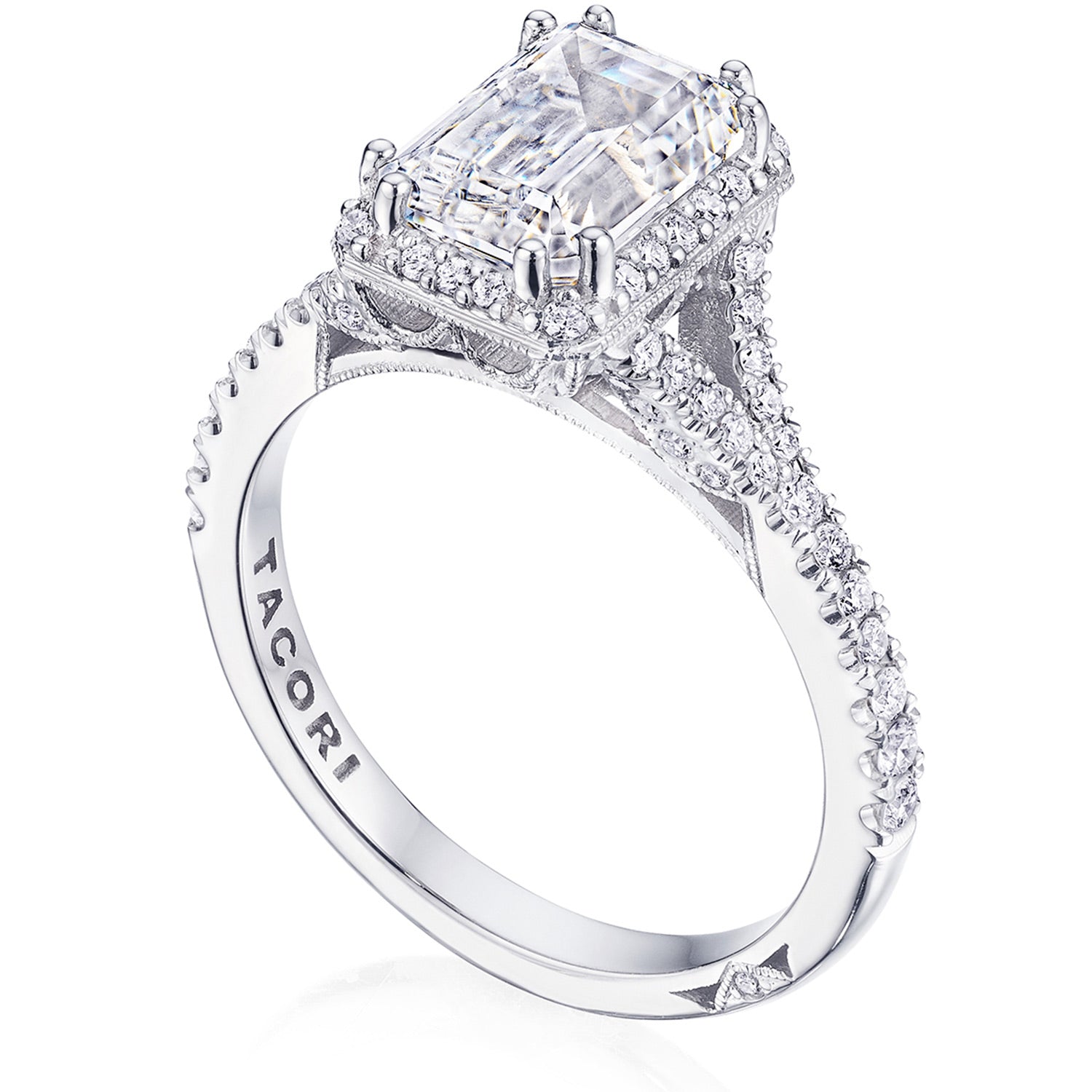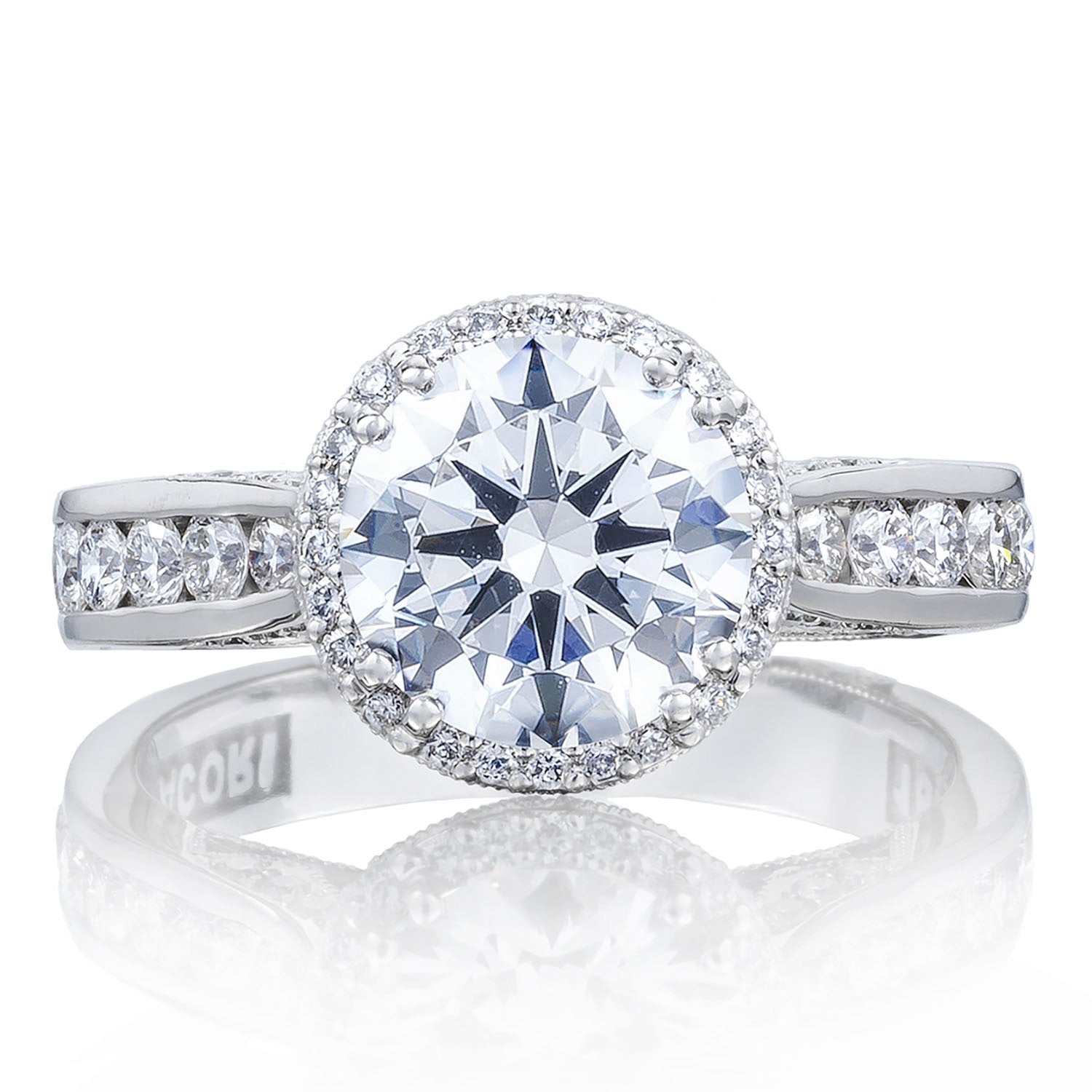 A TACORI bloom elevates the center stone, which rests on a lace-like, milgrian-studded Cathedral foundation. A pavé ceiling branches and embraces the solitaire, while a signature crescent marks the resting point of the ring.