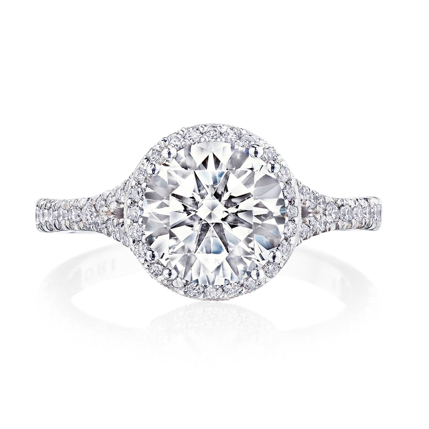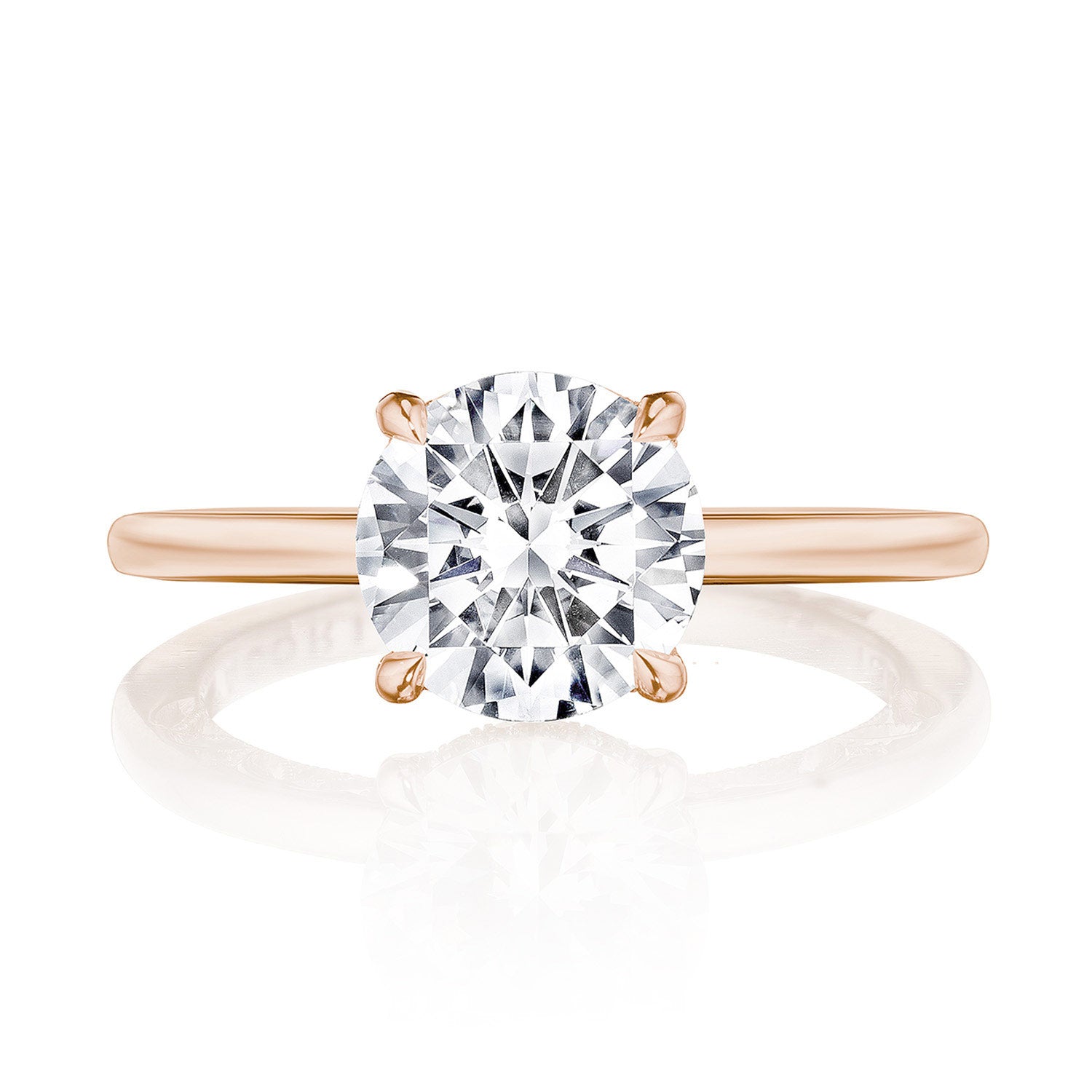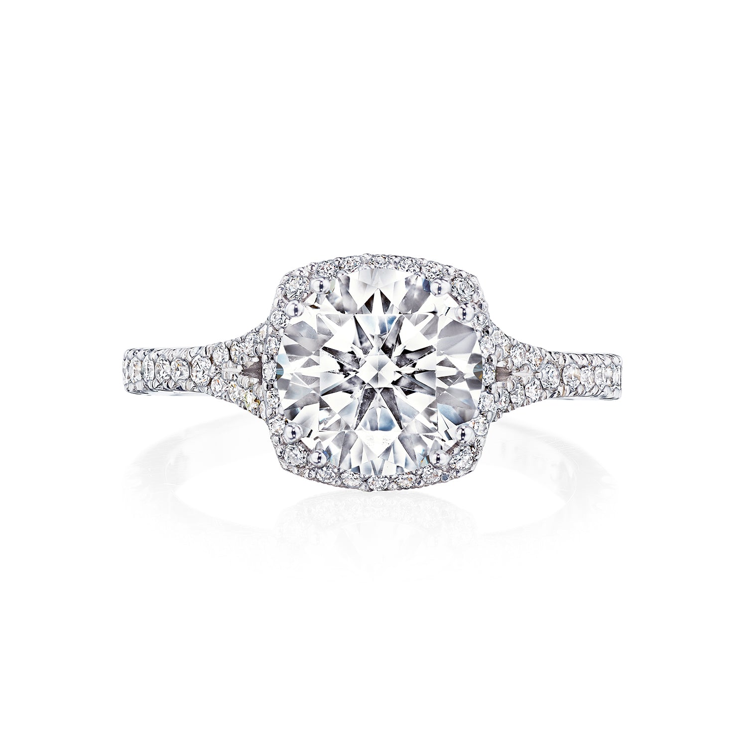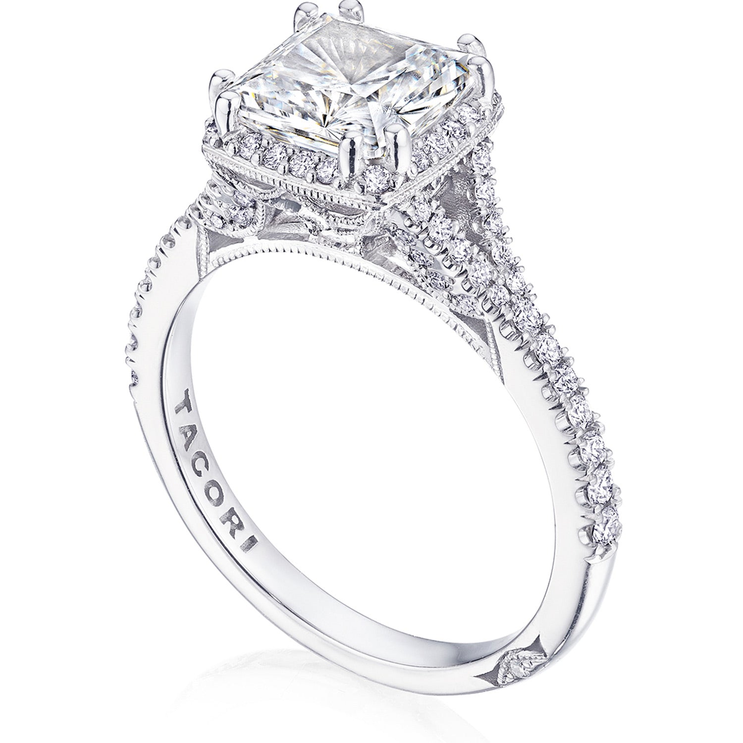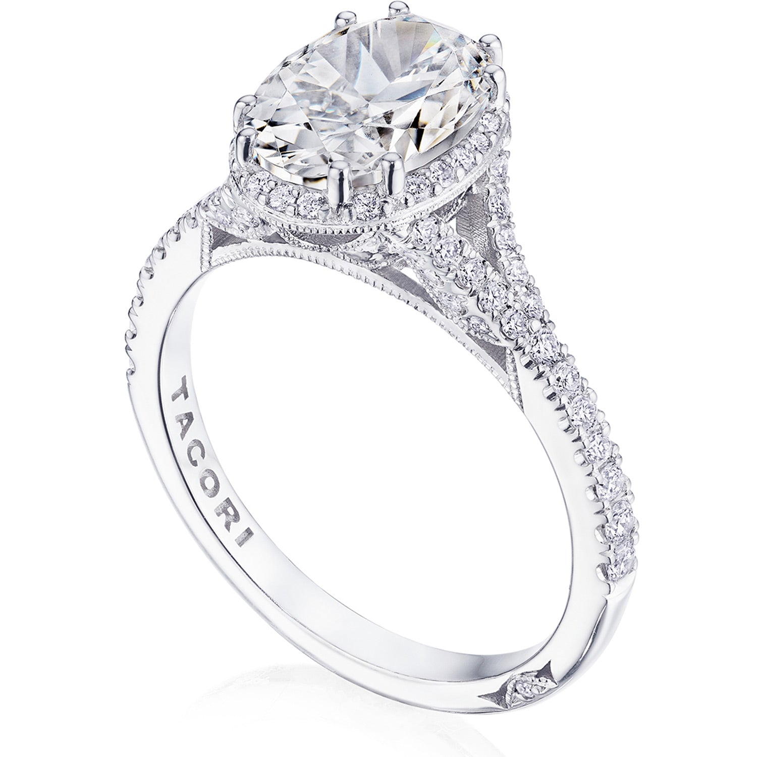 A TACORI bloom elevates the center stone, which rests on a lace-like, milgrian-studded Cathedral foundation. A pavé ceiling branches and embraces the solitaire, while a signature crescent marks the resting point of the ring.