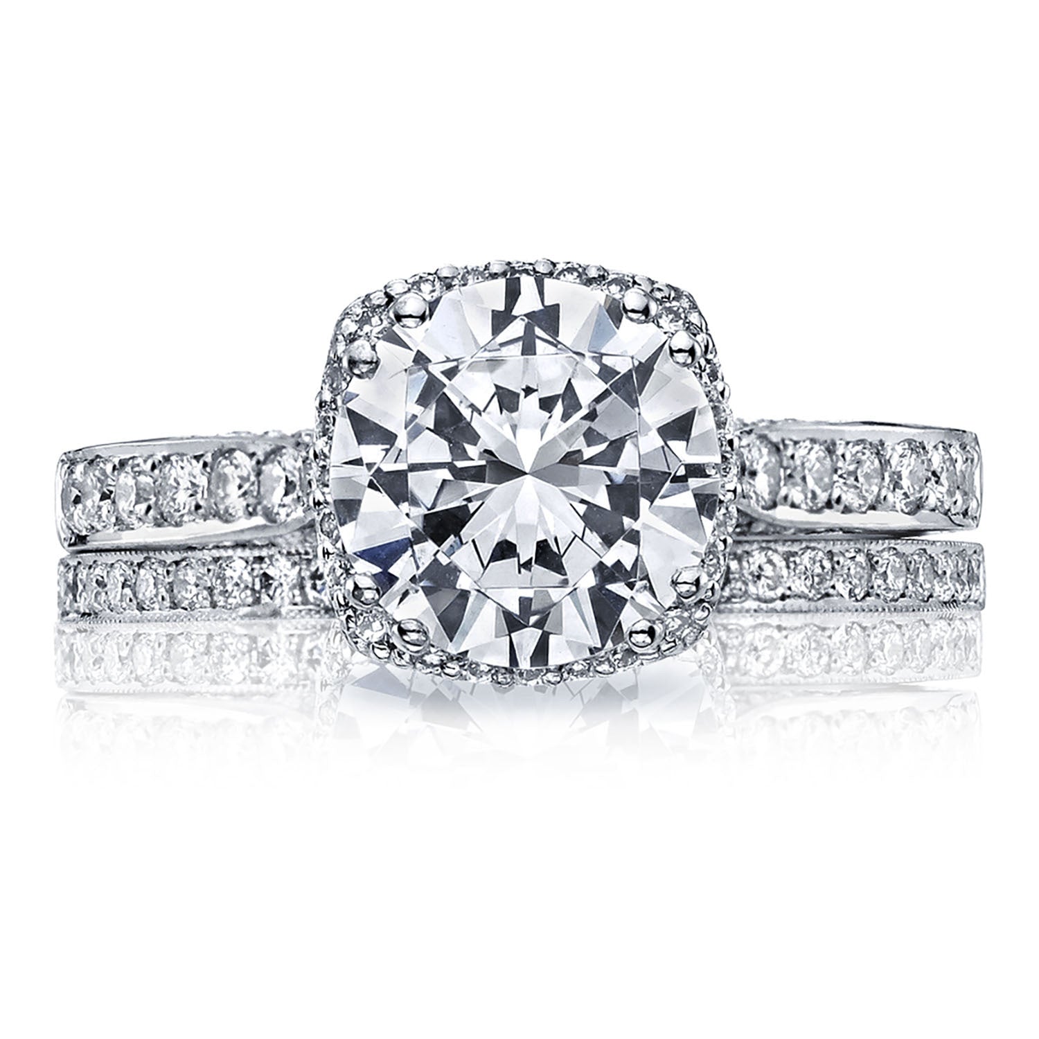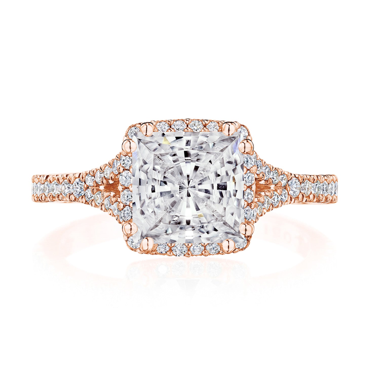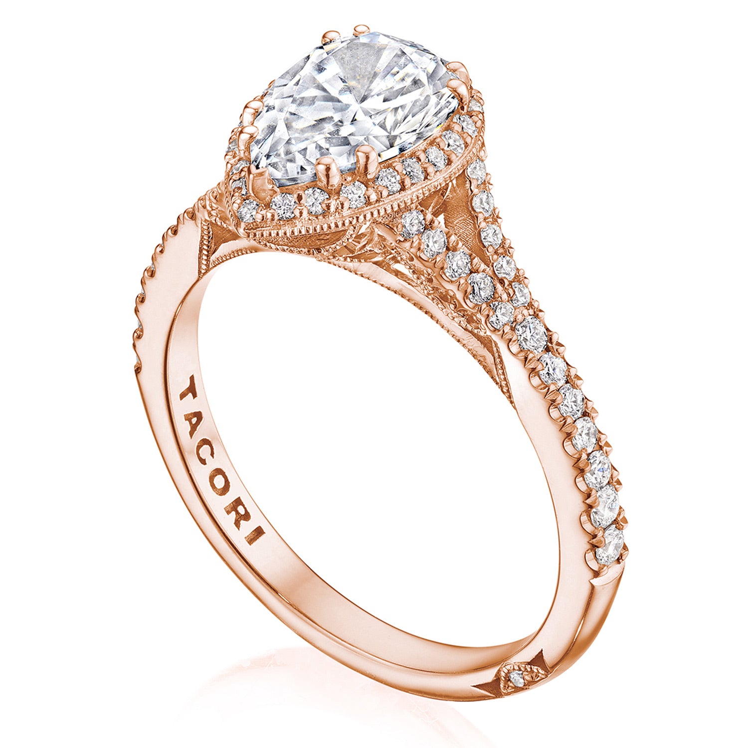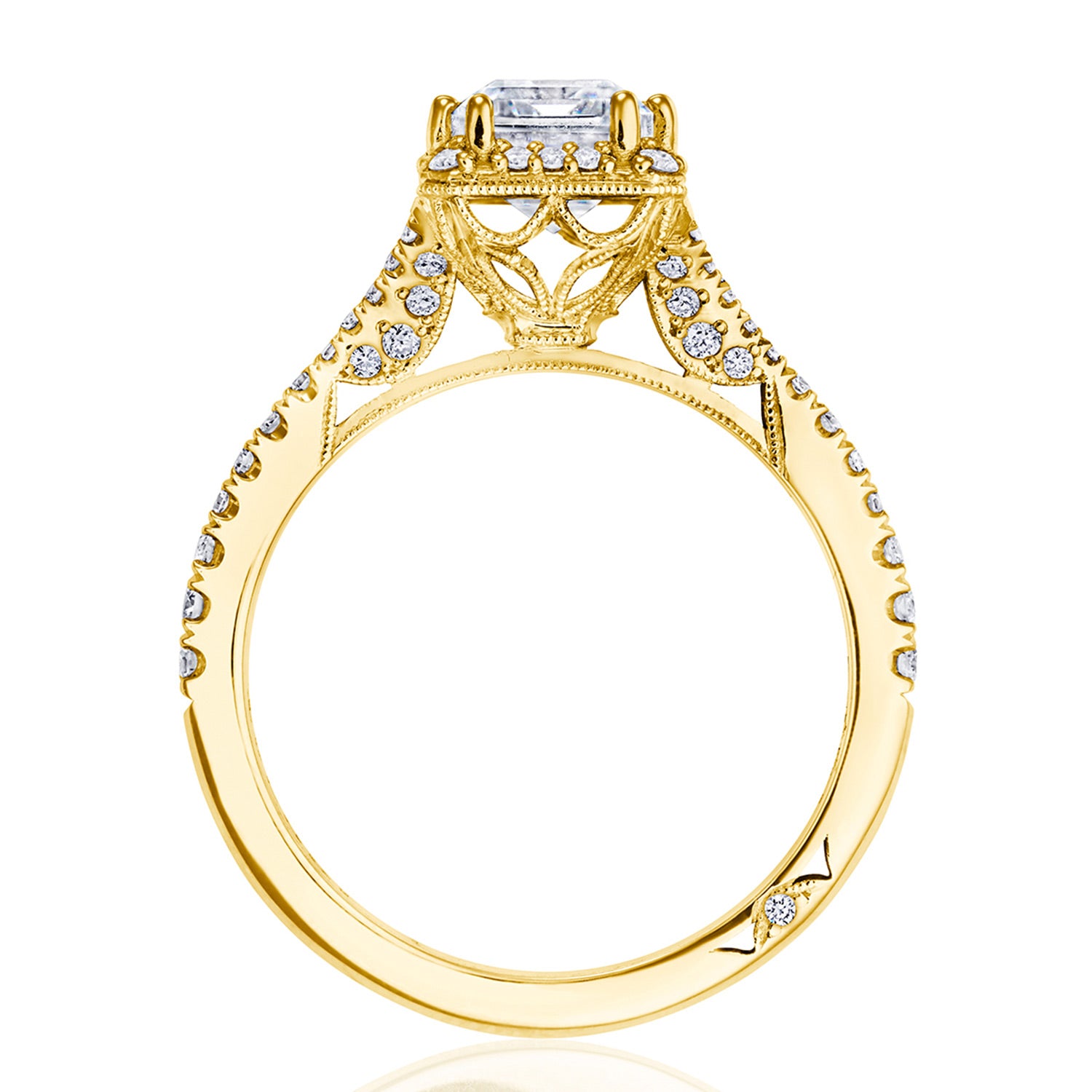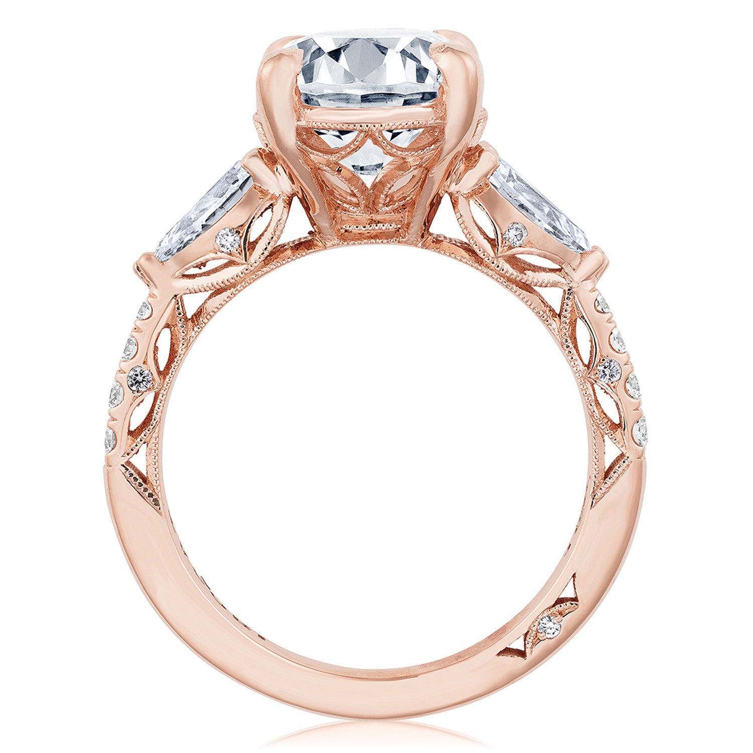 A TACORI bloom elevates the center stone, which rests on a lace-like, milgrian-studded Cathedral foundation. A pavé ceiling branches and embraces the solitaire, while a signature crescent marks the resting point of the ring.