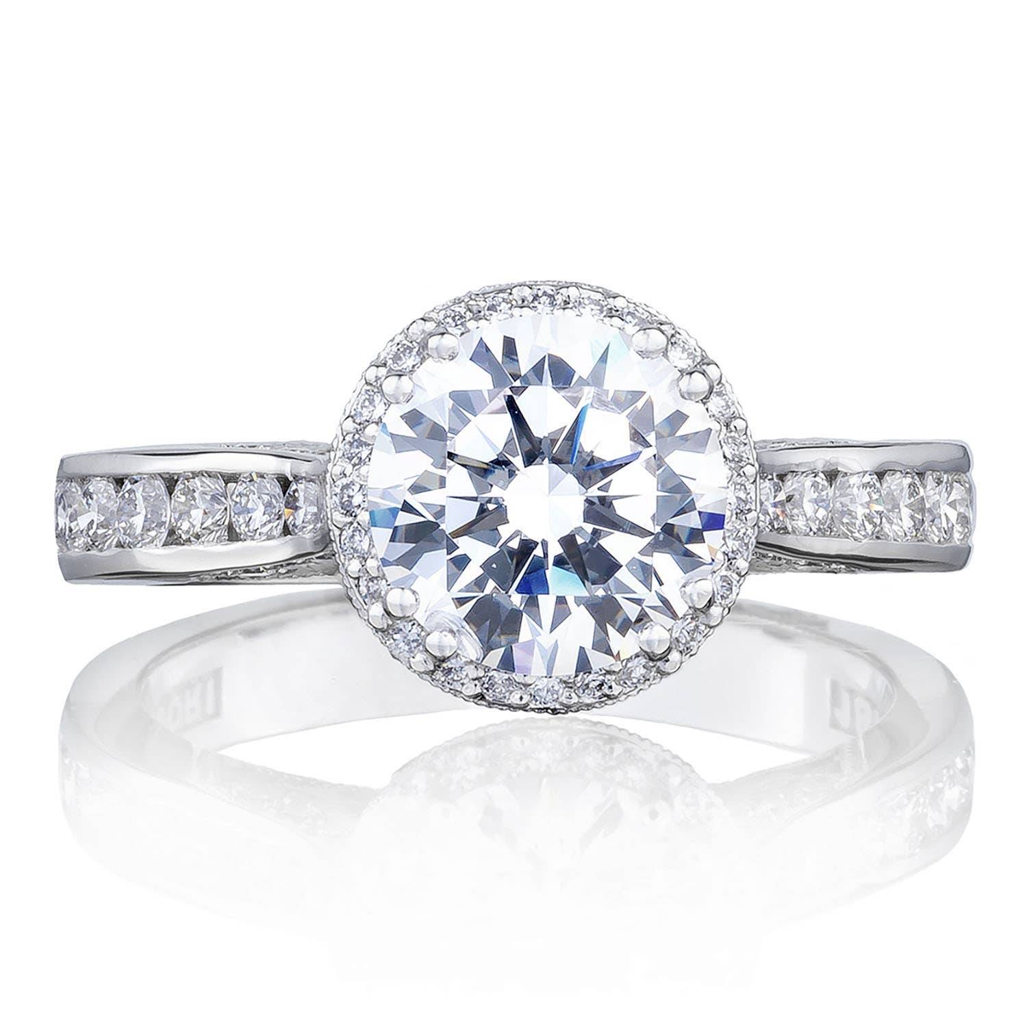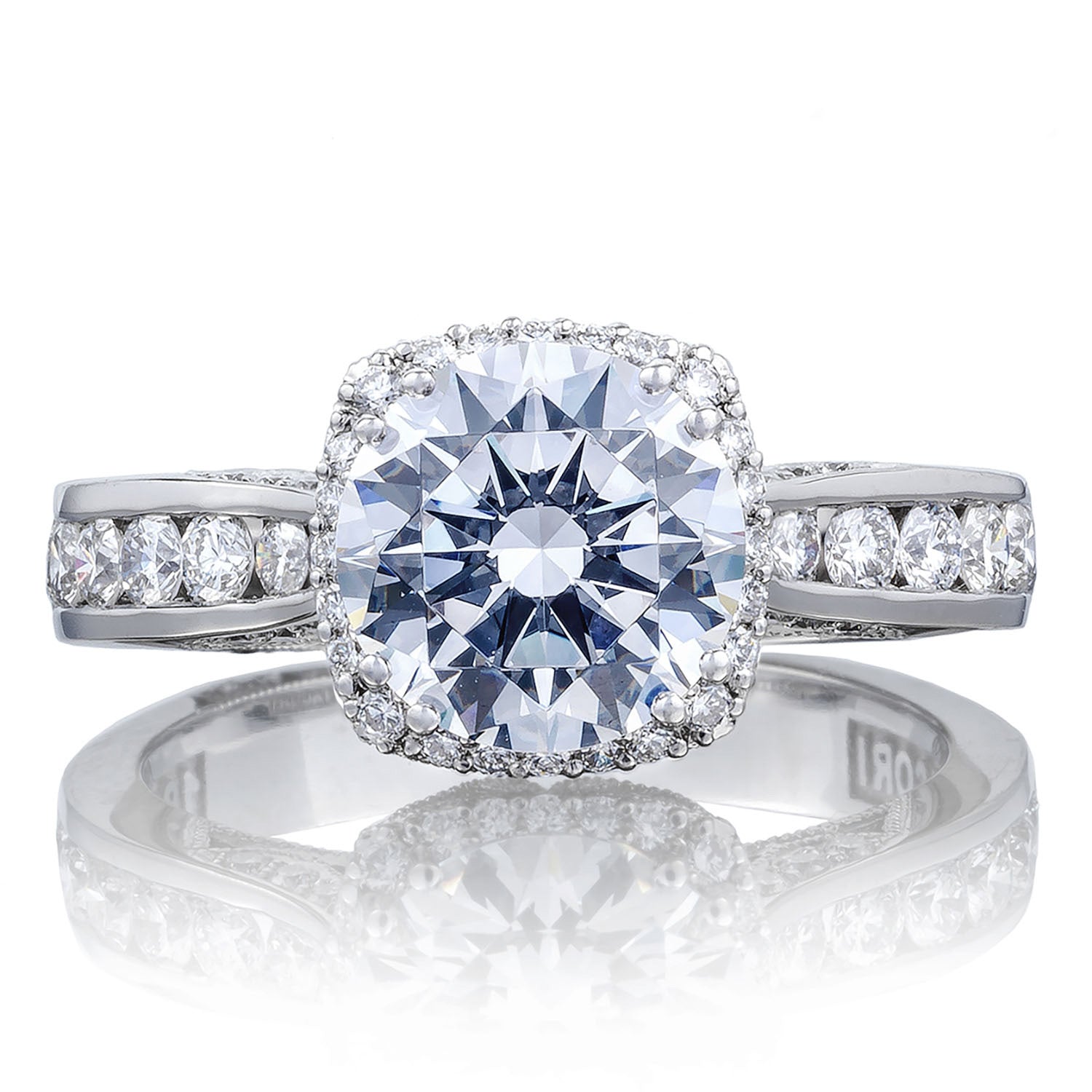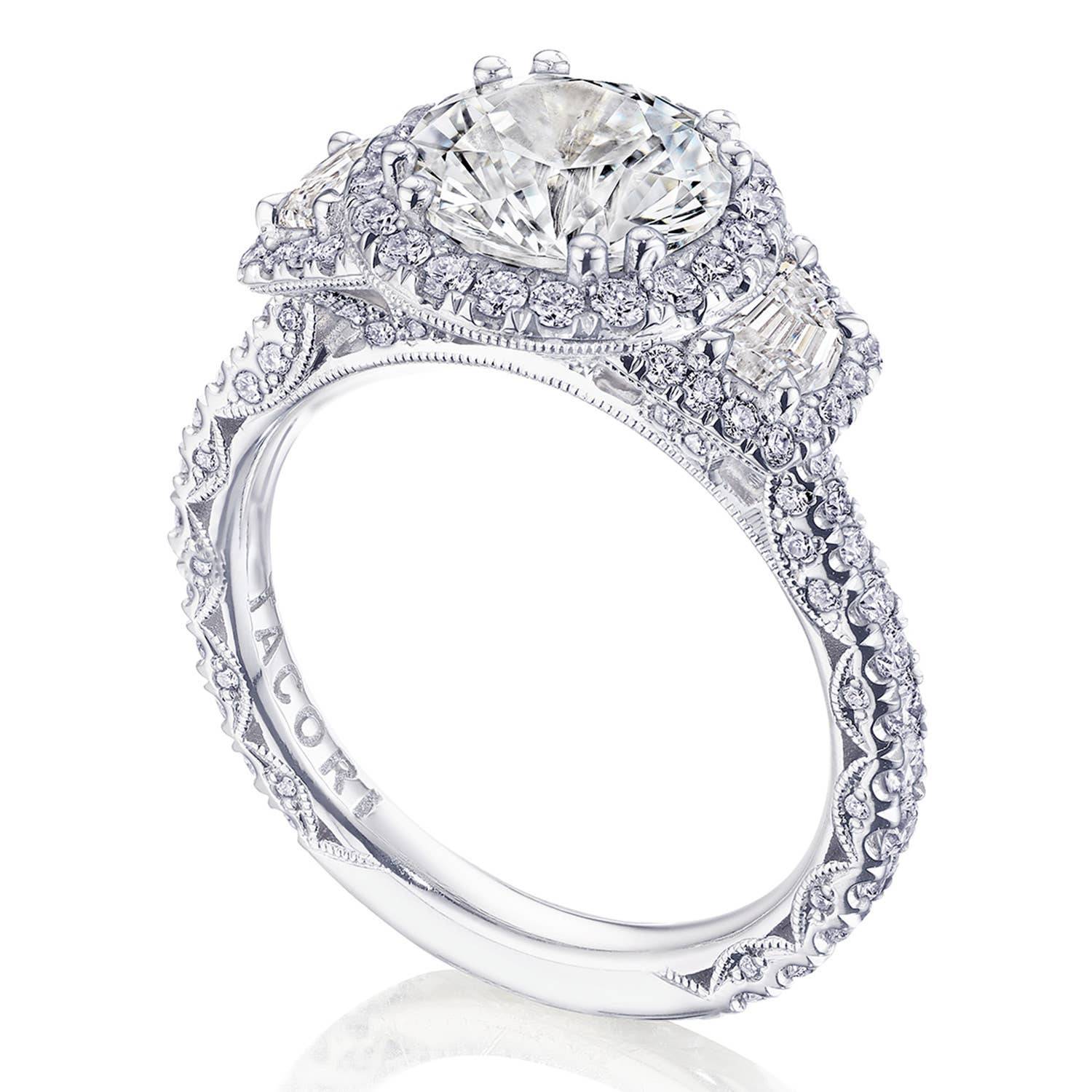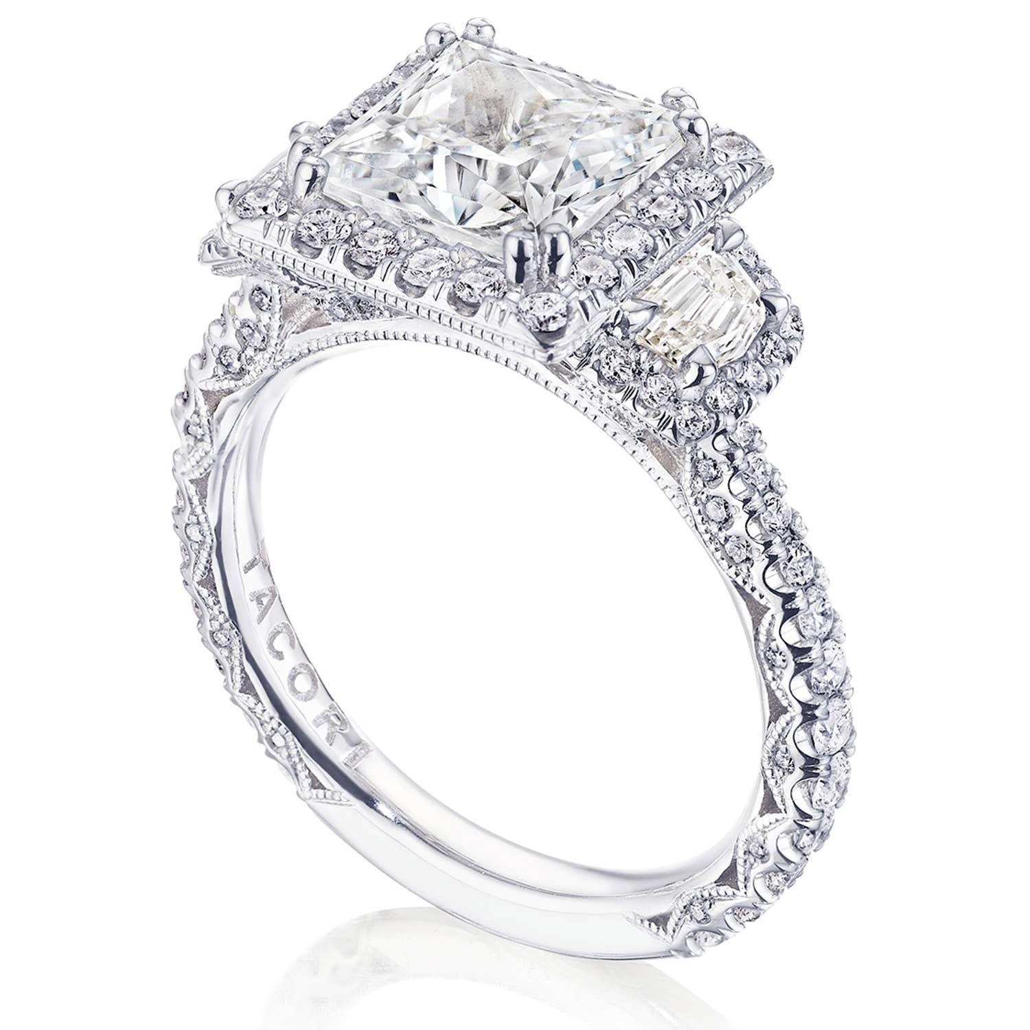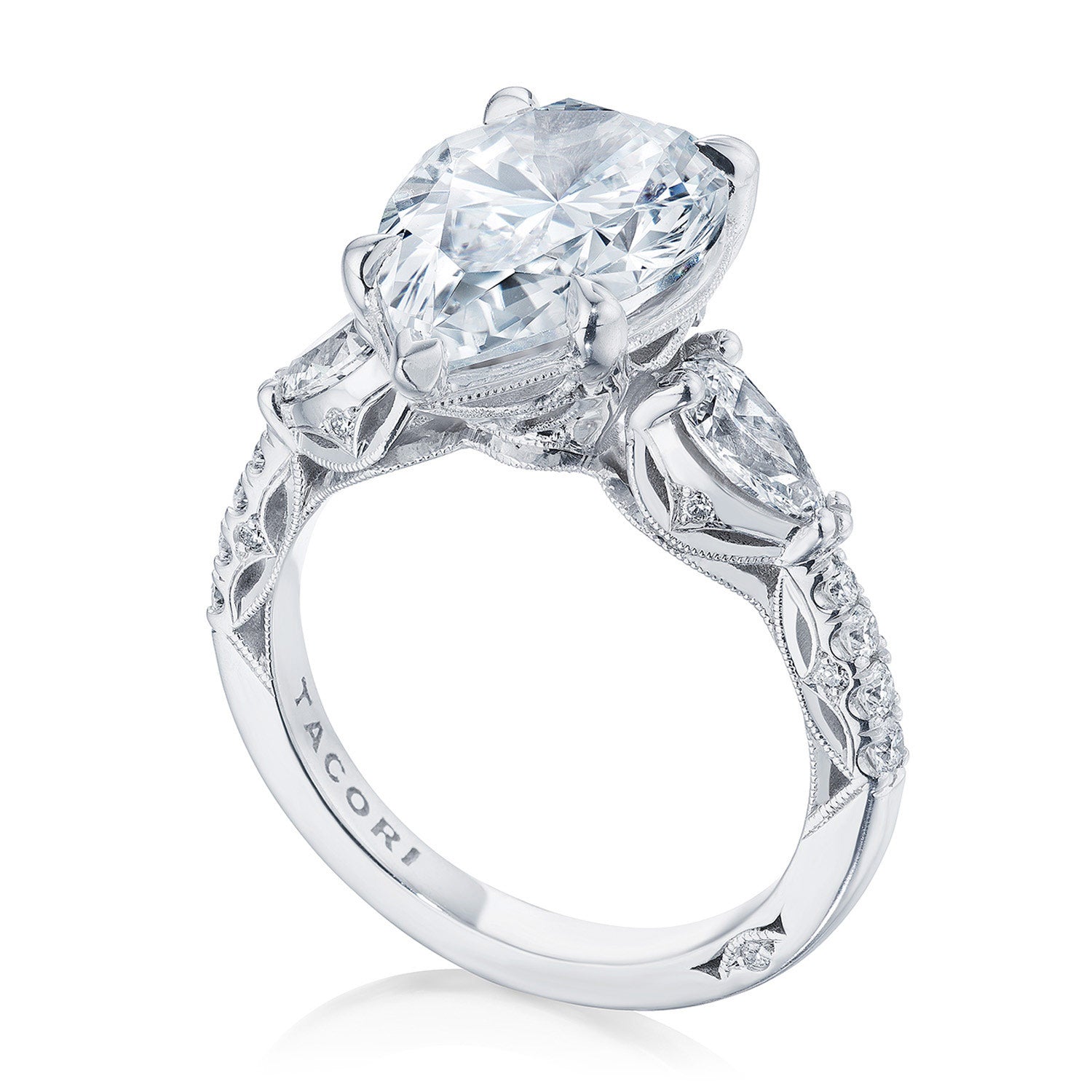 A TACORI bloom elevates the center stone, which rests on a lace-like, milgrian-studded Cathedral foundation. A pavé ceiling branches and embraces the solitaire, while a signature crescent marks the resting point of the ring.